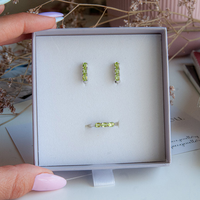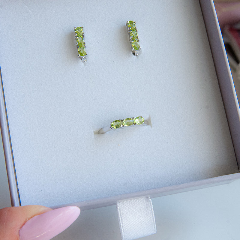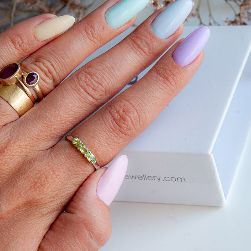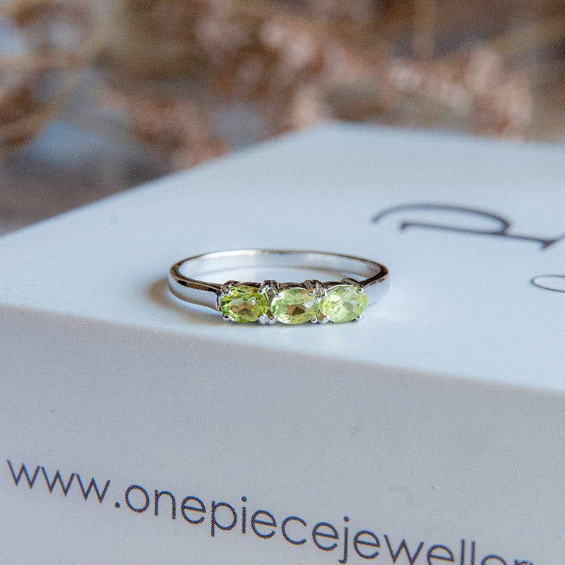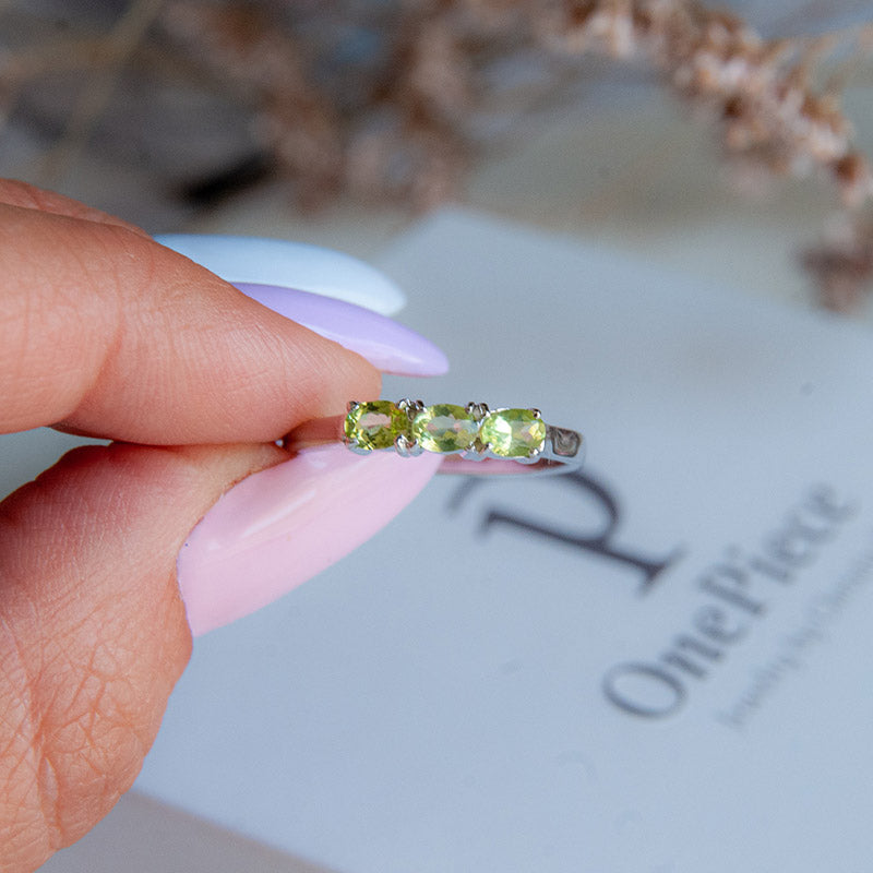 משובצת ב־3 אבני פרידוט טבעיות בגוון ירוק רך ומואר, המוסיפות לטבעת מראה רענן, נשי ואלגנטי.