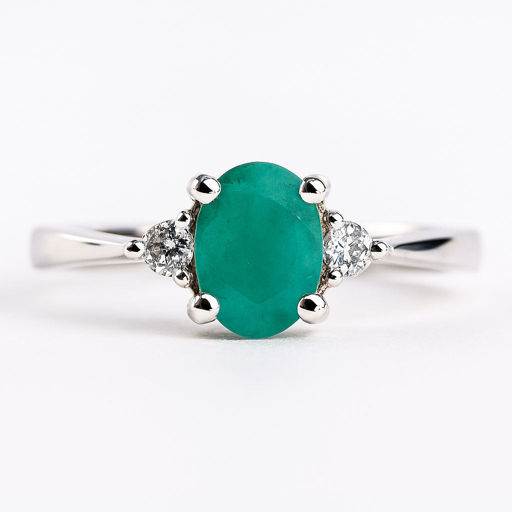 הטבעת משובצת אבן אמרלד טבעית בעלת נוכחות אלגנטית ועדינה, בשילוב שיבוץ אבני זרקון שקופות להשלמת מראה זוהר ומיוחד.