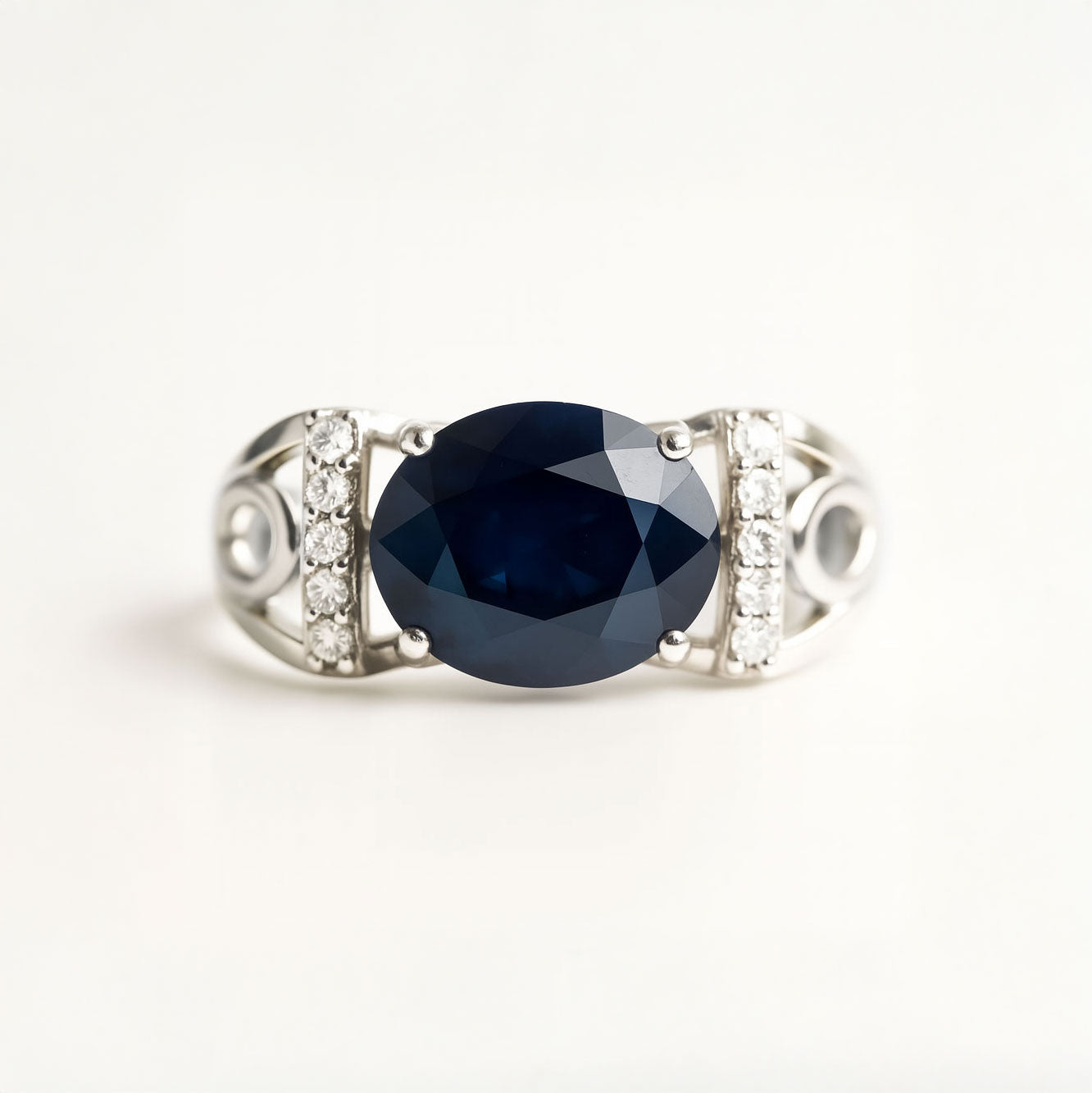 טבעת יוקרתית מכסף סטרלינג 925, נושאת אבן ספיר טבעית בגוון כחול עמוק ומסתורי, משובצת במרכז בעבודת שיבוץ קלאסית. שורת זרקונים עדינים משובצת בשני צידי האבן ומדגישה את הברק המלכותי שלה.