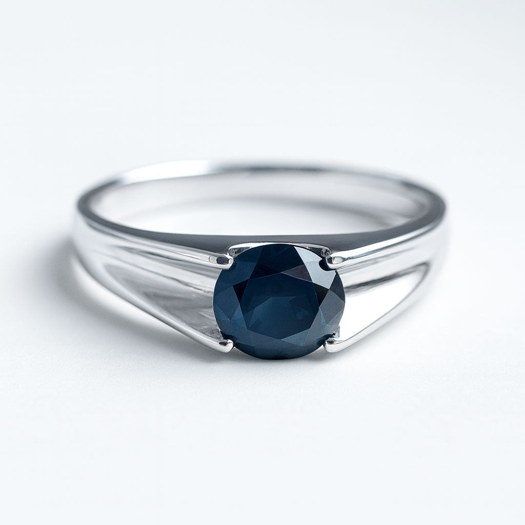 במרכז הטבעת משובצת אבן ספיר טבעית בגוון כחול עמוק, שמעניקה לה מראה ייחודי, אלגנטי ובעל נוכחות.