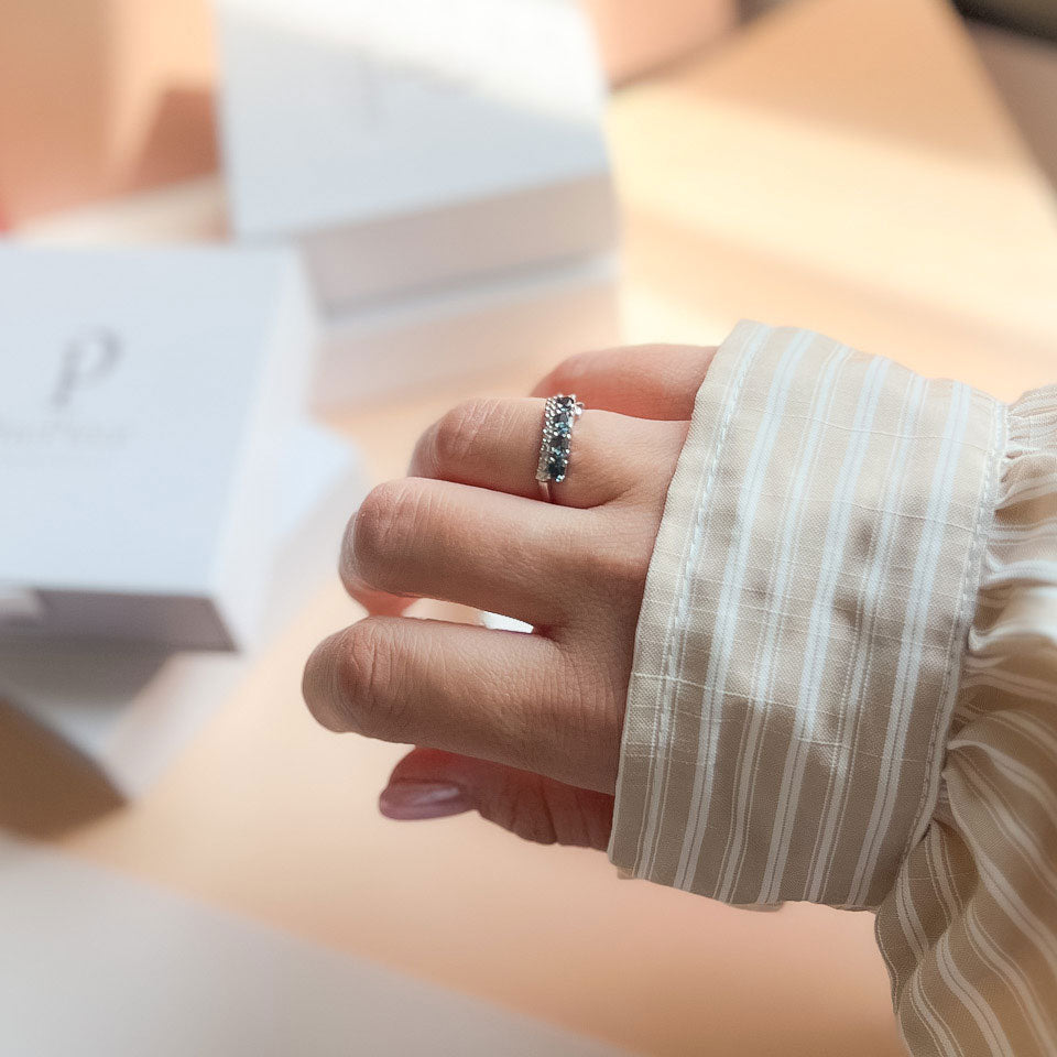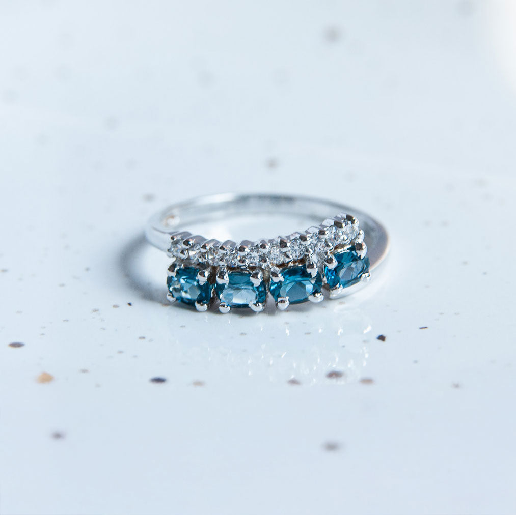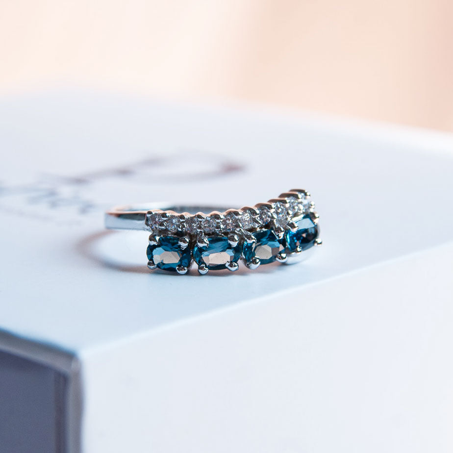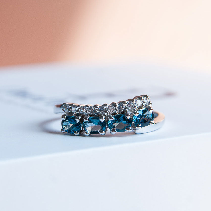 במרכזה של הטבעת משובצות אבני London Topaz טבעיות בגוון כחול עמוק ומרגיע, שמוסיפה לה מראה ייחודי ומלא עומק. ושילוב של אבני זרקון.
