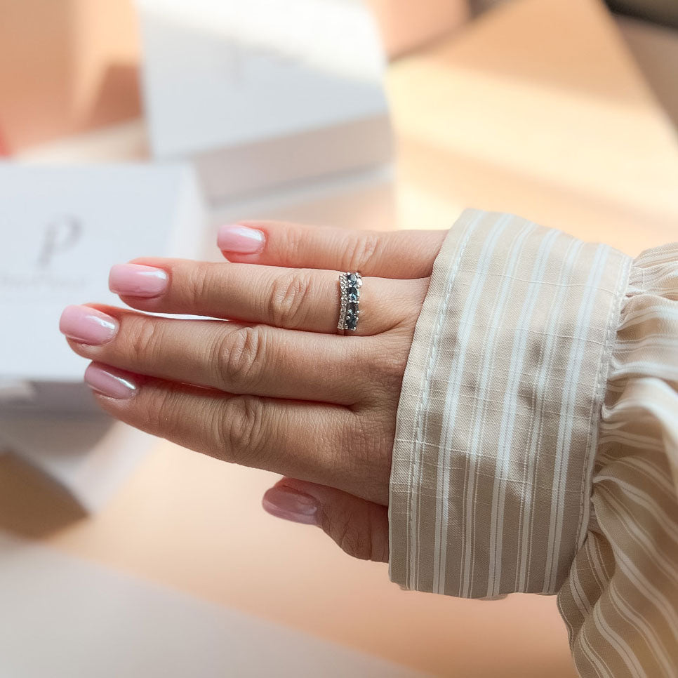 טבעת עדינה ובעלת נוכחות מרשימה, עשויה מכסף טהור 925 בציפוי רודיום. הציפוי ברודיום איכותי מעניק לטבעת עמידות גבוהה במיוחד מפני התחמצנות, שומר על הברק היוקרתי שלה לאורך זמן – וללא חשש מהשחרה או שינוי צבע.