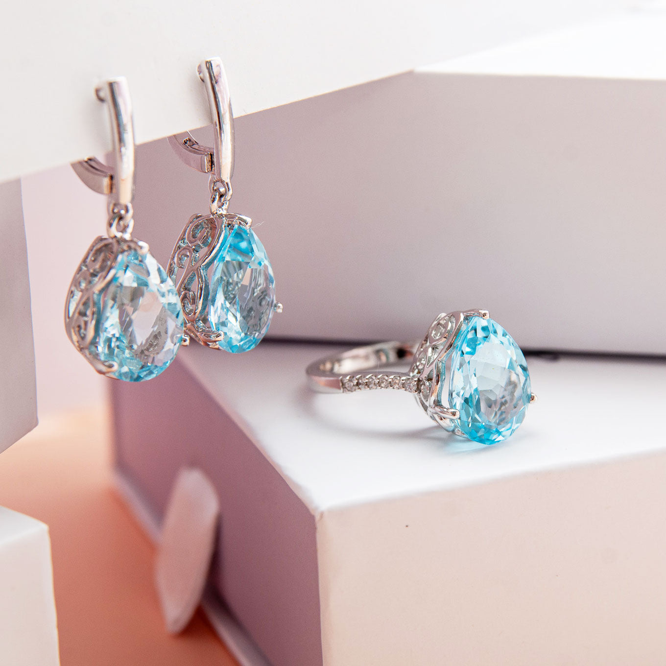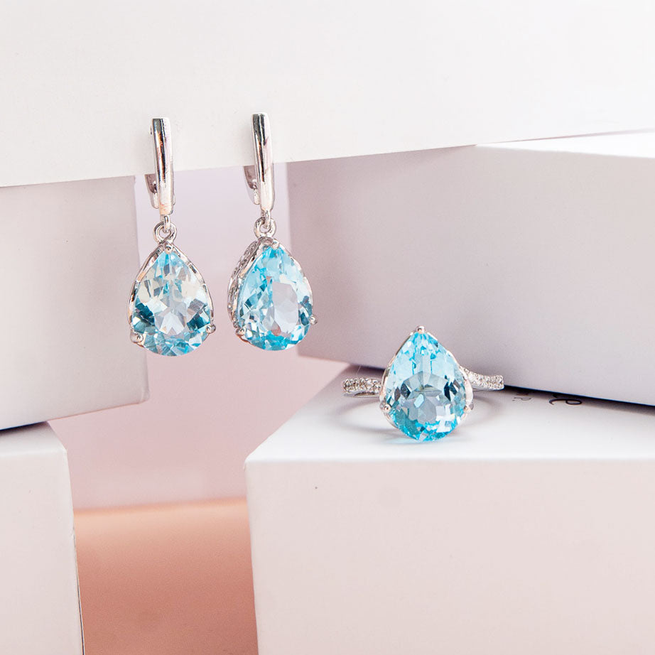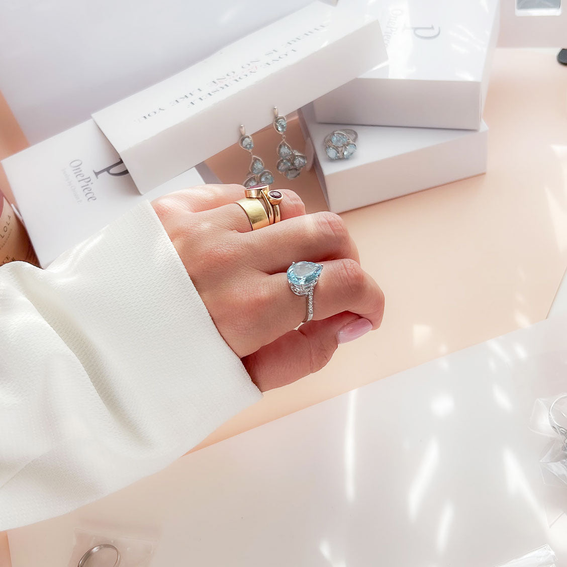משובצת ב־אבן בלו טופז טבעית בצורת טיפה בגוון תכלת בהיר וזוהר, שמעניקה לטבעת מראה נקי, יוקרתי ונשי במיוחד.
