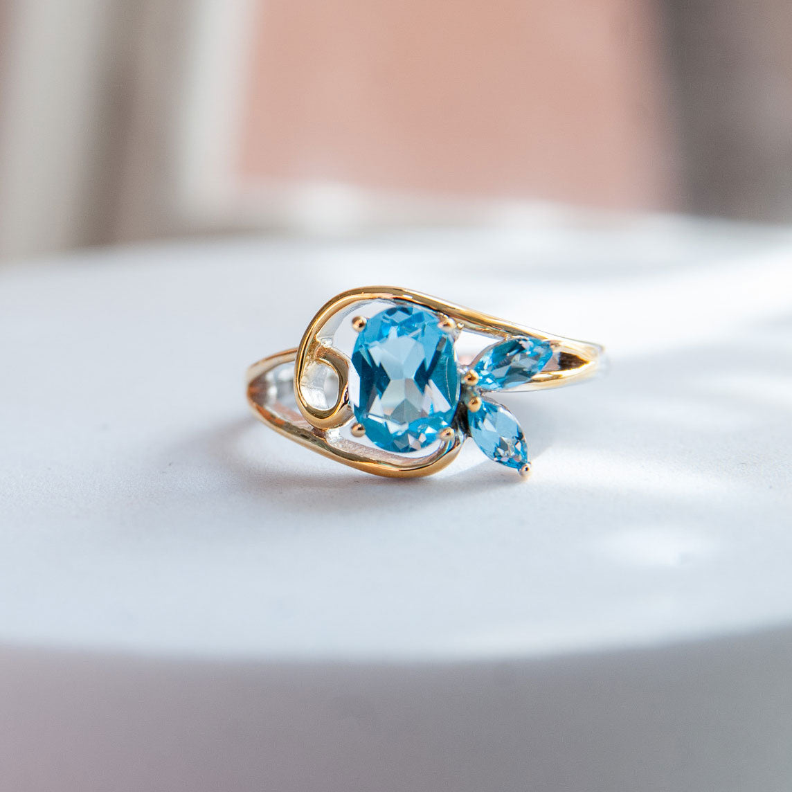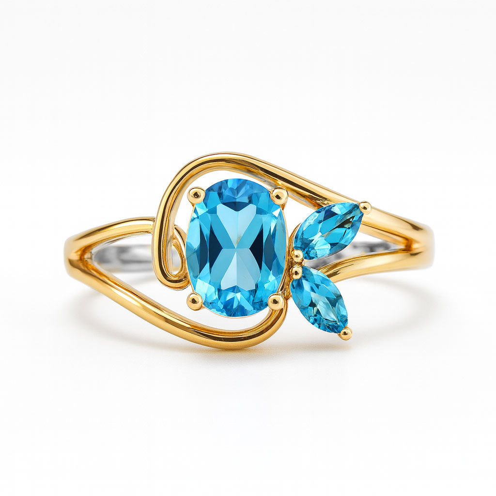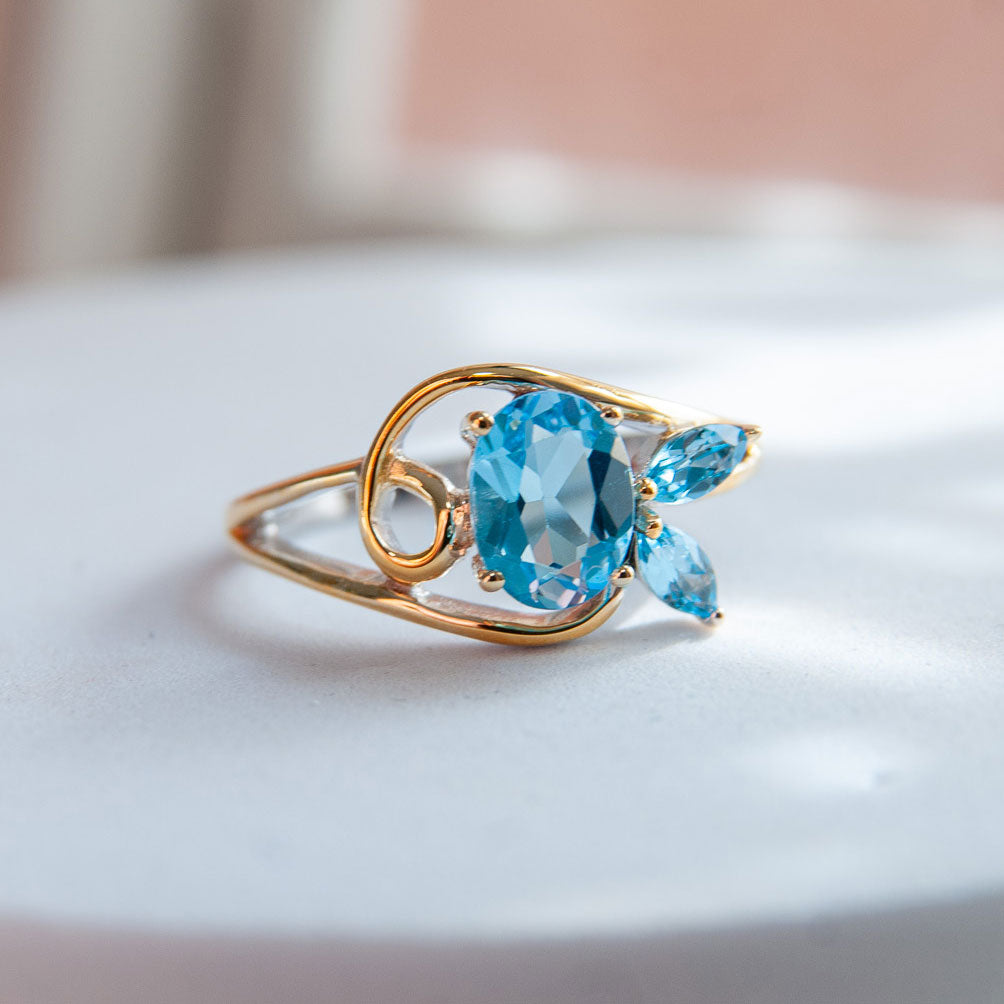 טבעת כסף סטרלינג 925 ייחודית, בציפוי זהב חלקי ( בחלק העליון של הטבעת) בעיצוב נשי ומעודן. במרכזה שיבוץ אבן בלו טופז אובלית בגוון כחול-שמיים מרהיב, ולצידה שתי אבנים בחיתוך עלה – יוצרות מראה טבעי וזורם של עלים עדינים שמלטפים את האצבע.