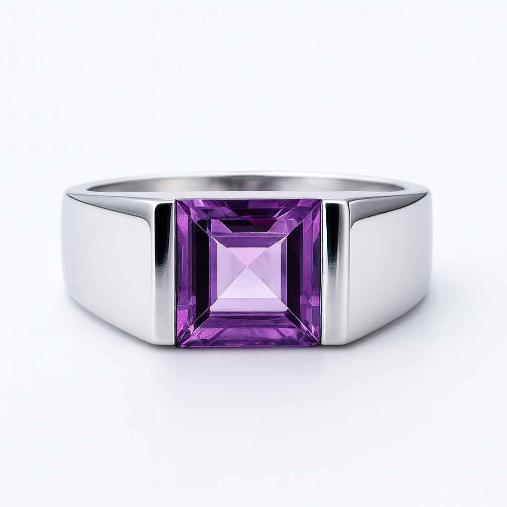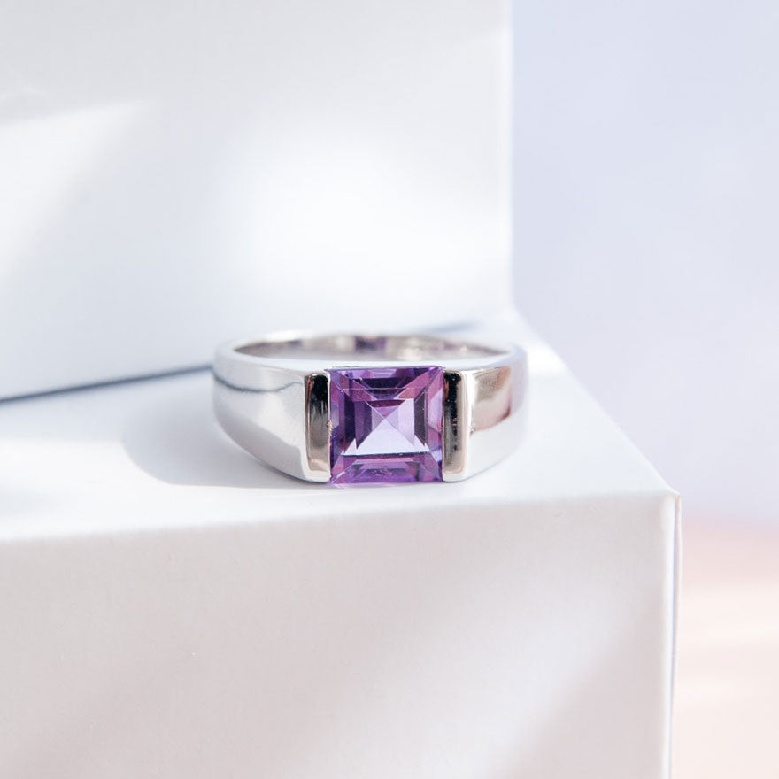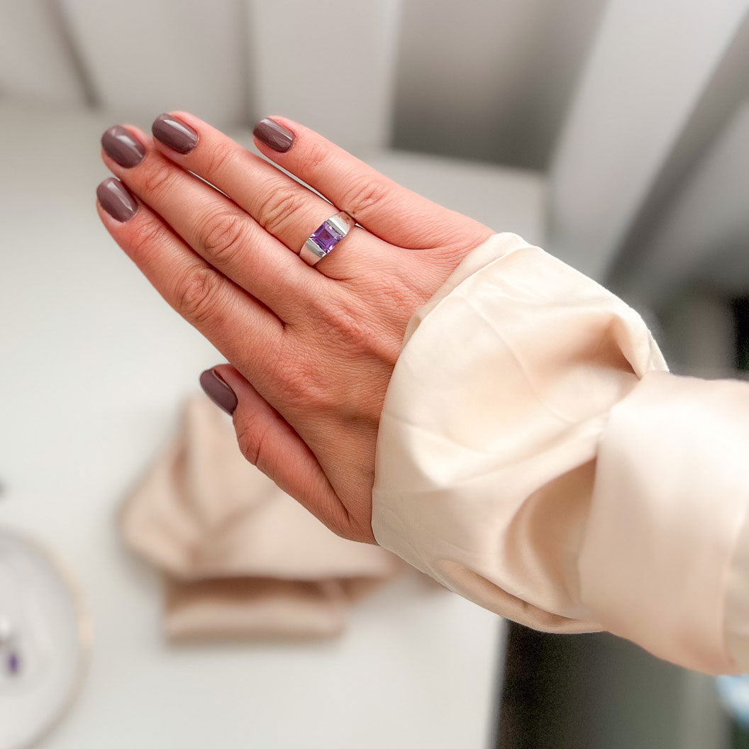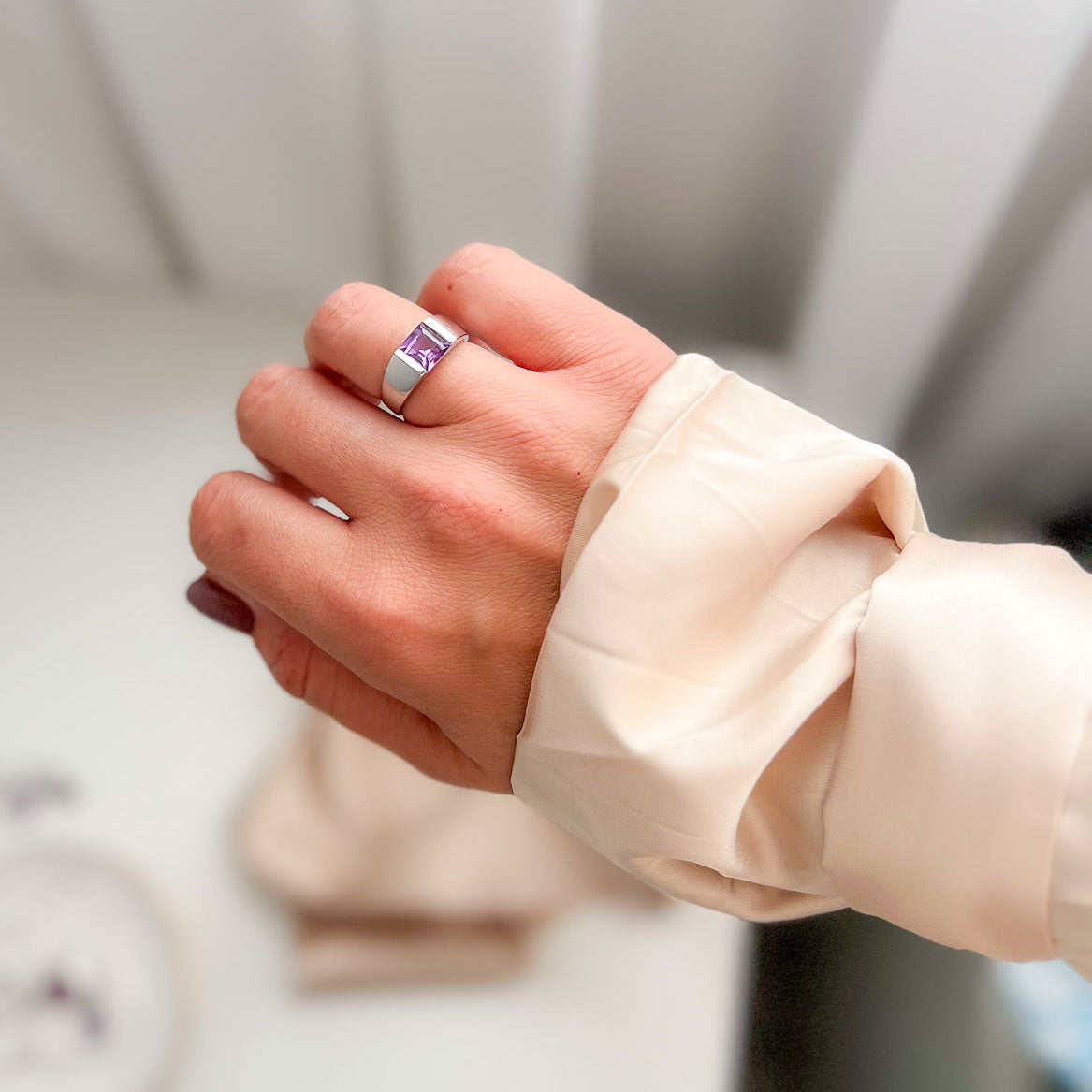 במרכז הטבעת משובצת אבן אמטיסט טבעית, בגוון סגלגל עדין ומלא עומק, המשדר יוקרה ונשיות עוצמתית.