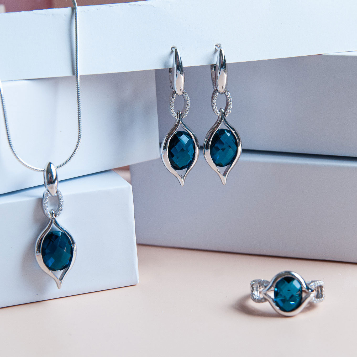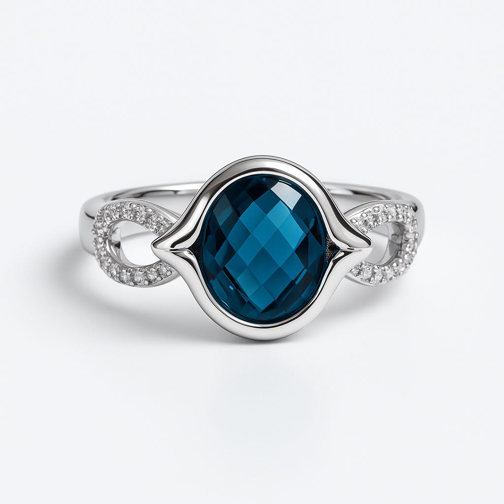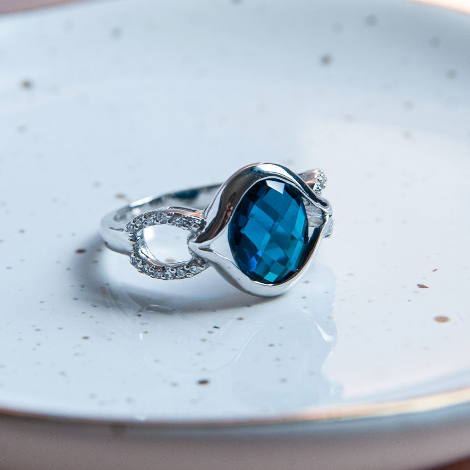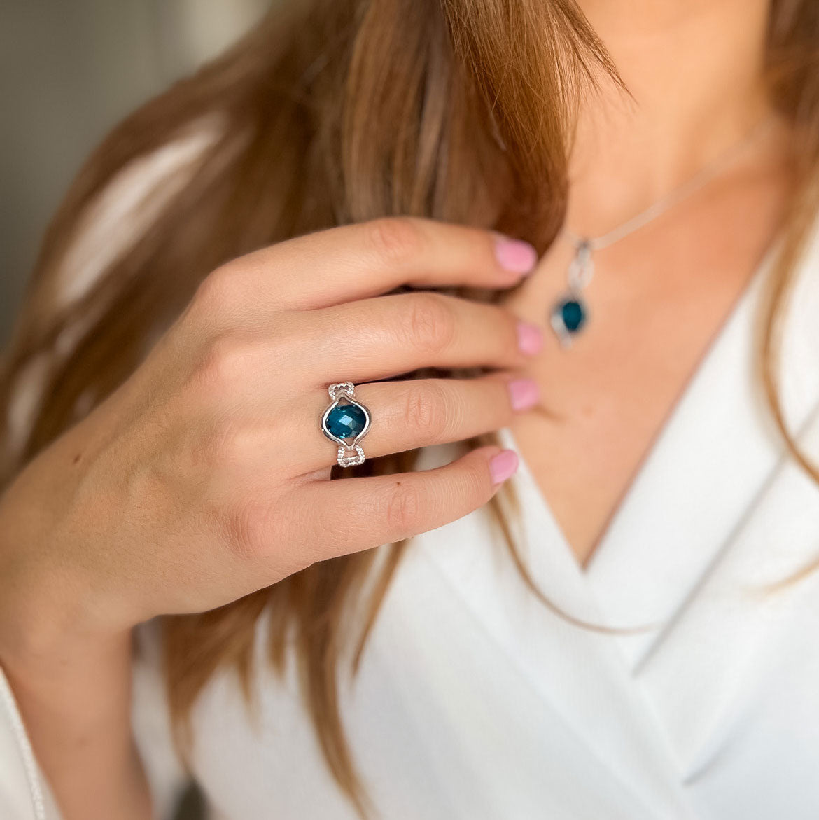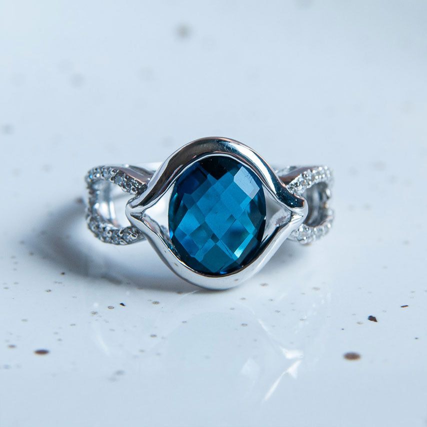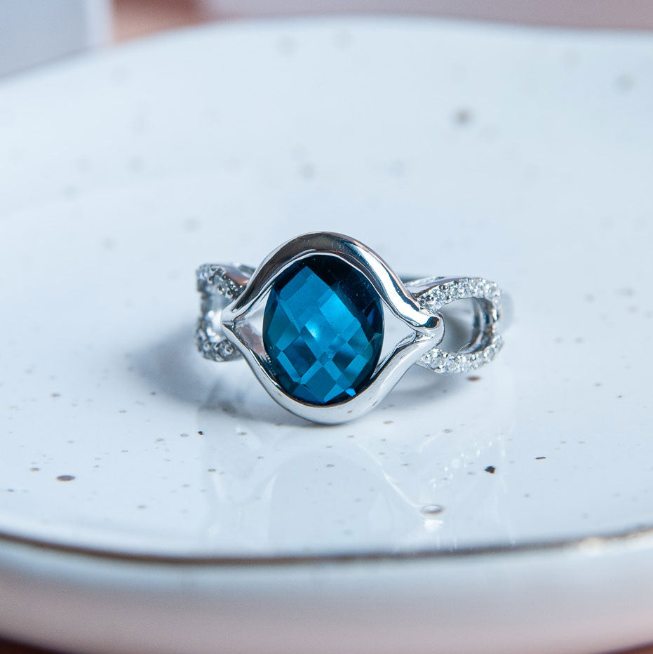 במרכזה משובצת אבן Natural London Quartz (Duplex) בגוון כחול רווי ועמוק, מוקפת בשיבוץ עדין של אבני זירקון המוסיפות אור וניצוץ ייחודי.