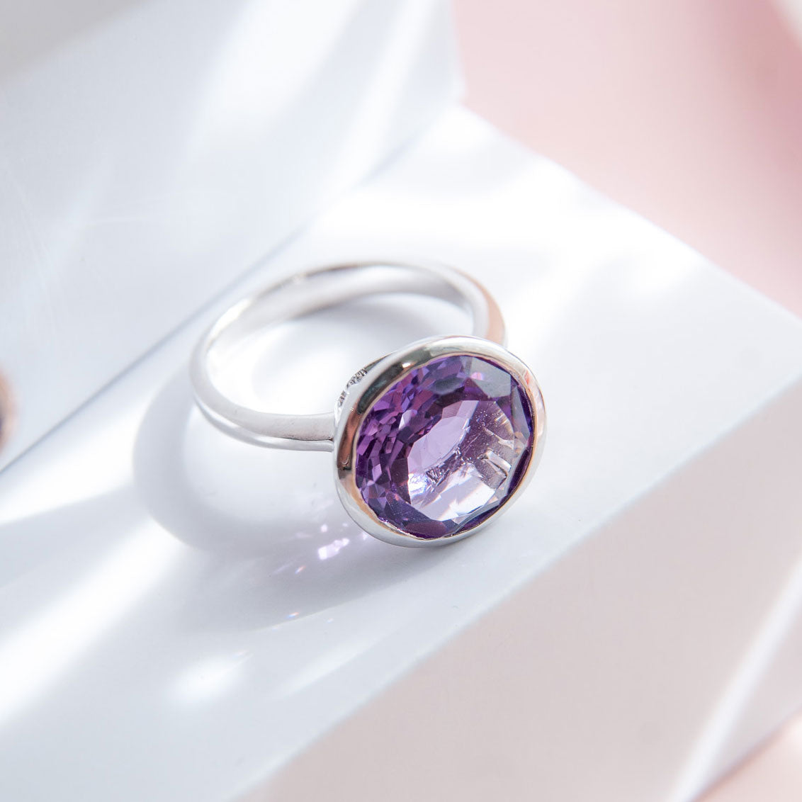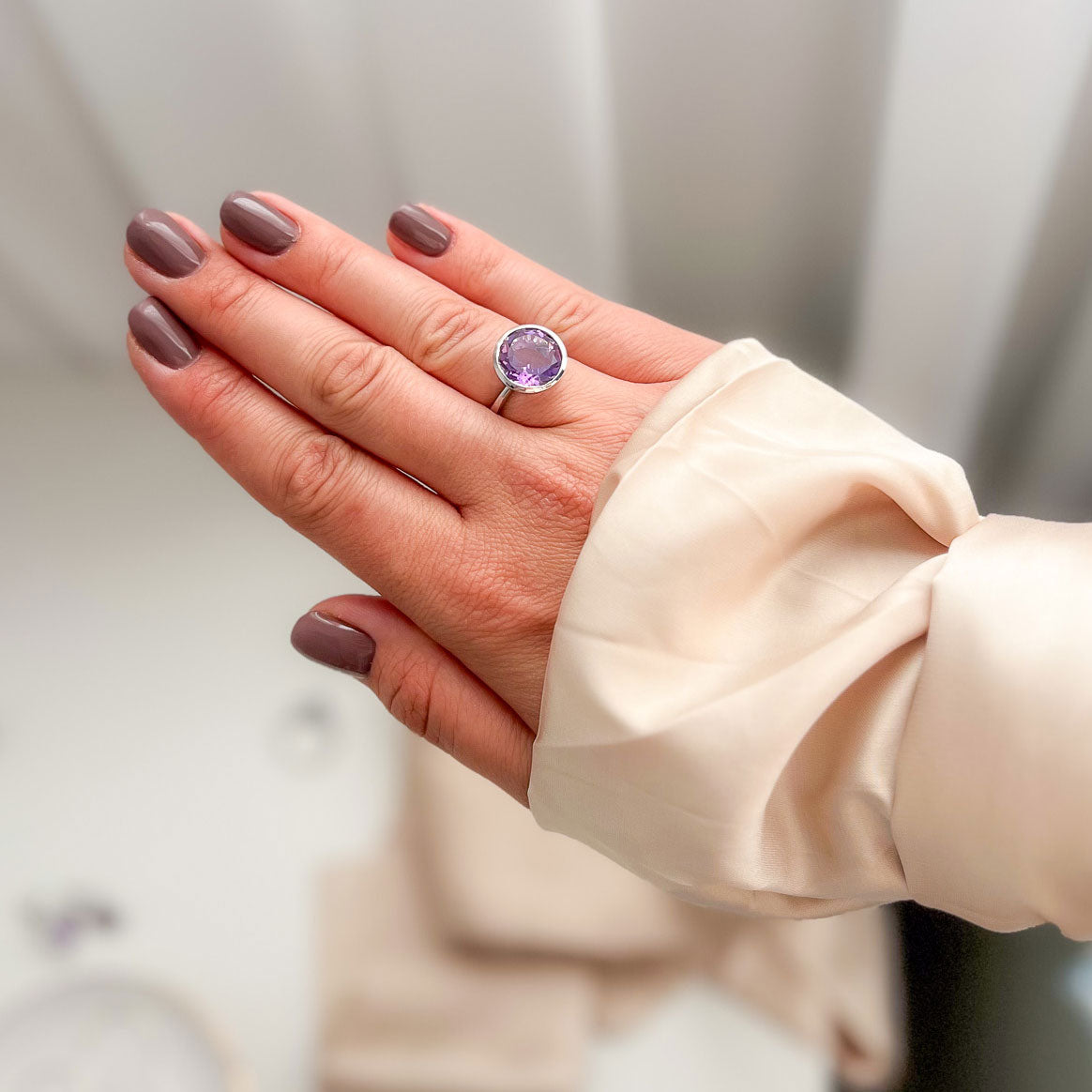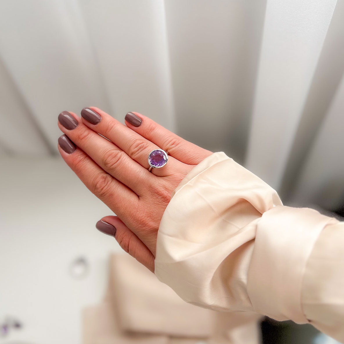 במרכז הטבעת משובצת אבן אמטיסט טבעית, בגוון סגלגל עדין ומלא עומק, המשדר יוקרה ונשיות עוצמתית.