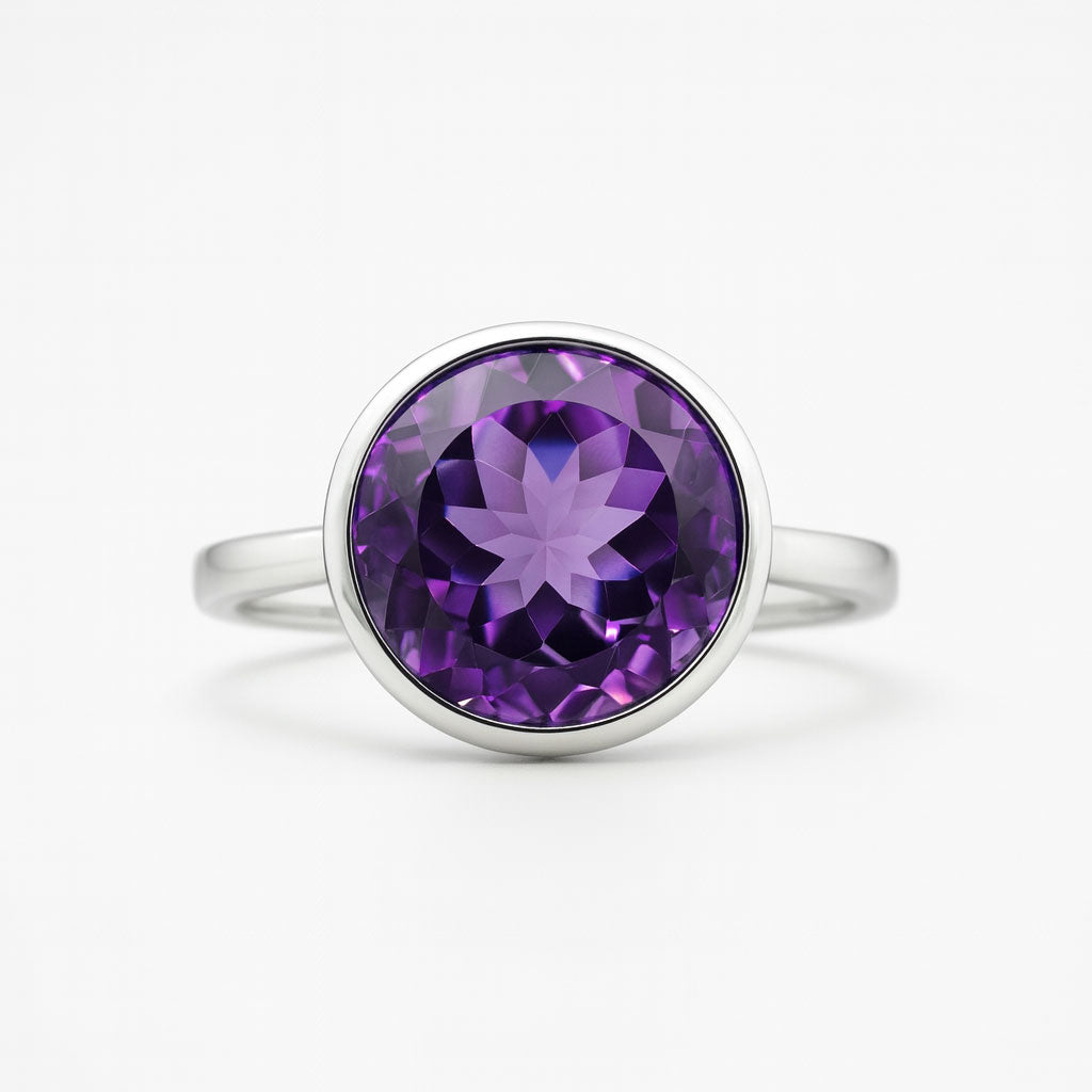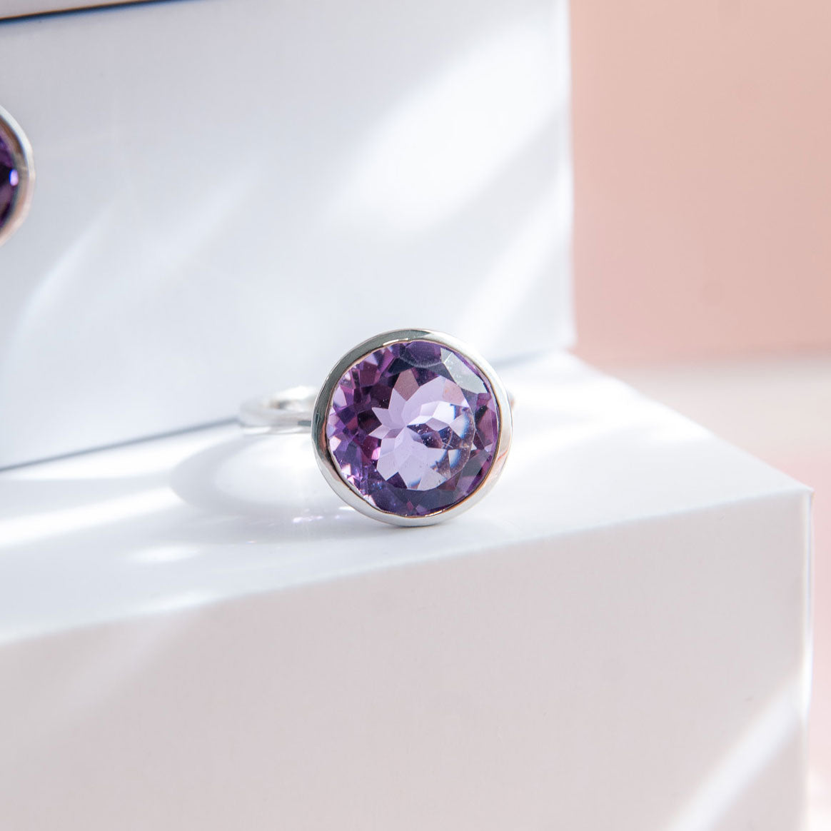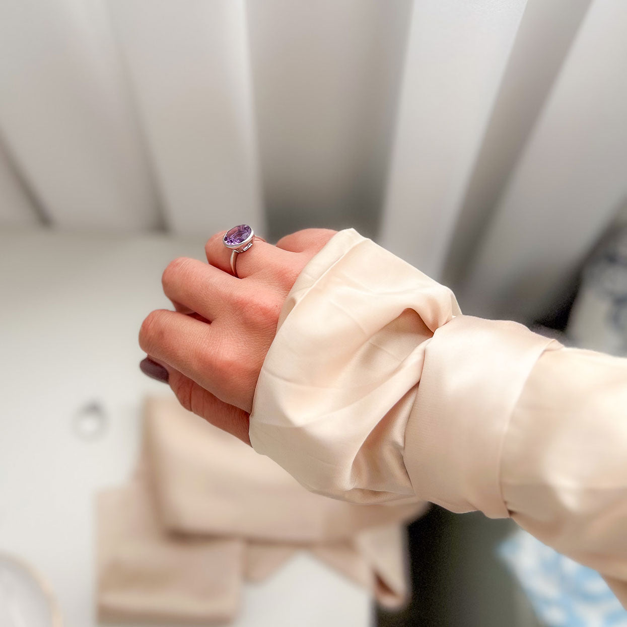 במרכז הטבעת משובצת אבן אמטיסט טבעית, בגוון סגלגל עדין ומלא עומק, המשדר יוקרה ונשיות עוצמתית.