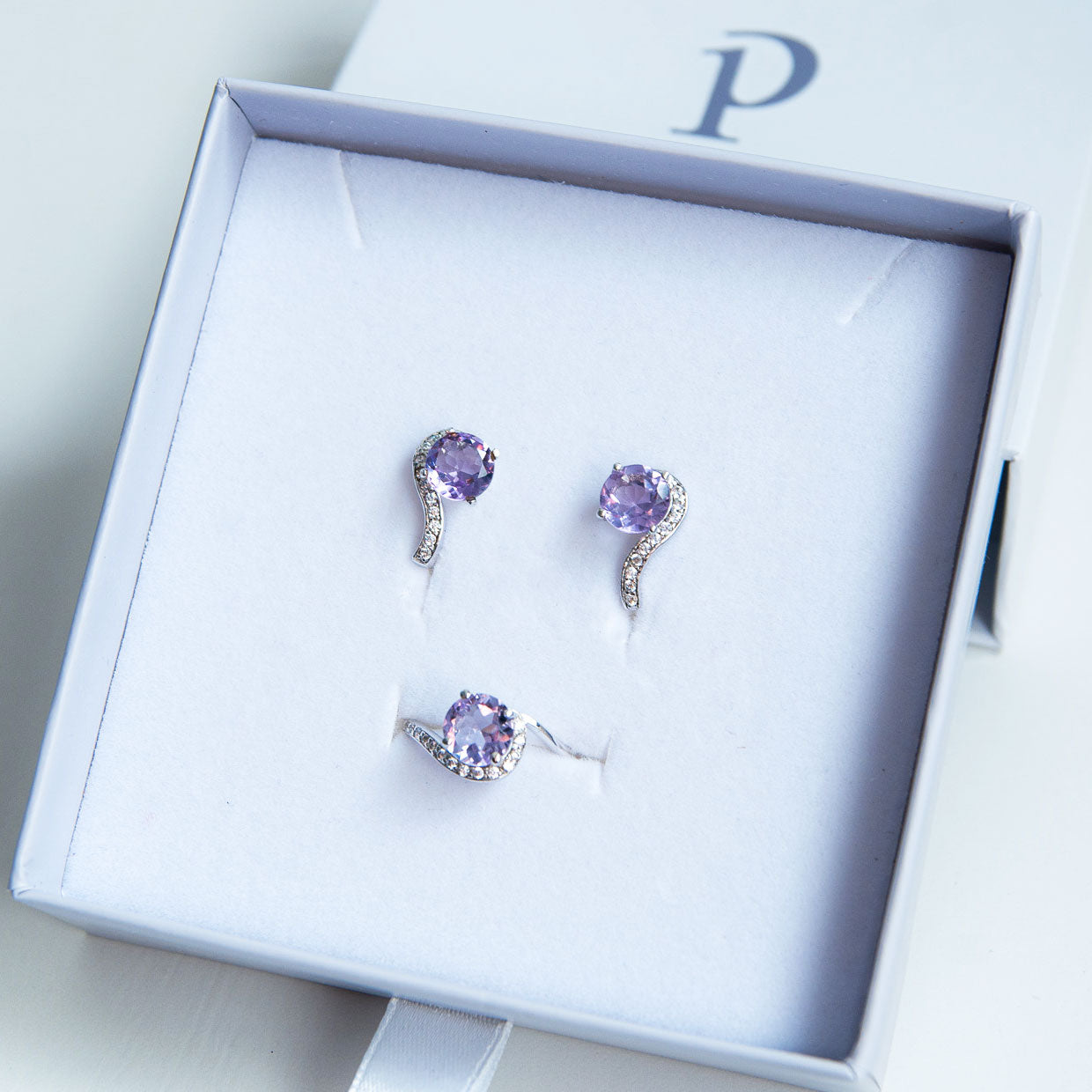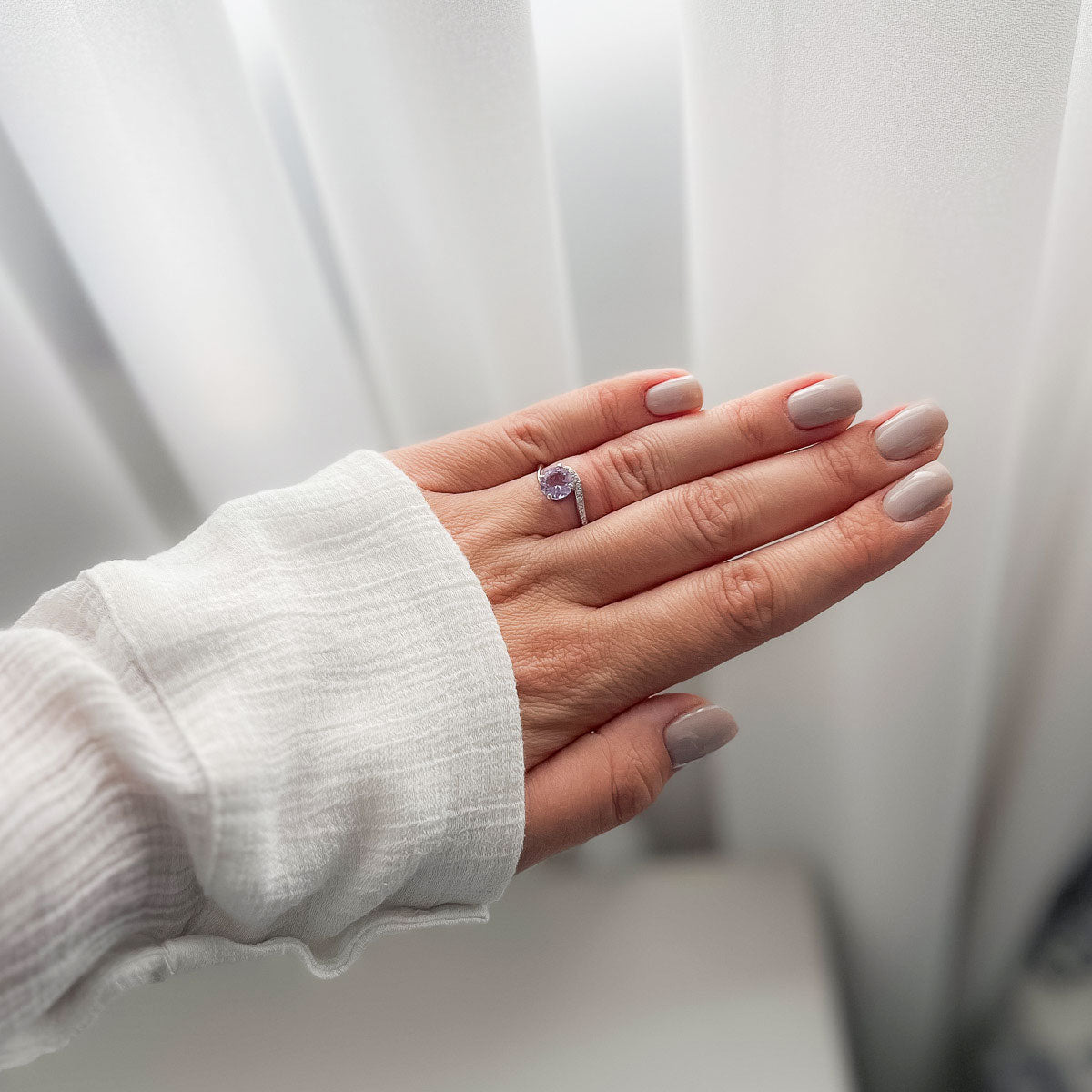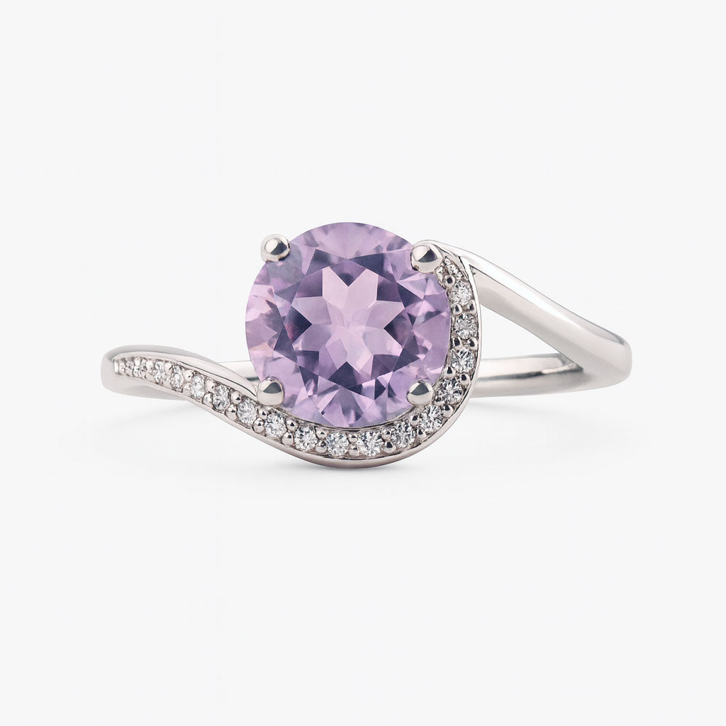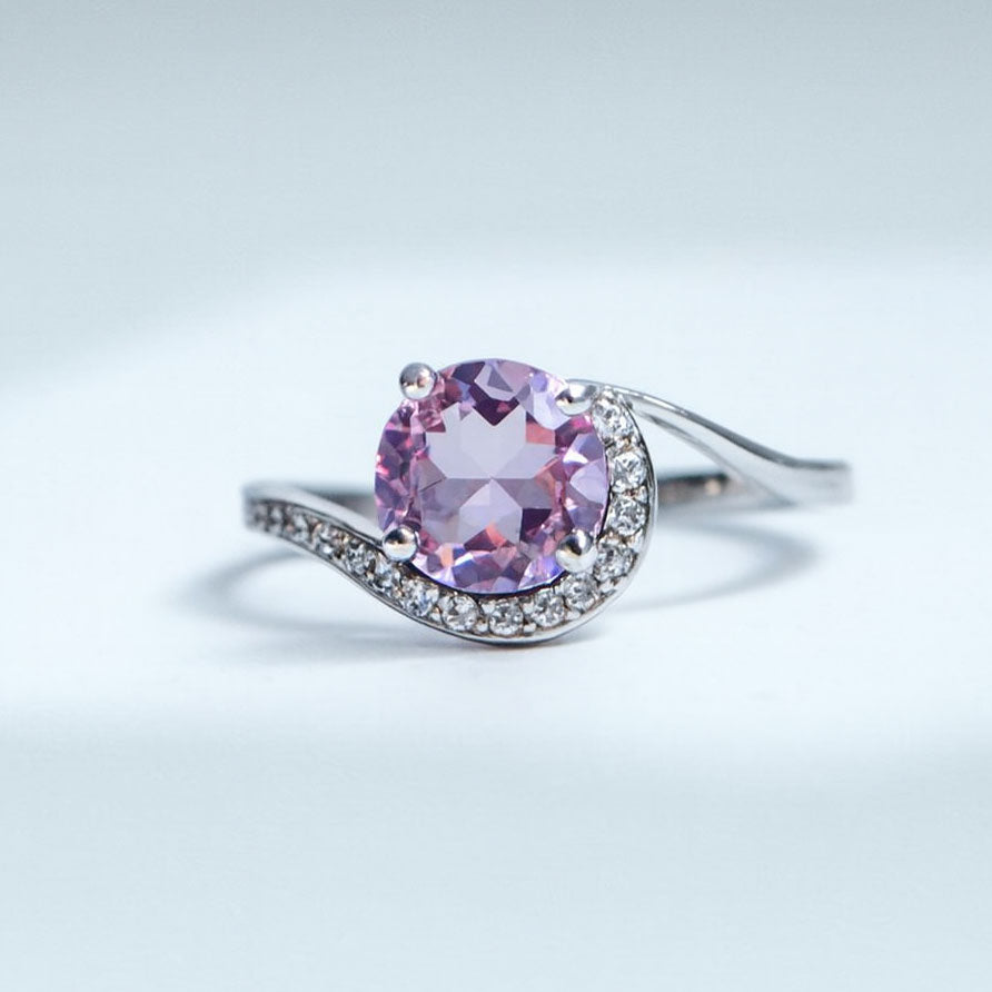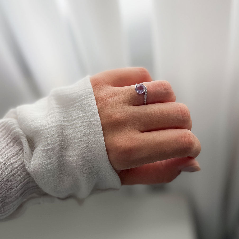 במרכז הטבעת משובצת אבן אמטיסט טבעית, בגוון סגלגל עדין ומלא עומק, המשדר יוקרה ונשיות עוצמתית ושילוב אבני זרקון מסביב.