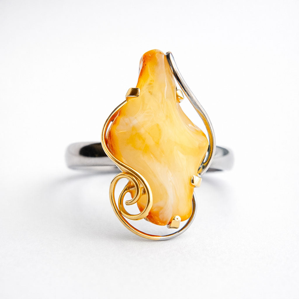 במרכז הטבעת משובץ ענבר בלטי טבעי בגוון צהוב, בעל ברק טבעי וזוהר רך המעניקים לתכשיט נוכחות אלגנטית וייחודית.