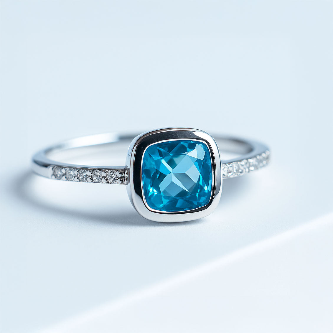 במרכז הטבעת משובצת אבן בלו טופז טבעית בגוון כחול מהפנט, ומסביבה אבני זרקון נוצצות שמוסיפות אור וזוהר ייחודי.