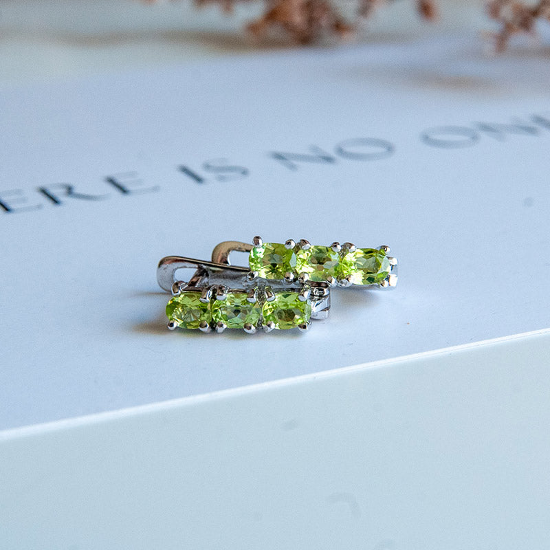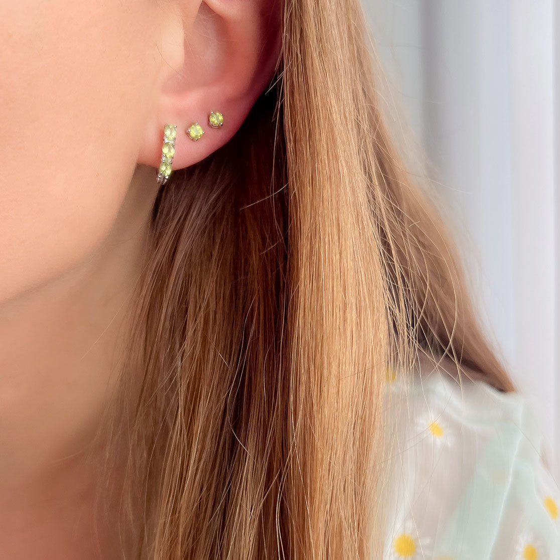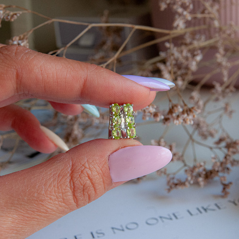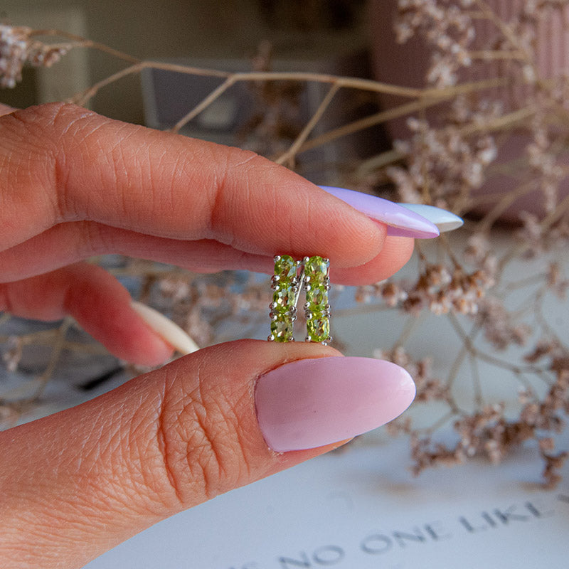 בכל עגיל משובצות 3 אבני פרידוט טבעיות בגוון ירוק רענן, המוסיפות מגע של אור, רכות ואנרגיה חיובית לכל מראה.