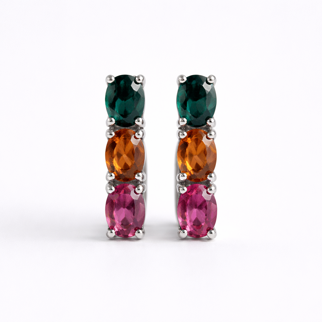 העגילים משובצים ב־3 אבני טורמלין טבעיות וצבעוניות, כל אחת בעלת גוון ייחודי וניצוץ אחר, ליצירת מראה חי, נשי והרמוני.