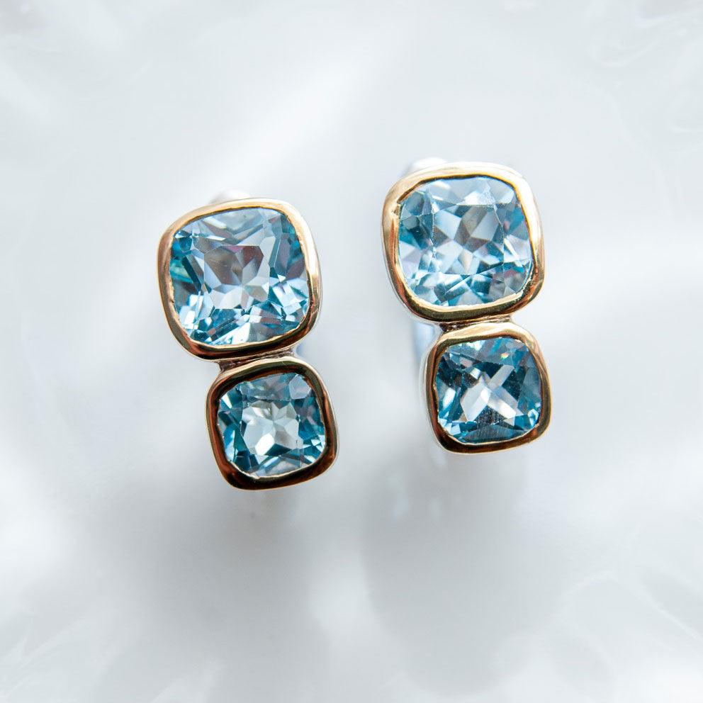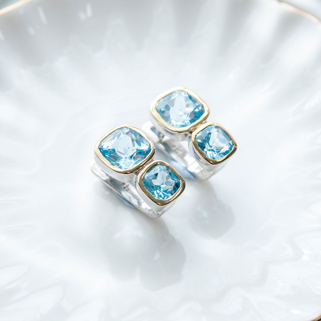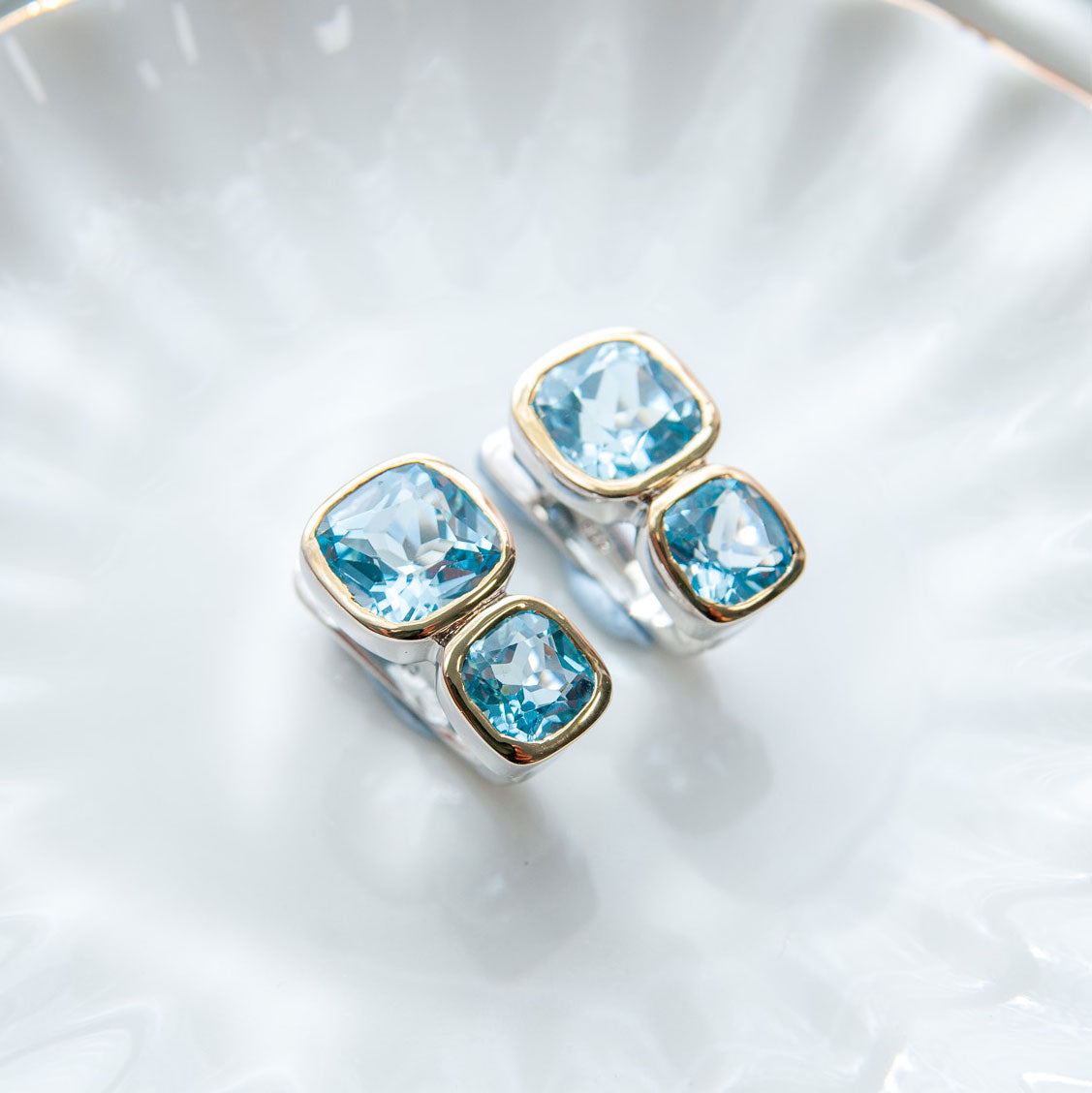 העגילים משובצים בשתי אבני בלו טופז טבעיות בצורת מרובעים, בגוון תכלת זוהר שמעניק מראה אלגנטי ועדין.