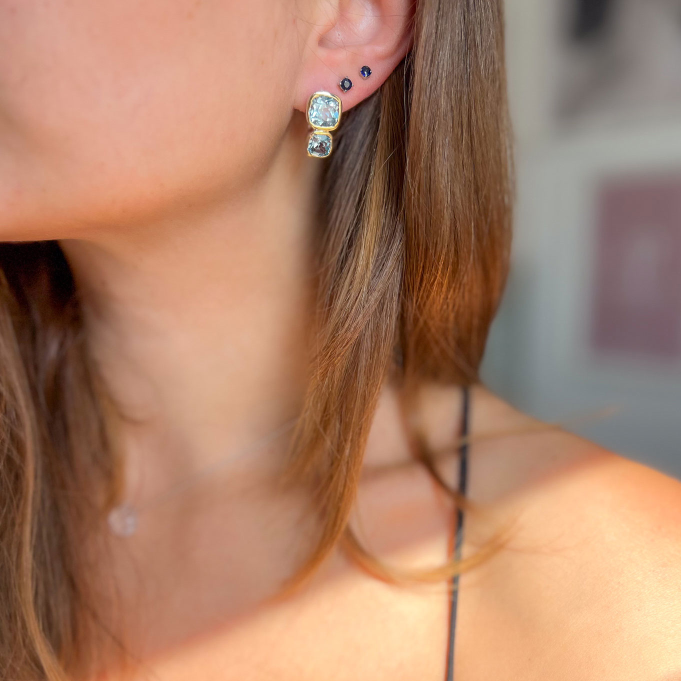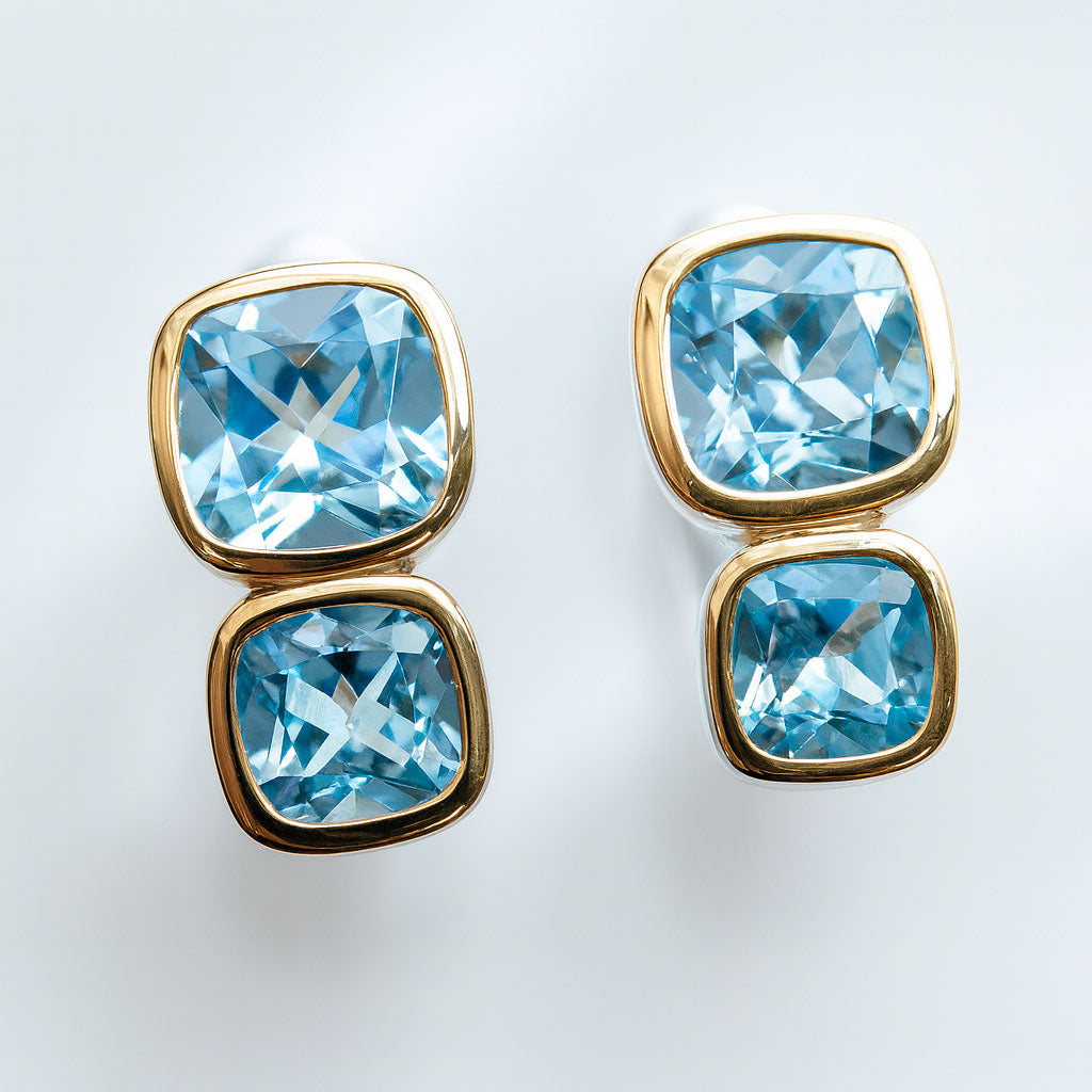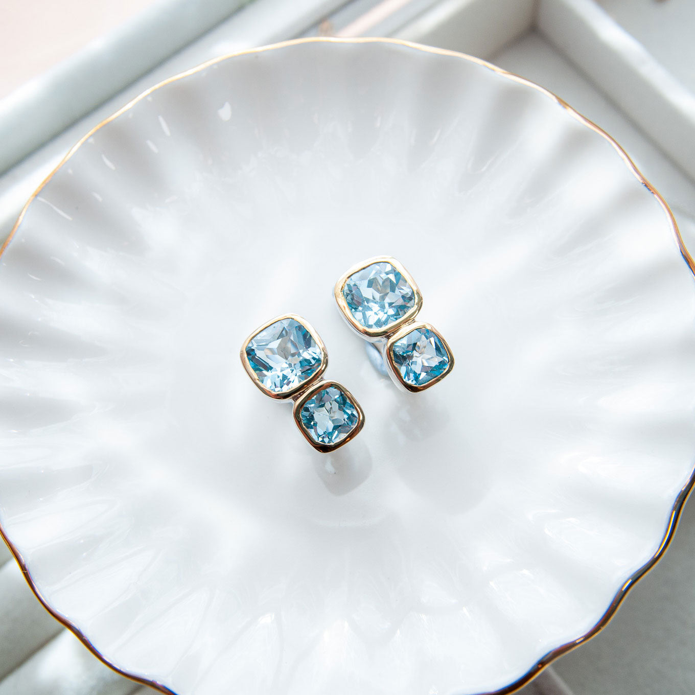 העגילים משובצים בשתי אבני בלו טופז טבעיות בצורת מרובעים, בגוון תכלת זוהר שמעניק מראה אלגנטי ועדין.