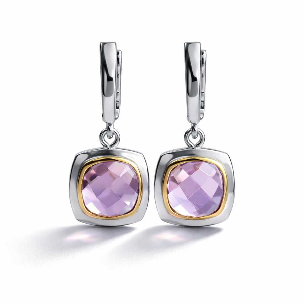 העגילים משובצים באבני אמטיסט טבעיות בגוון סגלגל עמוק אבן של רוגע, איזון ובהירות פנימית, המסייעת להפחתת מתחים ולחיזוק שלווה רגשית.