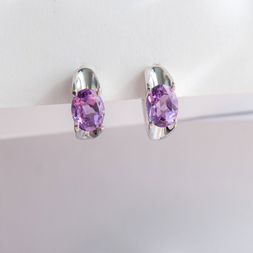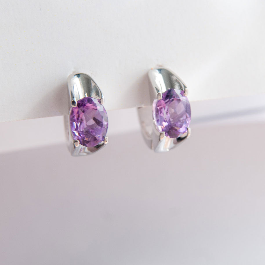 העגילים משובצים באבני אמטיסט טבעיות בגוון סגלגל עמוק אבן של רוגע, איזון ובהירות פנימית, המסייעת להפחתת מתחים ולחיזוק שלווה רגשית.