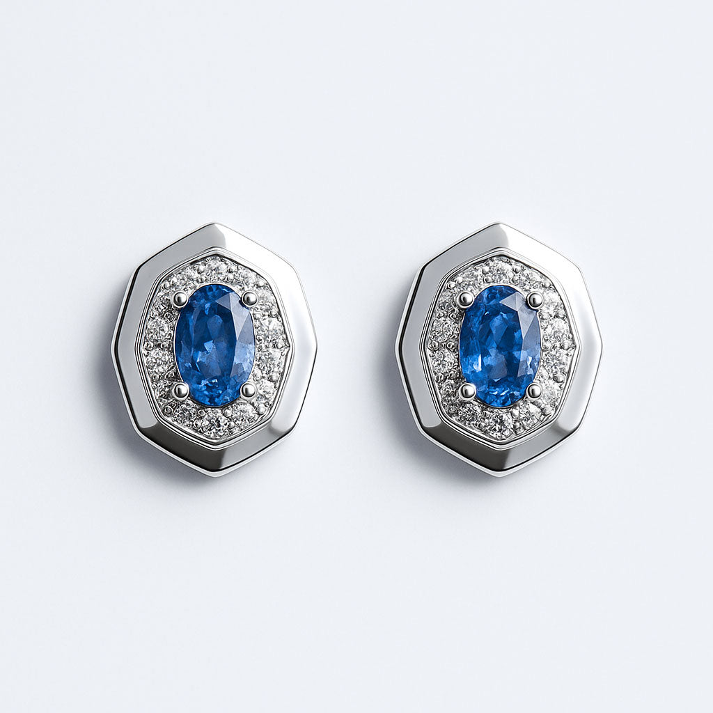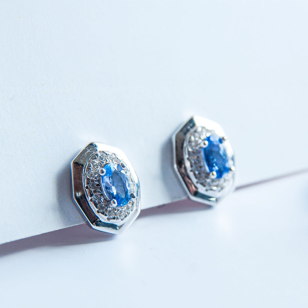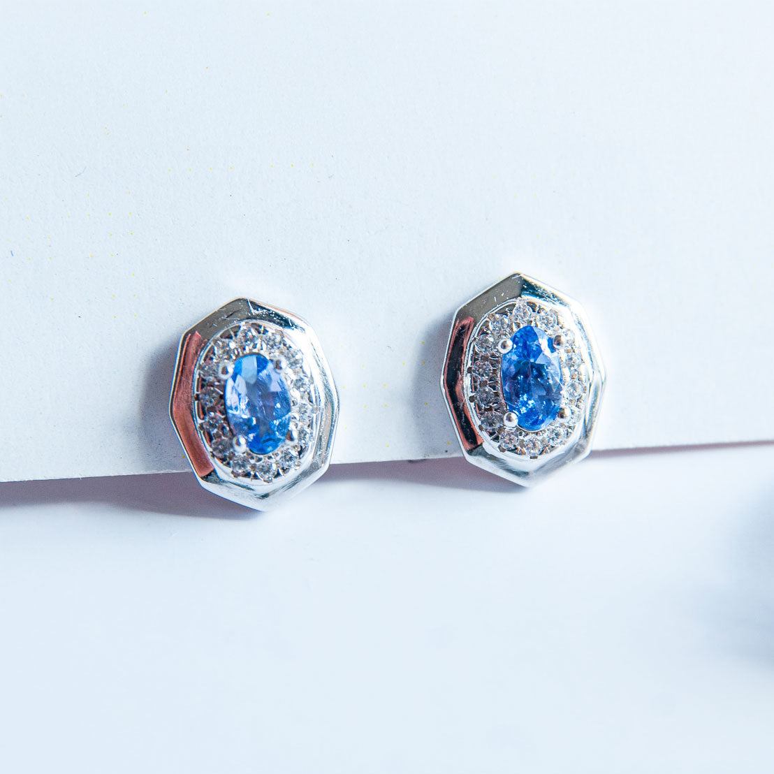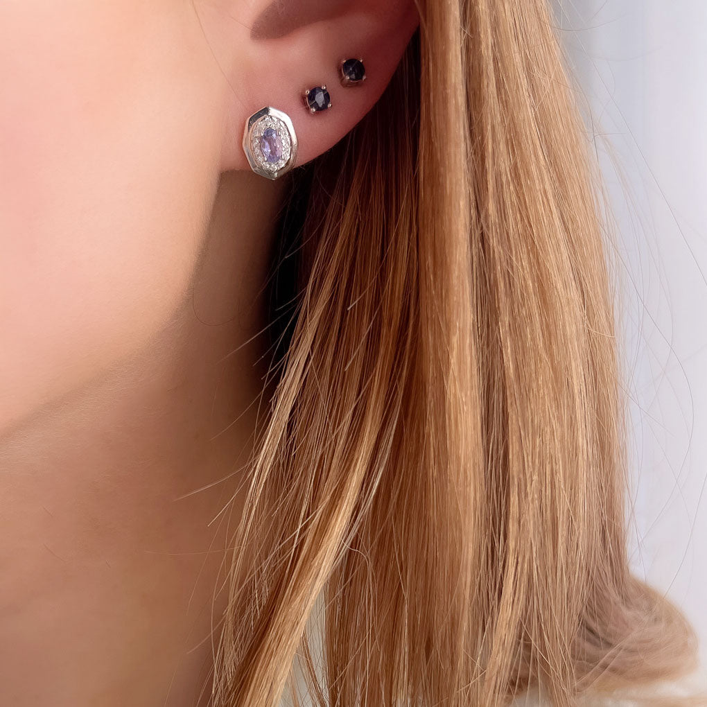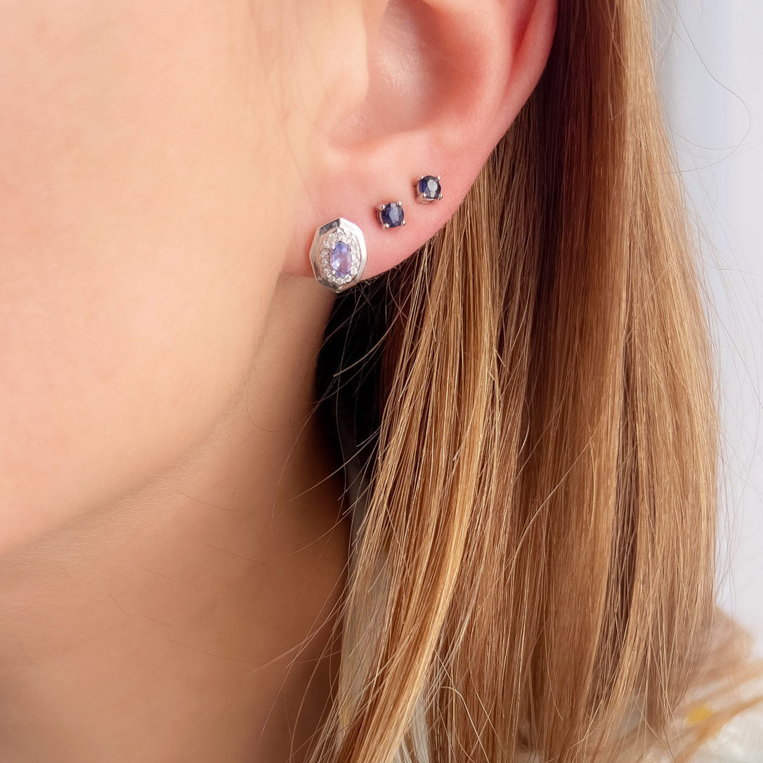 העגילים צמודים לאוזן ומשובצים ב־אבני טנזנייט טבעיות בגוון כחול־סגלגל מהפנט, מוקפות בשיבוץ עדין של זרקונים נוצצים שמדגישים את יופיין ואת הברק האלגנטי של התכשיט.