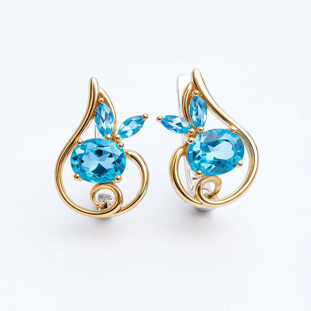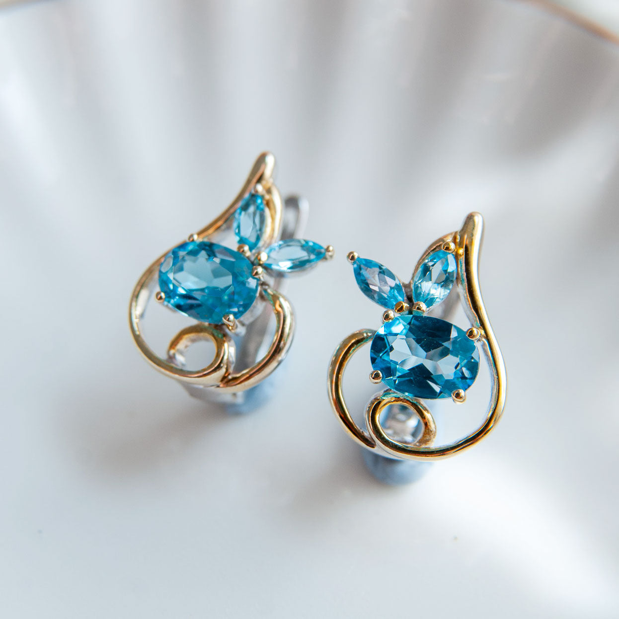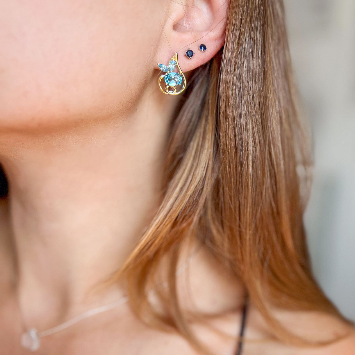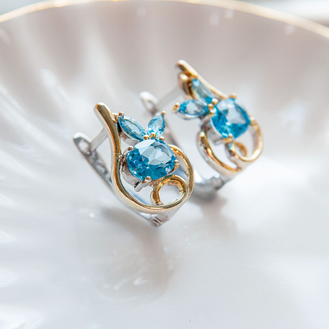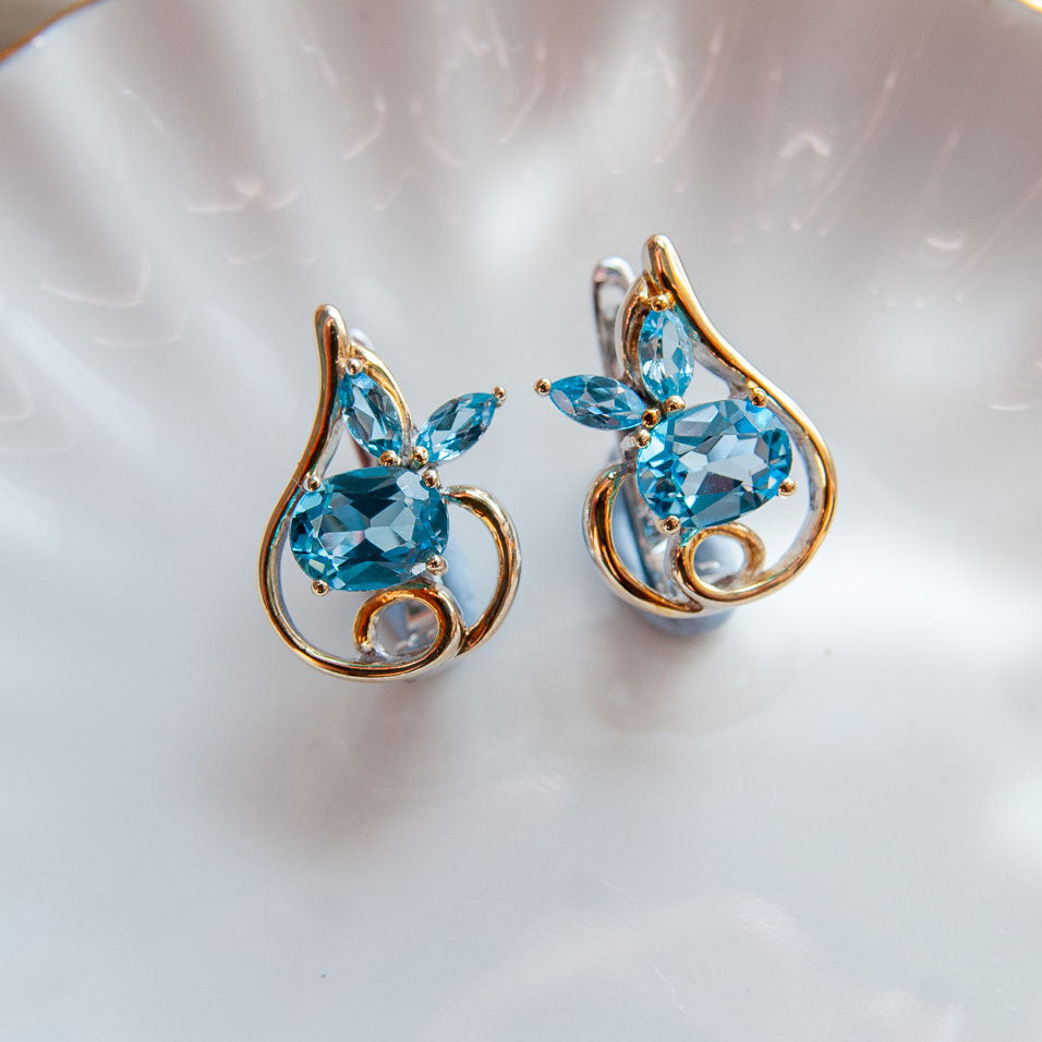 זוג עגילי כסף סטרלינג 925 בציפוי זהב חלקי ( בחלק הקדמי של העגיל) בעיצוב עלים עדינים, משובצים אבן בלו טופז מרכזית בחיתוך אובלי ושתי אבנים נוספות בגימור עלה שמעניקות מראה טבעי, זורם ורך.