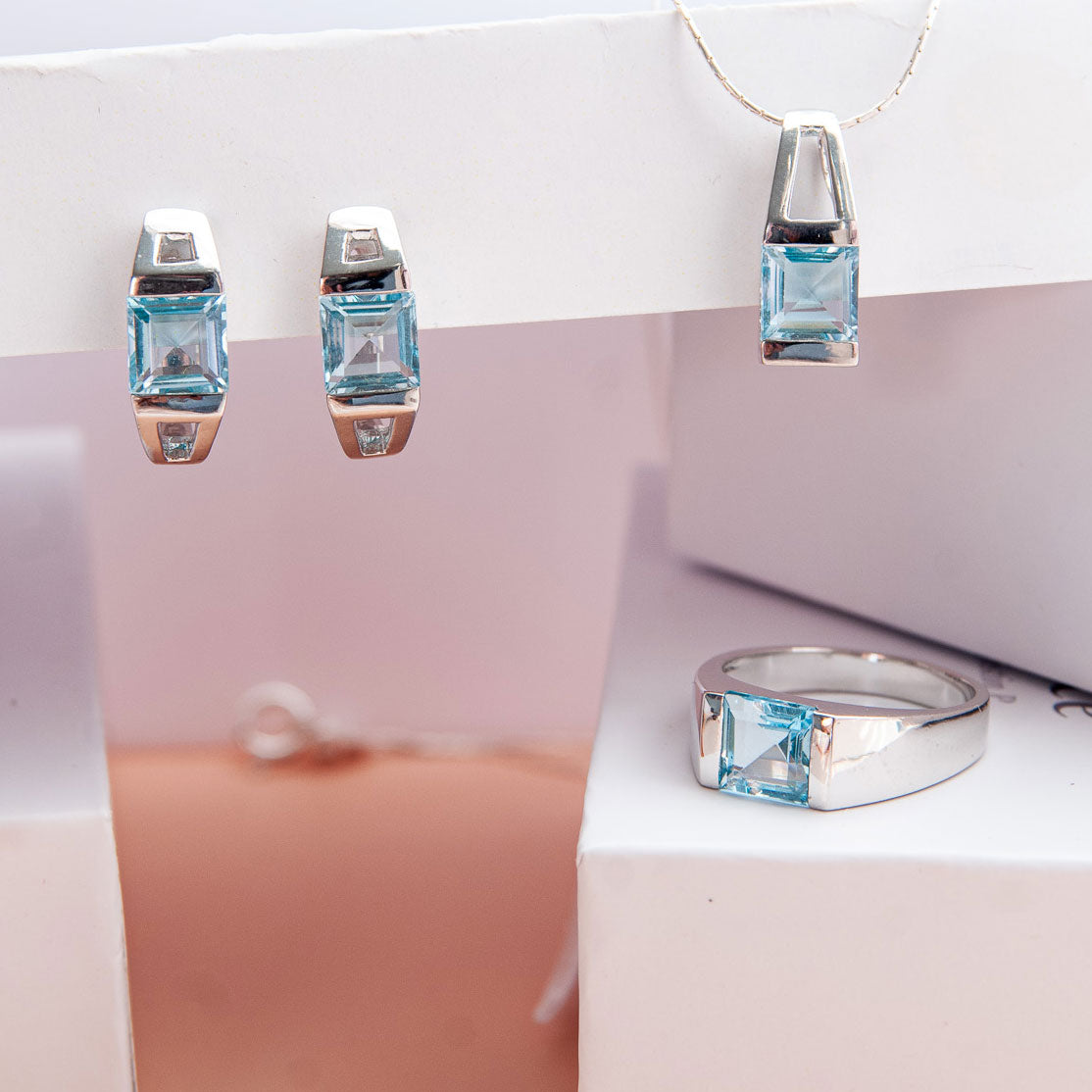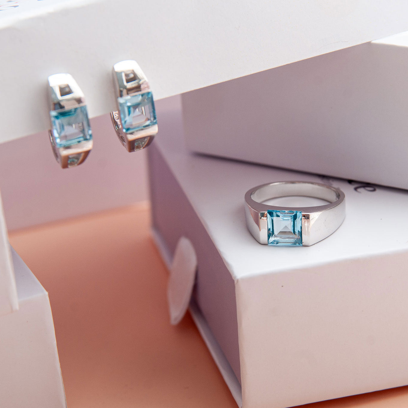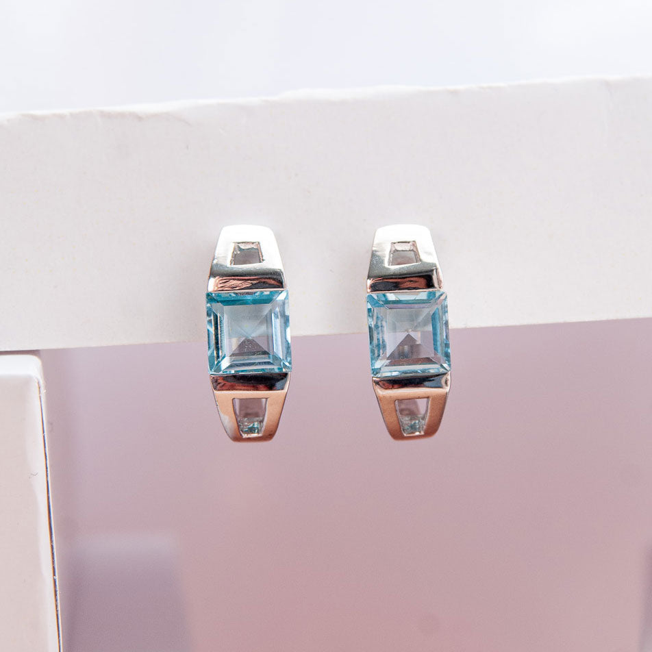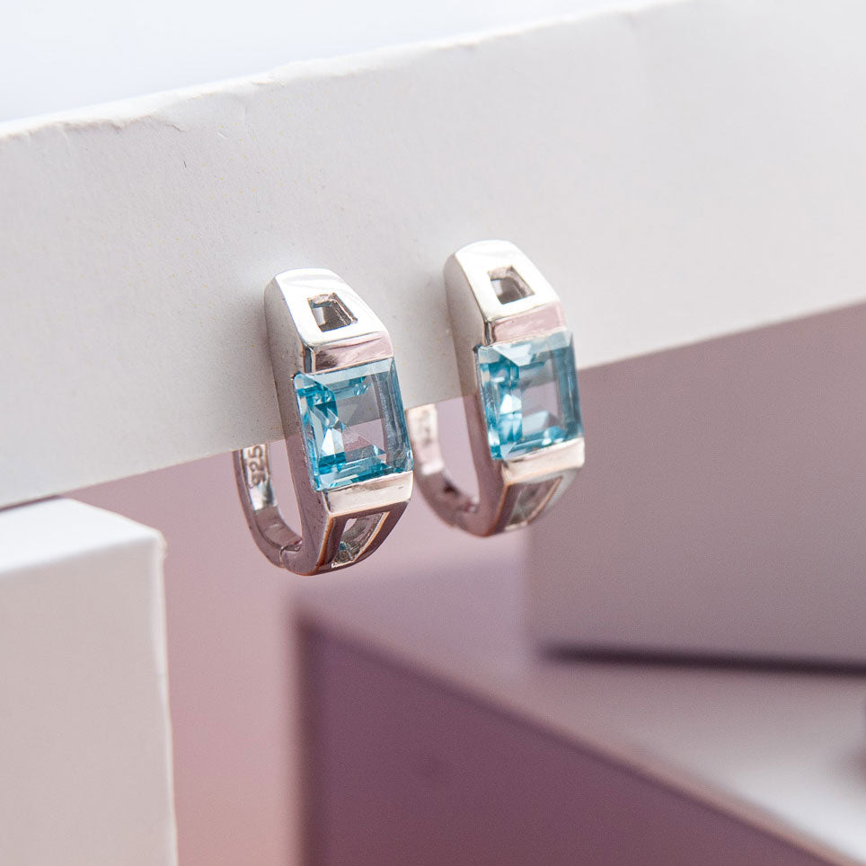 העגילים משובצים באבני בלו טופז טבעיות בגוון תכלת מואר, המשדרות רוגע, נשיות ואור פנימי.