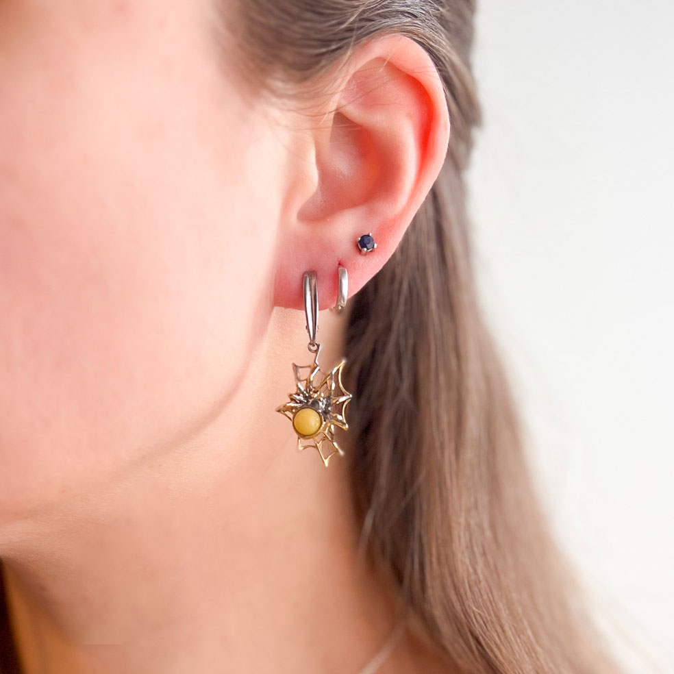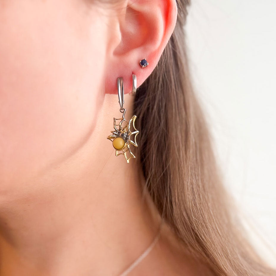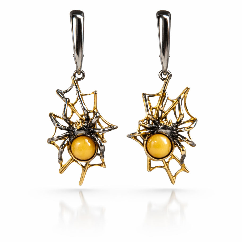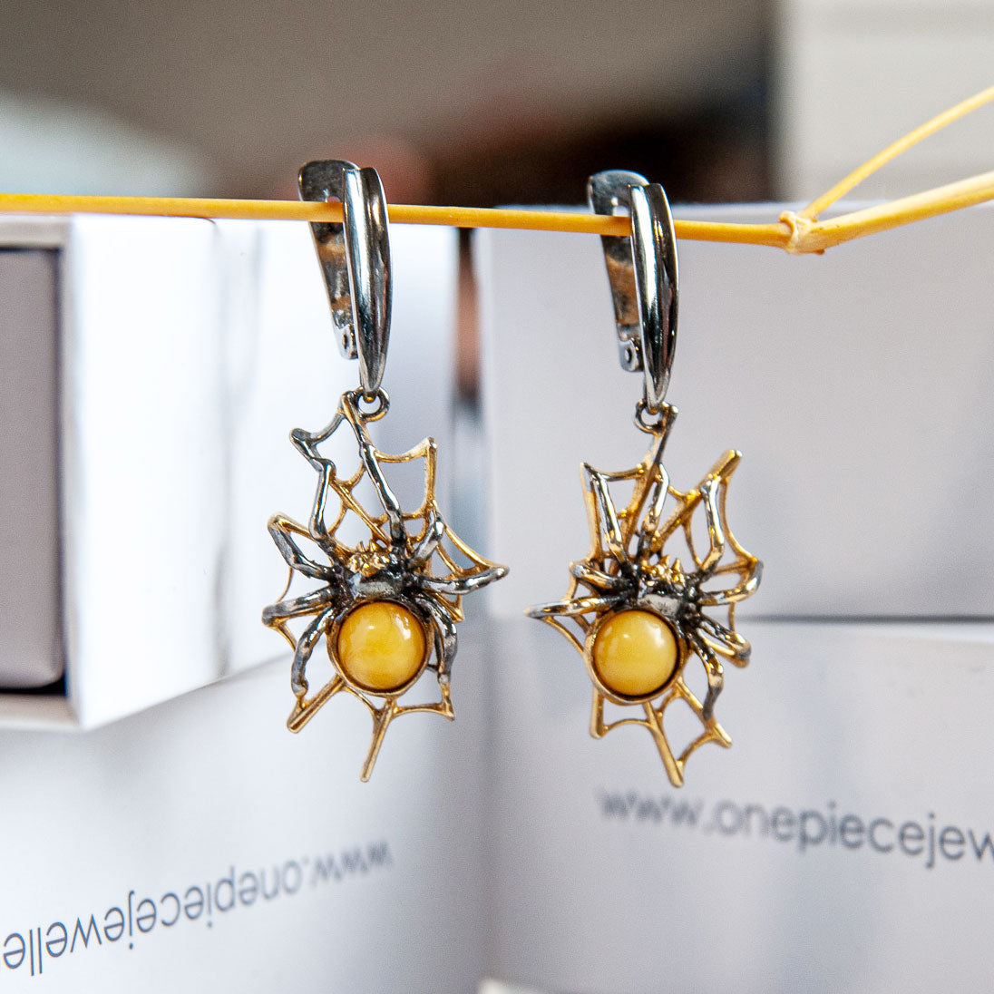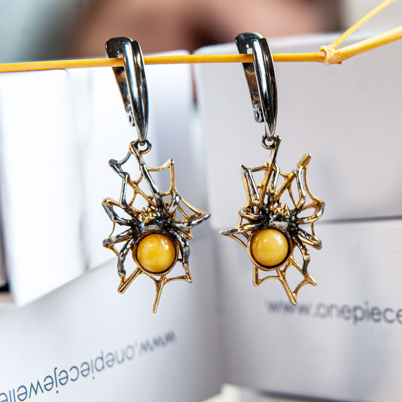 עגילי כסף עם ענבר צהוב חלבי "ספיידי" בעבודת יד