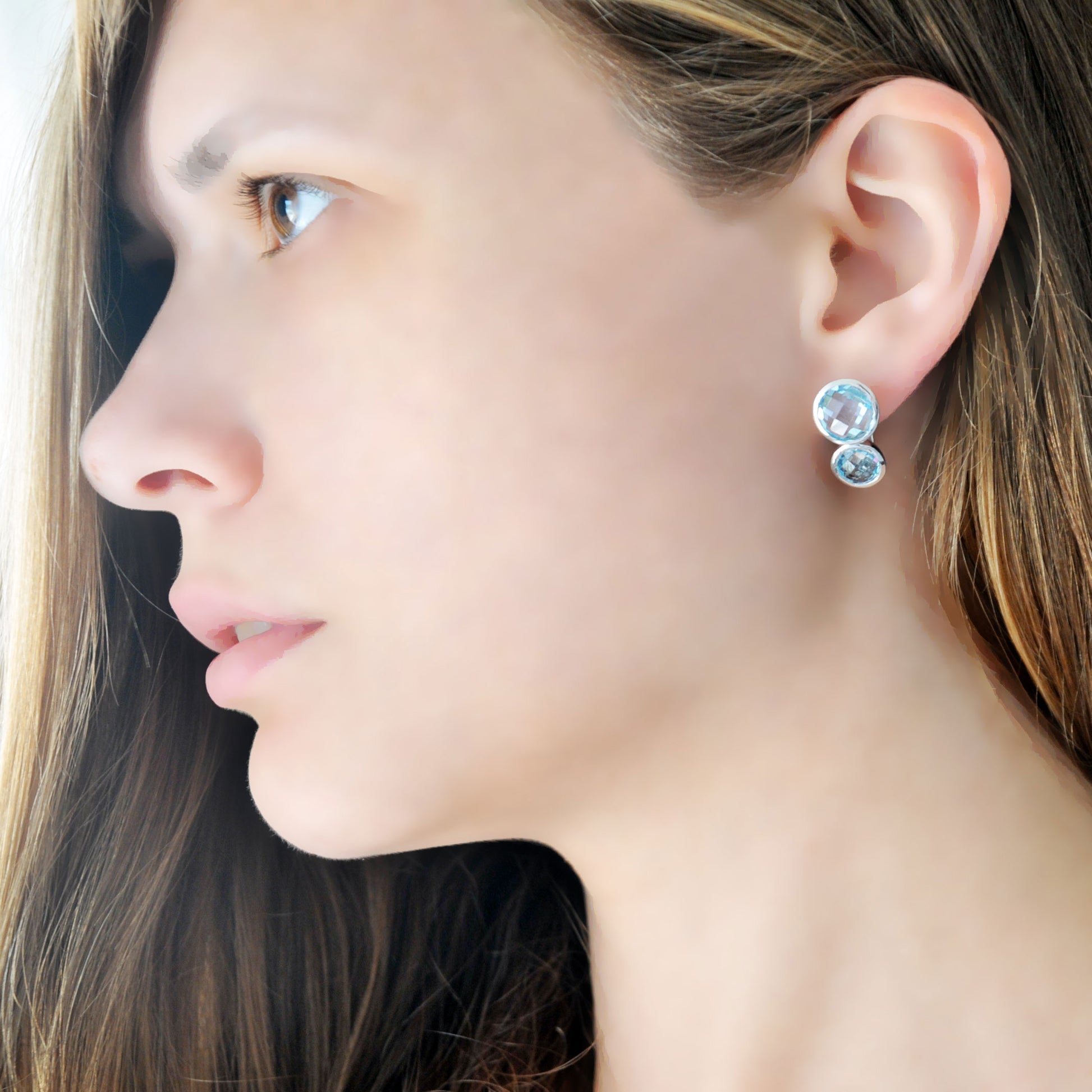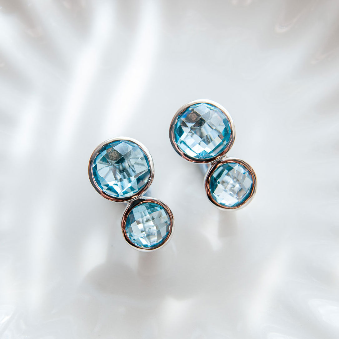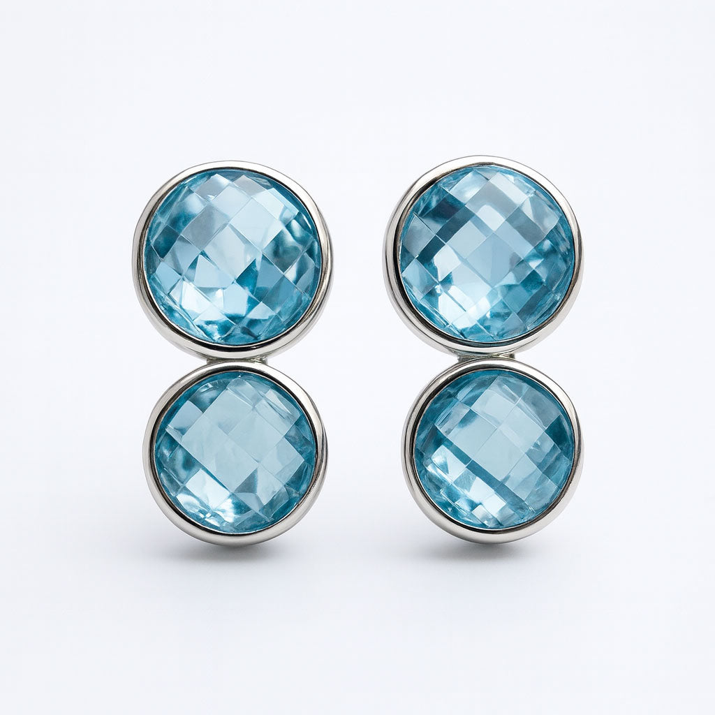 כל עגיל משובץ ב־שתי אבני בלו טופז טבעיות בגוון תכלת זוהר, המוסיפות מראה יוקרתי, רך ועדין כאחד.