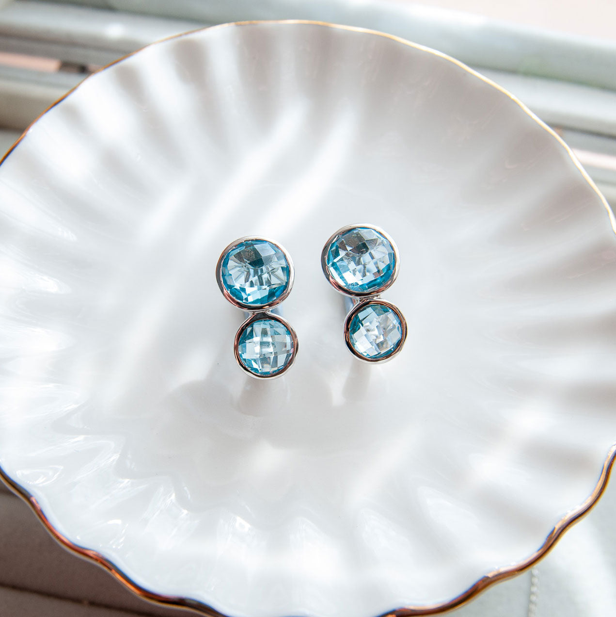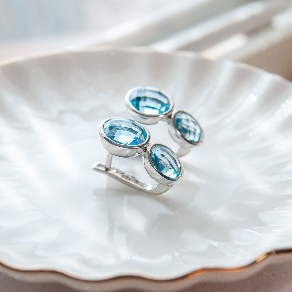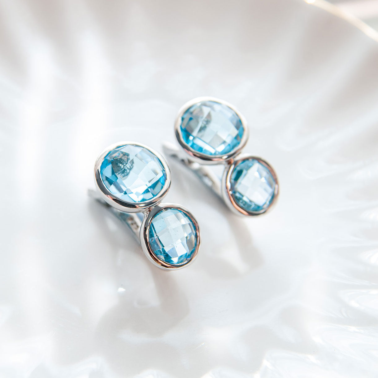 כל עגיל משובץ ב־שתי אבני בלו טופז טבעיות בגוון תכלת זוהר, המוסיפות מראה יוקרתי, רך ועדין כאחד.