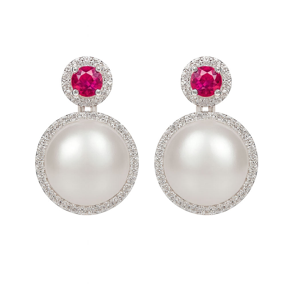 במרכזם משובצת פנינה טבעית לבנה קלאסית, מסביבה אבני רובי טבעיות בגוון אדום עוצמתי, ובשיבוץ נוסף של אבני זרקון מנצנצות להשלמת המראה האלגנטי.
