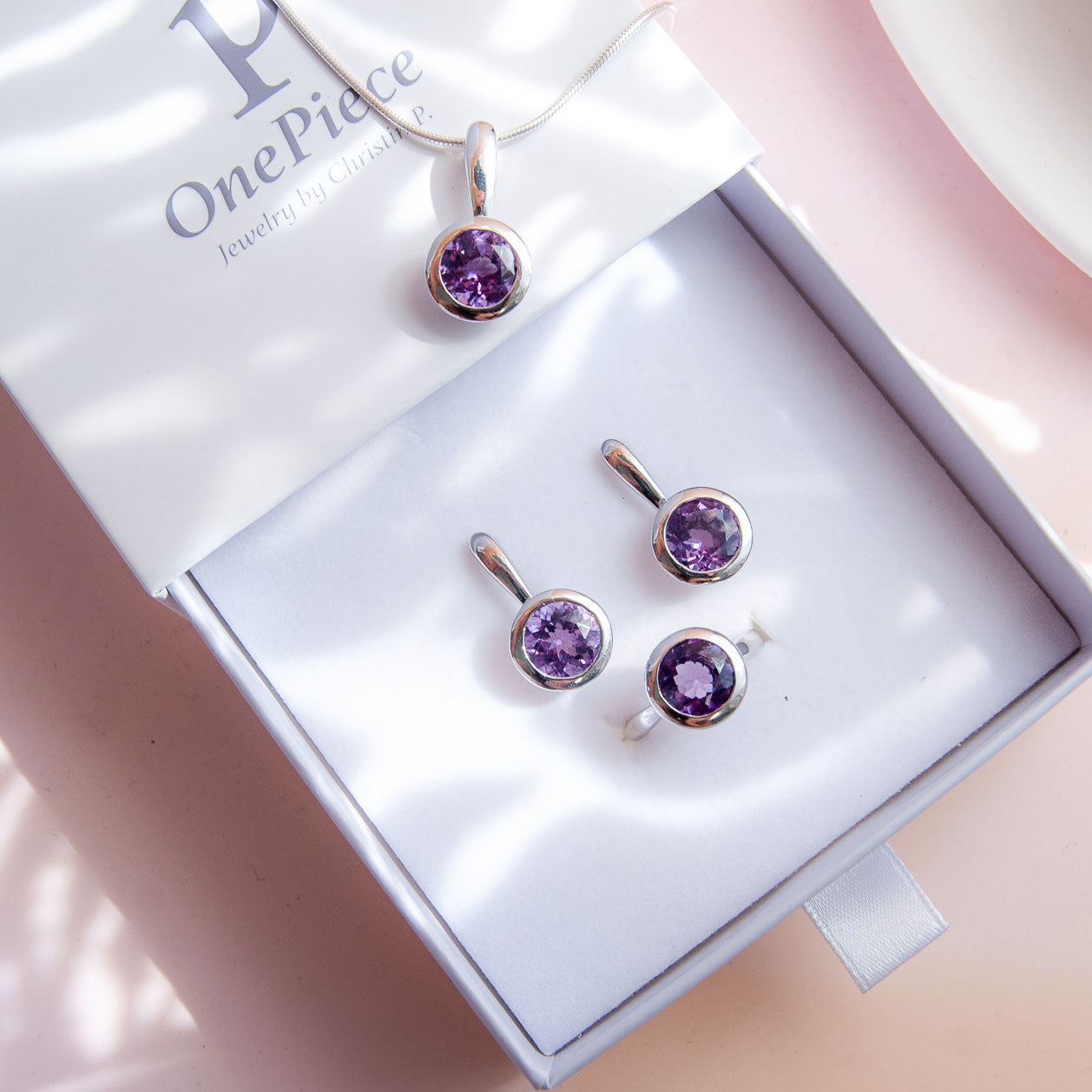 העגילים משובצים באבני אמטיסט טבעיות, אבן בעלת אנרגיה של רוגע, איזון ובהירות מחשבה, המסייעת להפחתת מתחים ולחיזוק שלווה פנימית.