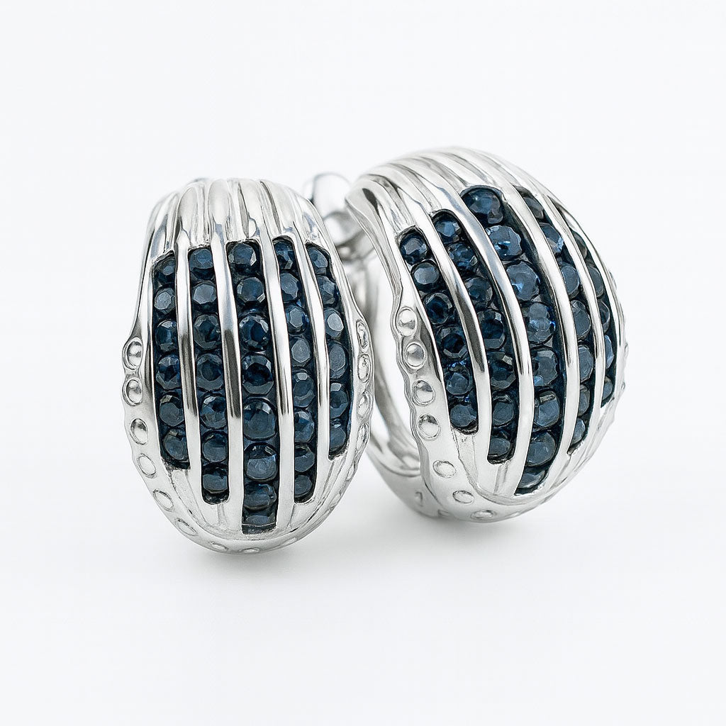 העגילים משובצים באבני ספיר טבעיות בגוון כחול עמוק, בעיצוב עגיל צמוד לאוזן עם סוגר אנגלי בטיחותי לנוחות ולביטחון מקסימליים.