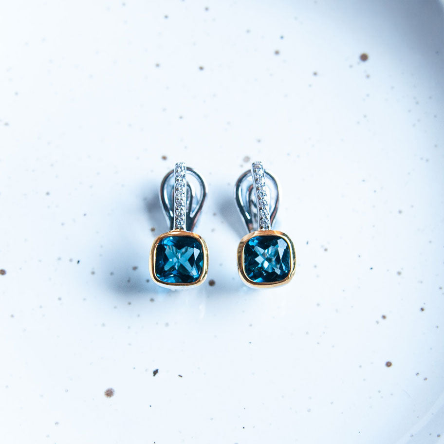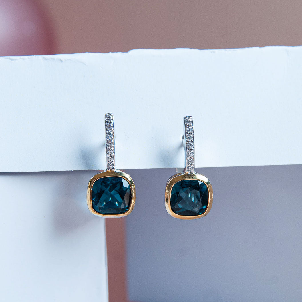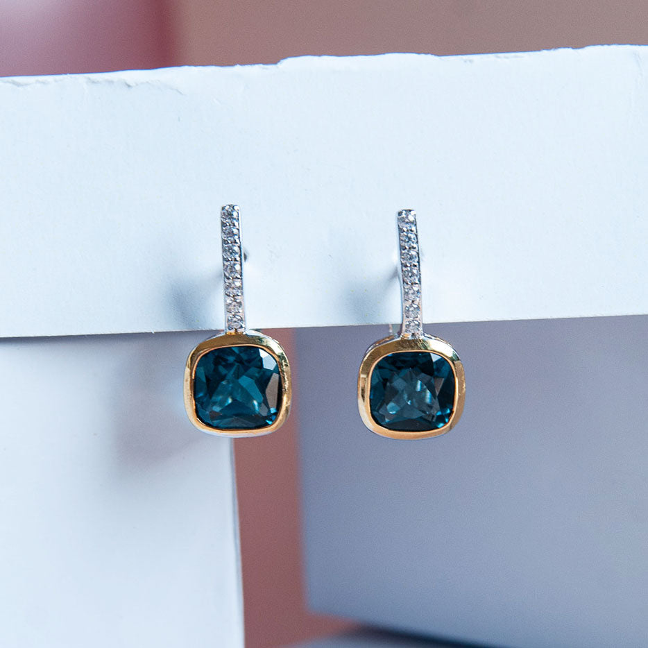 במרכז כל עגיל משובצת אבן London Topaz טבעית בגוון כחול עמוק ומרשים, המסמלת שלווה פנימית, חכמה ובהירות מחשבתית. האבן מוקפת באבני זרקון שקופות המדמות נצנוץ יהלומי עדין, שמעצים את האור והברק של העגיל.