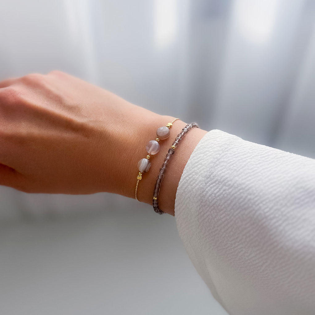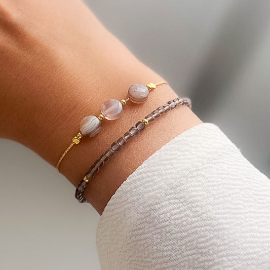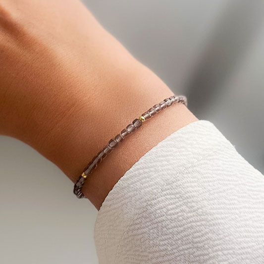 צמיד עדין בעבודת יד עם אבני סמוקי קוורץ טבעיות, בשילוב כדורי כסף 925 או גולדפילד (לבחירה).