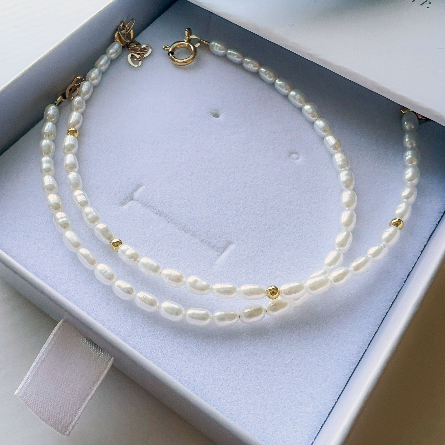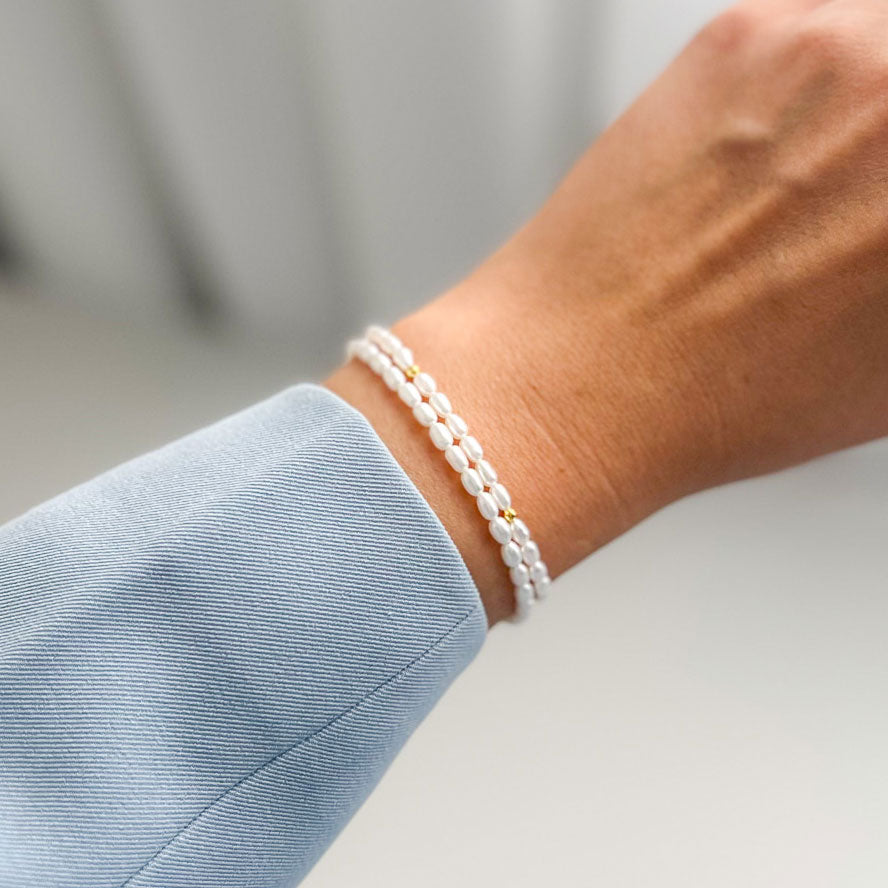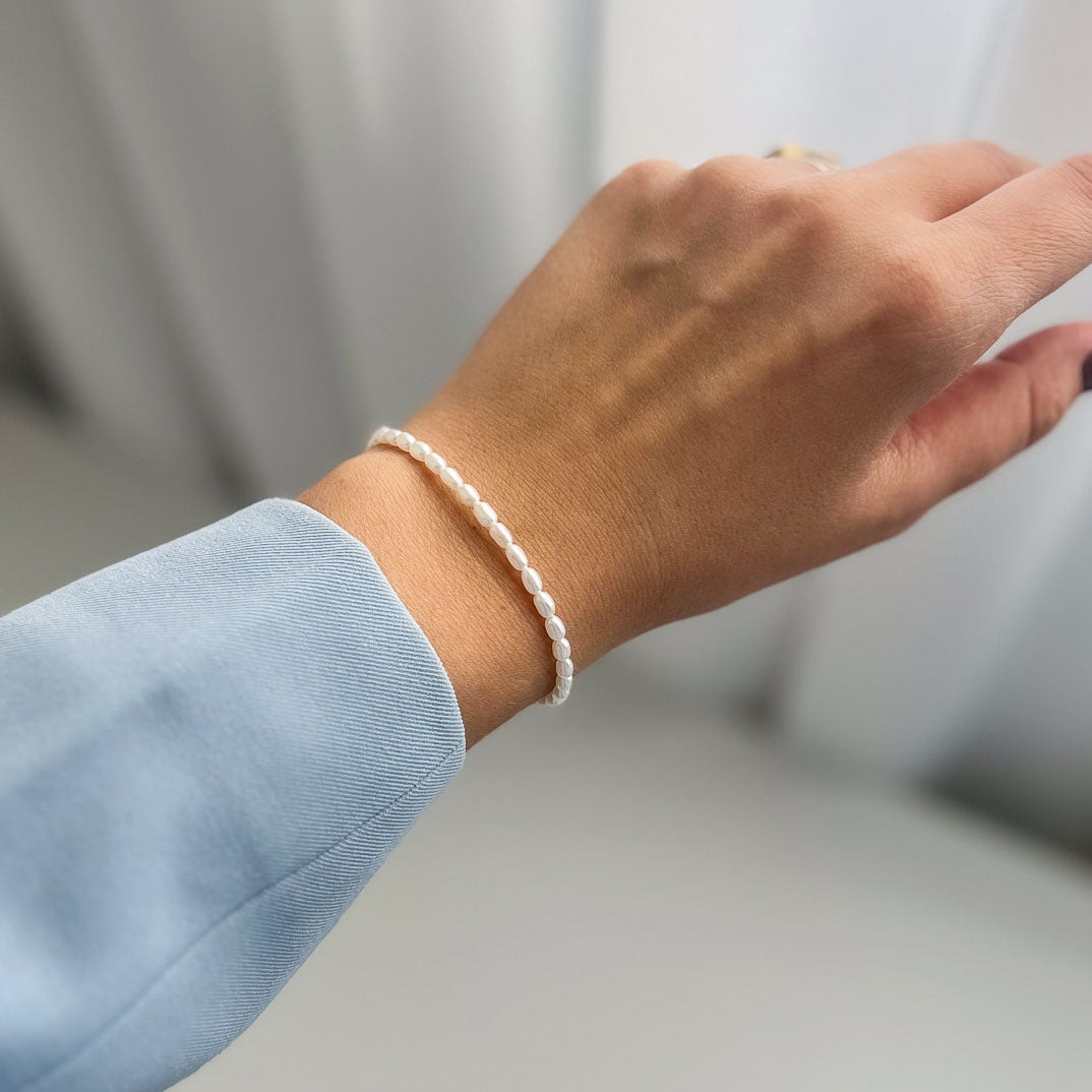 צמיד עדין בעבודת יד מפניני מים מתוקים טבעיות בצורת אורז בגוון לבן רך.