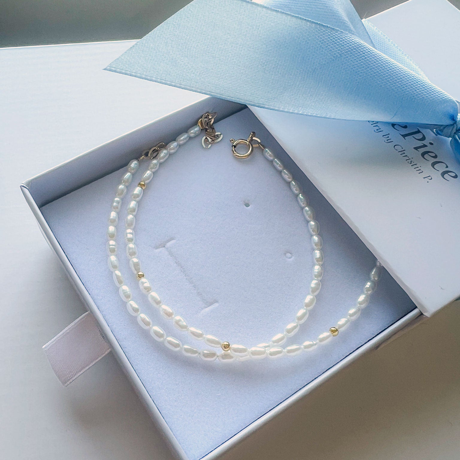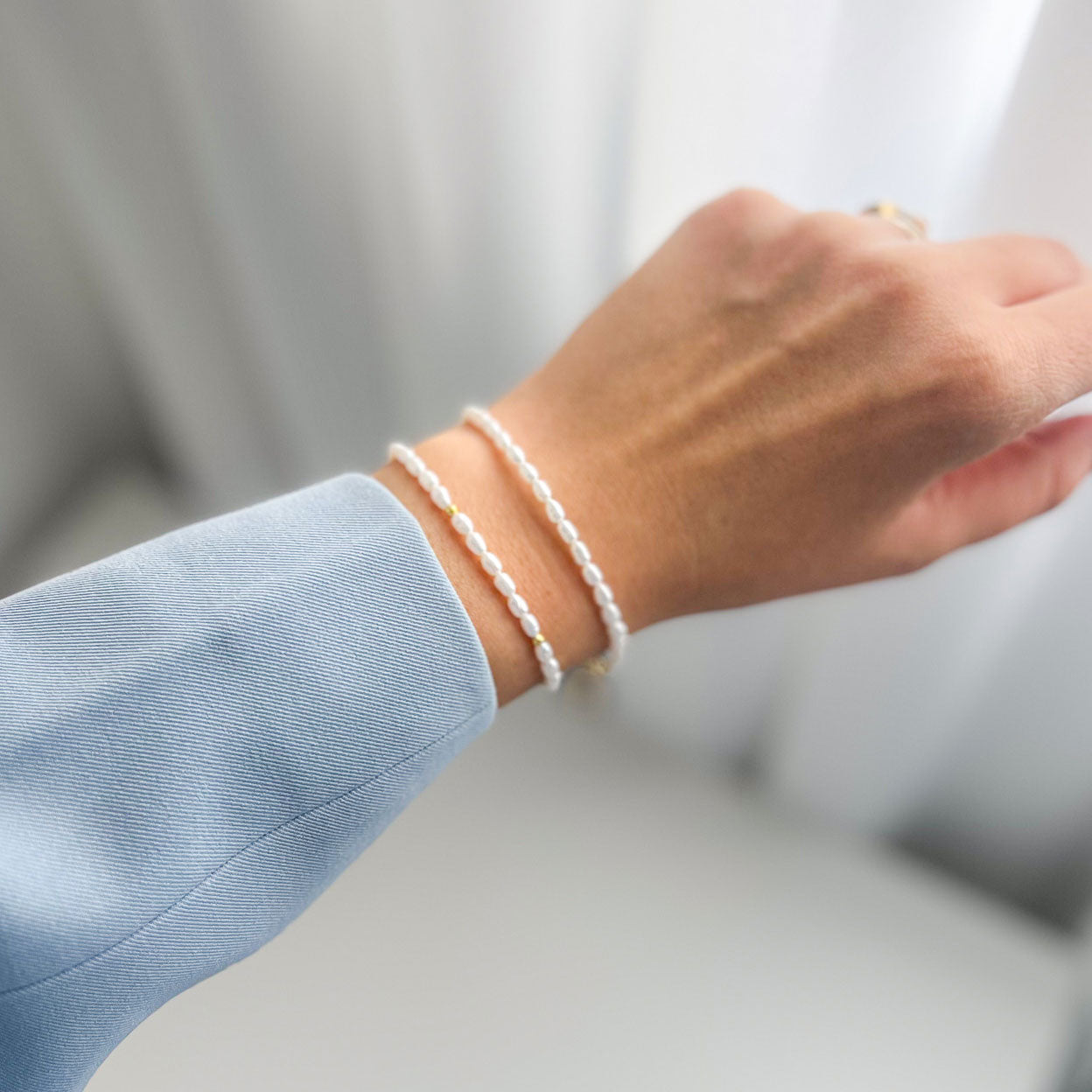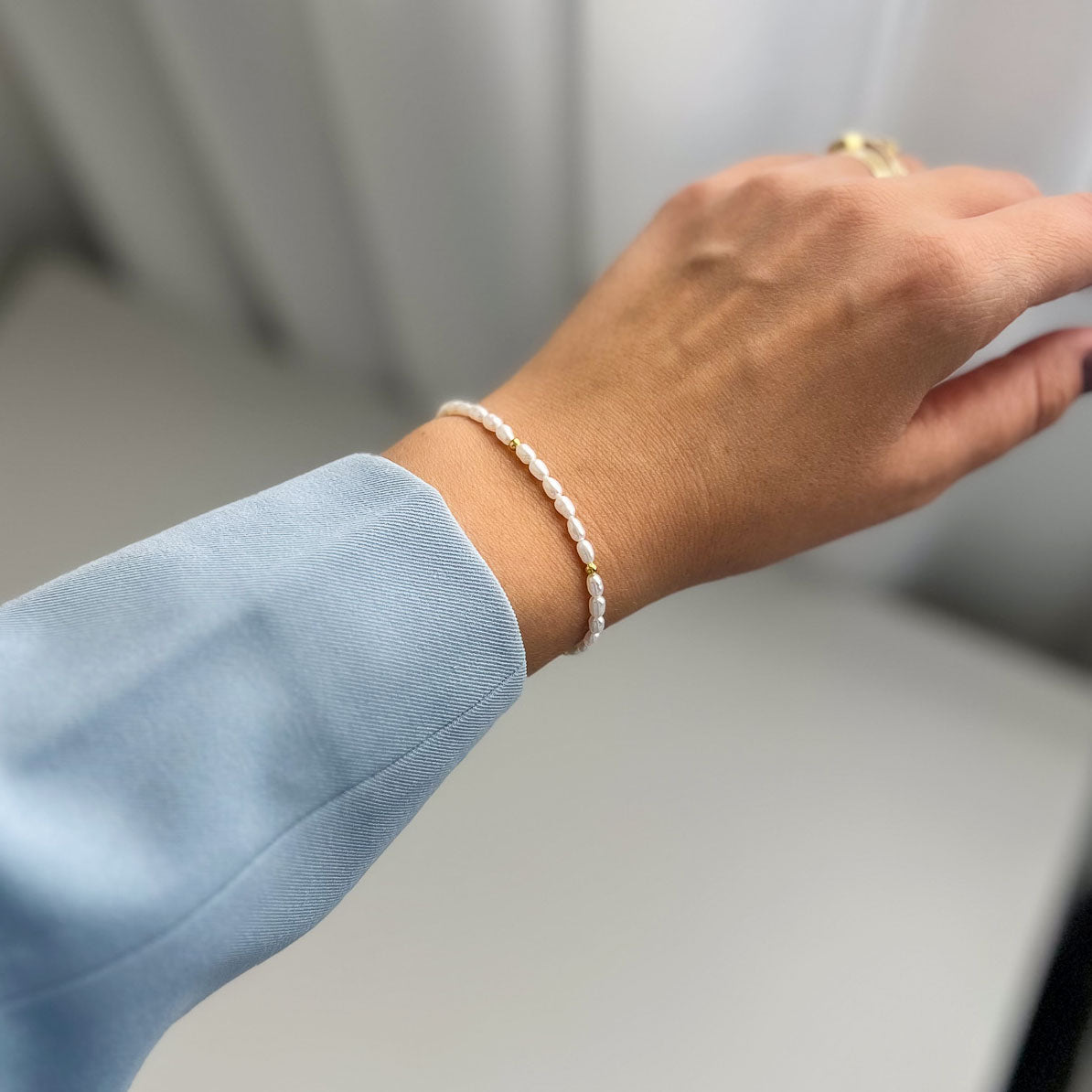 צמיד עדין בעבודת יד מפניני מים מתוקים טבעיות בצורת אורז בגוון לבן רך.