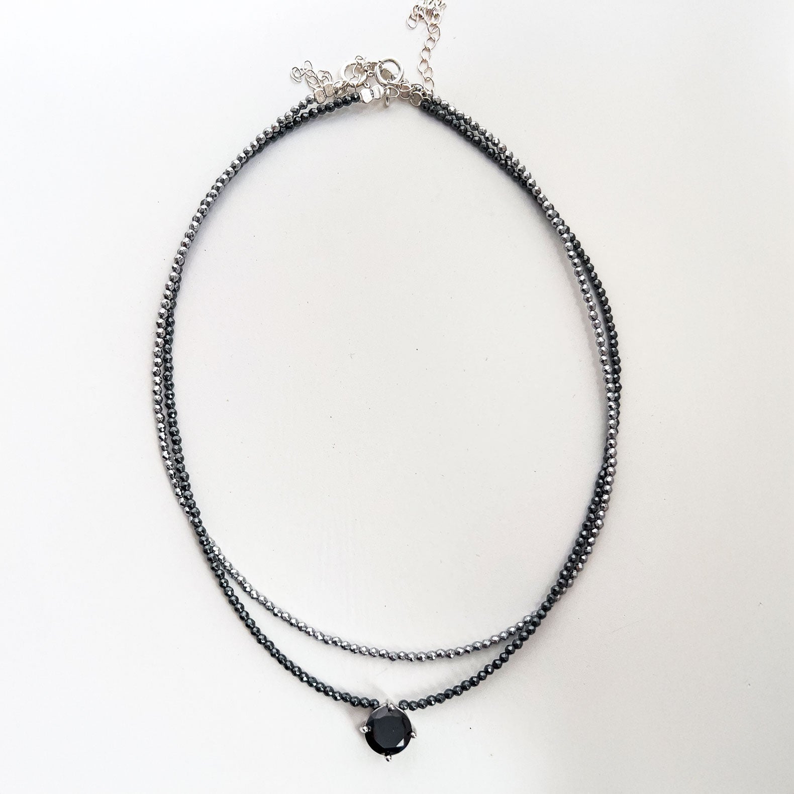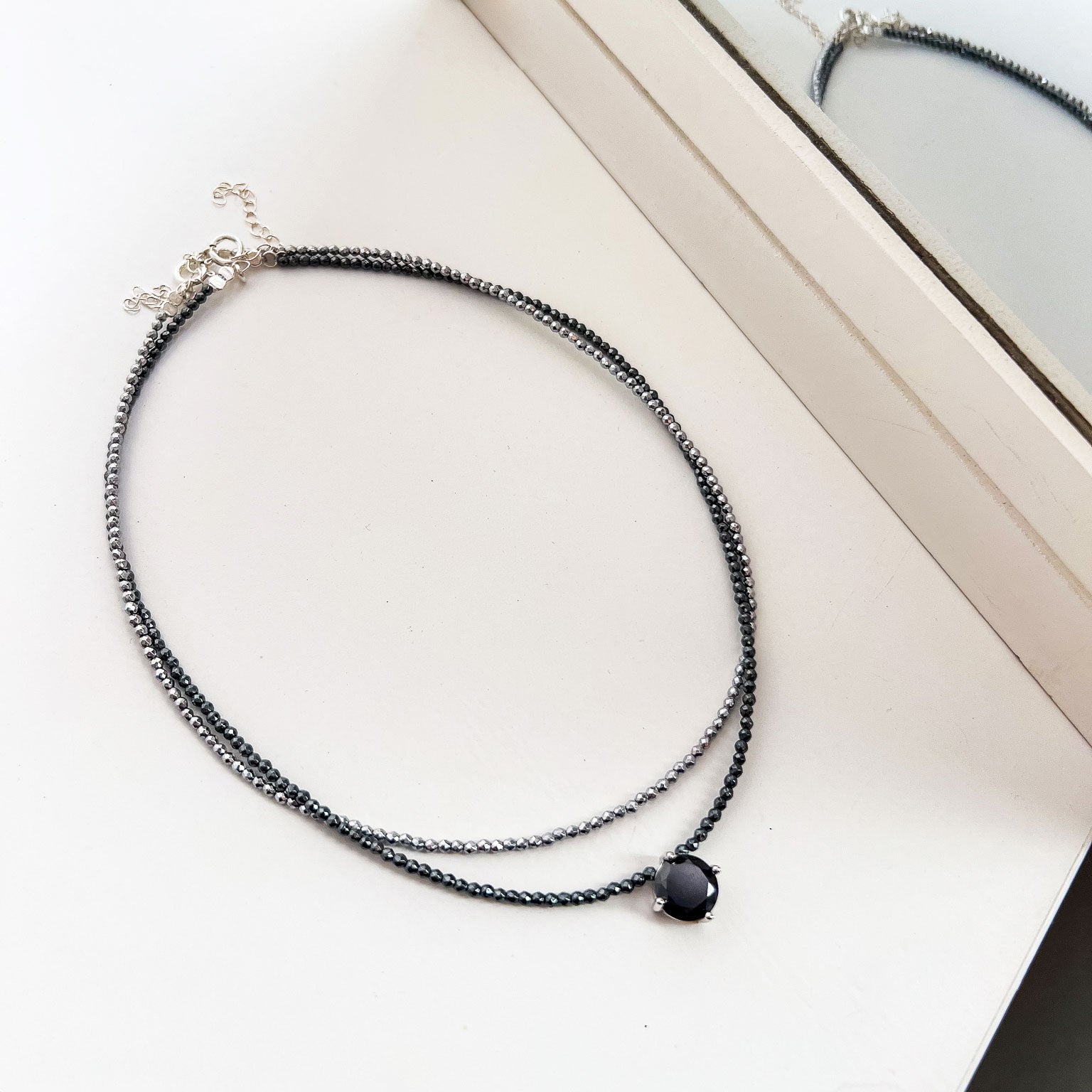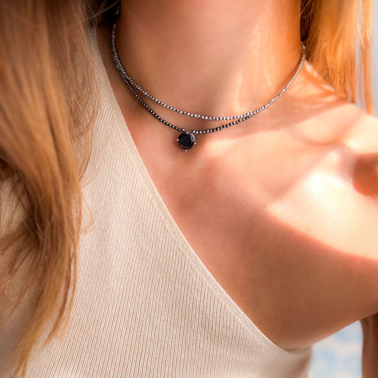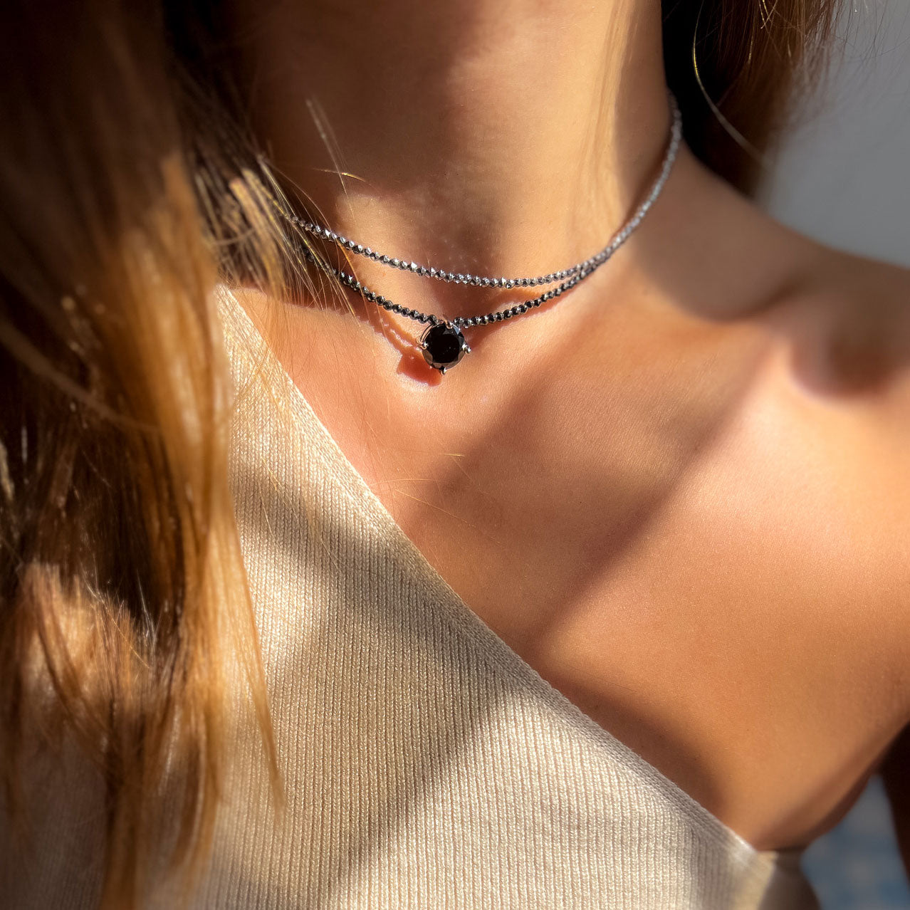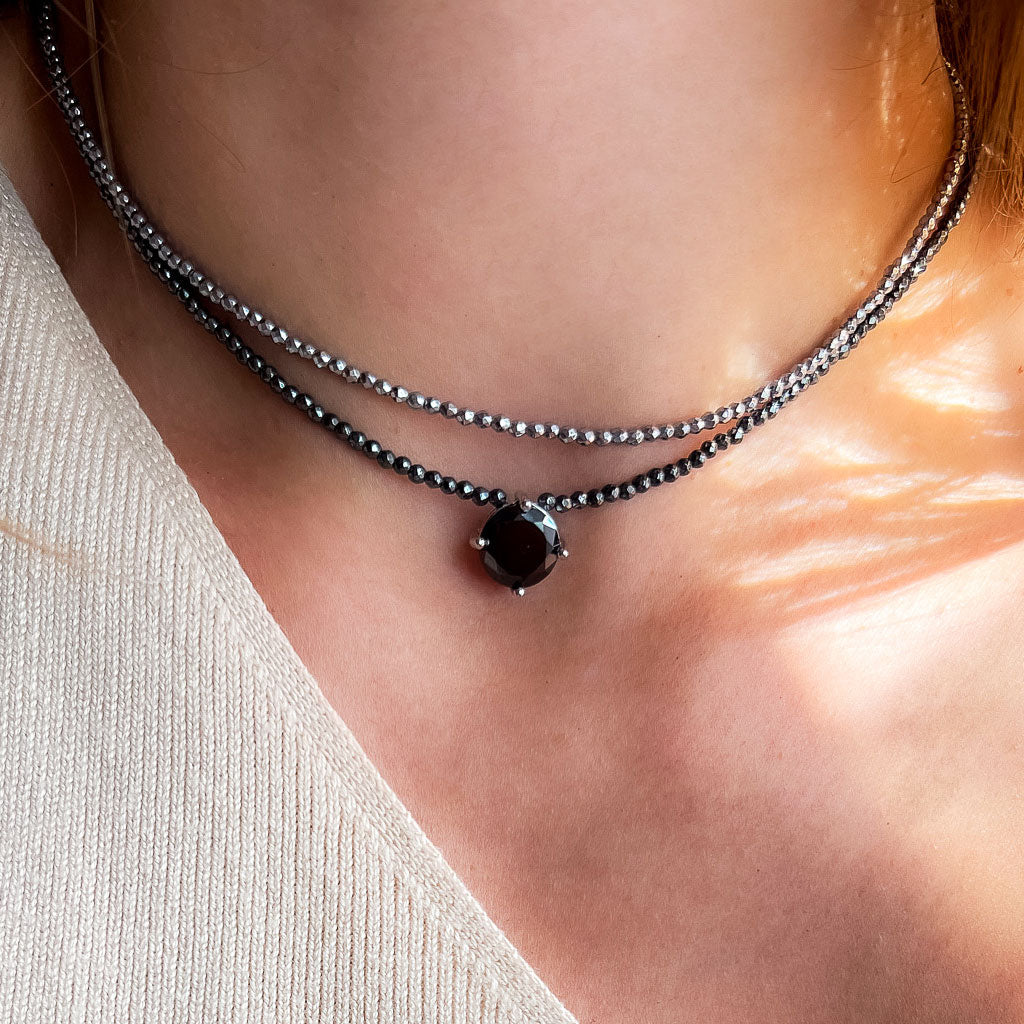 שרשרת אופנתית וצמודה, המשלבת אבני המטיט כהות בגודל 2 מ"מ המעניקות ברק מתכתי ייחודי. השרשרת משלבת תליון משובץ באבן שחורה קטיפתית, בגימור ציפוי רודיום יוקרתי.