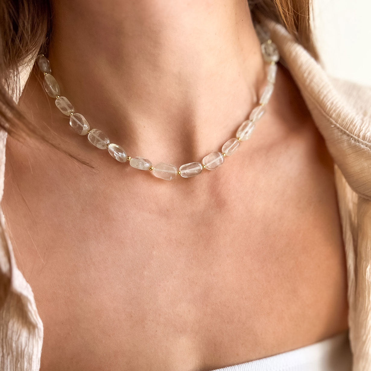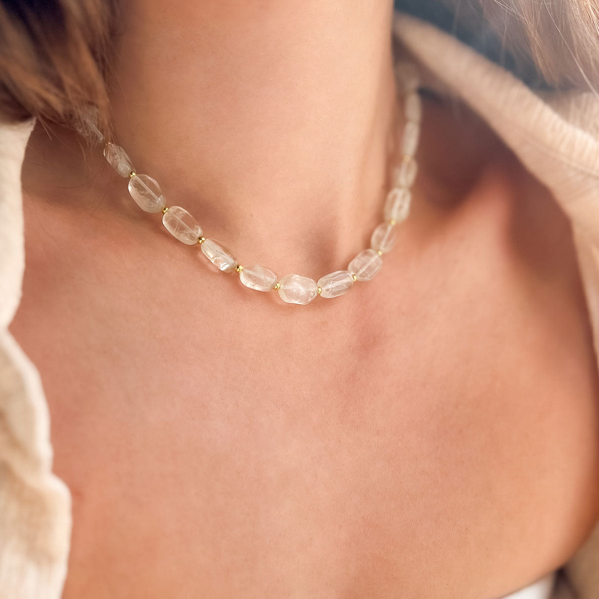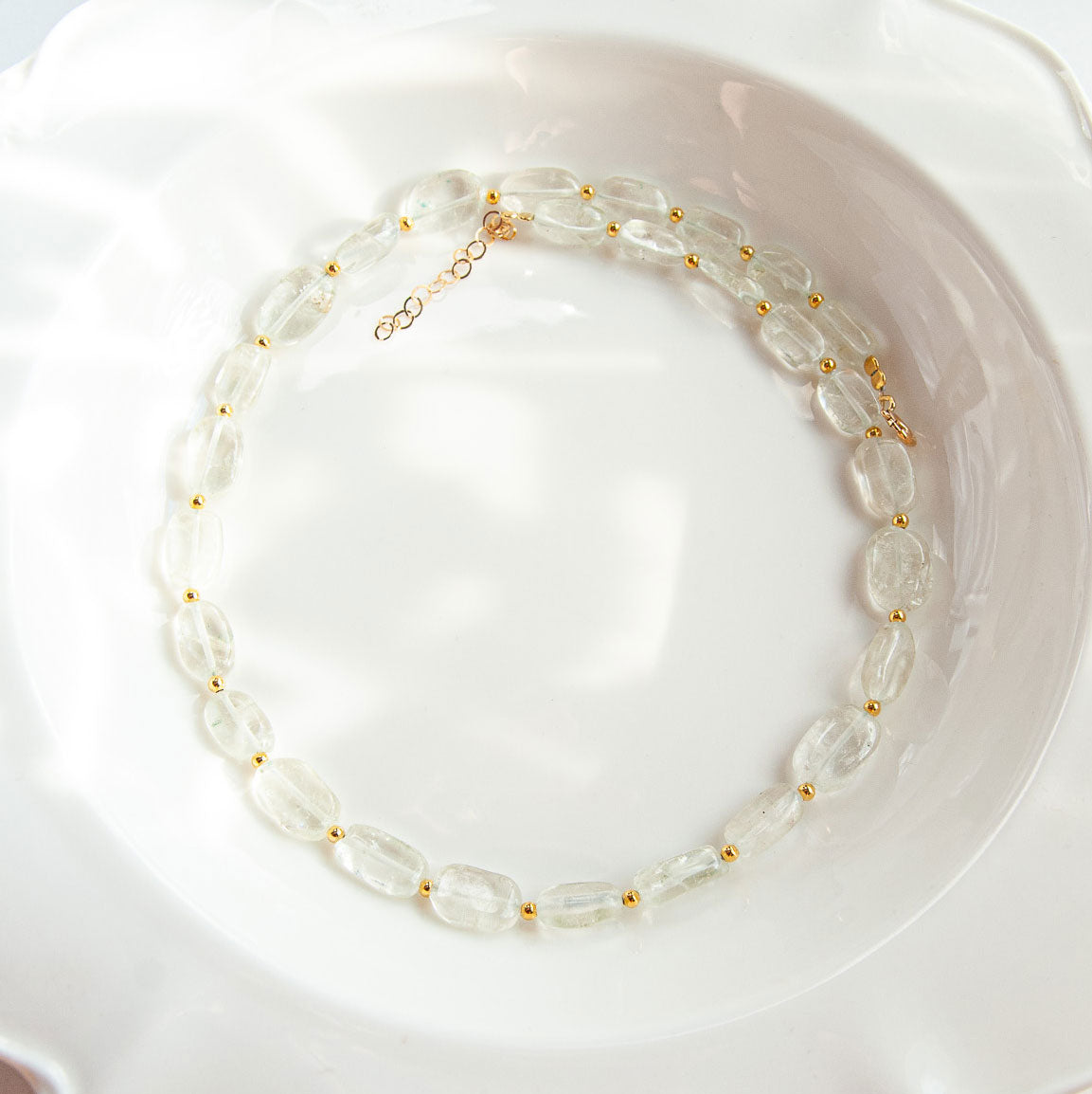 שרשרת בעבודת יד בשילוב אבני קוורץ שקופות בגוון ירוק, מעניקות מראה נקי, רך ומואר.