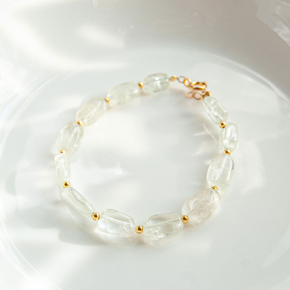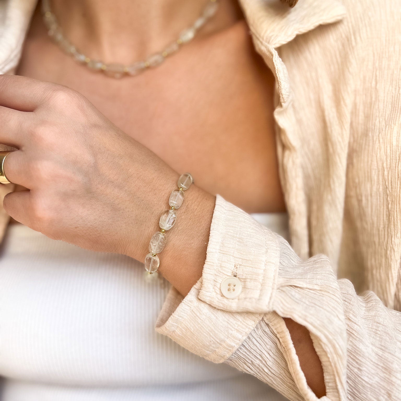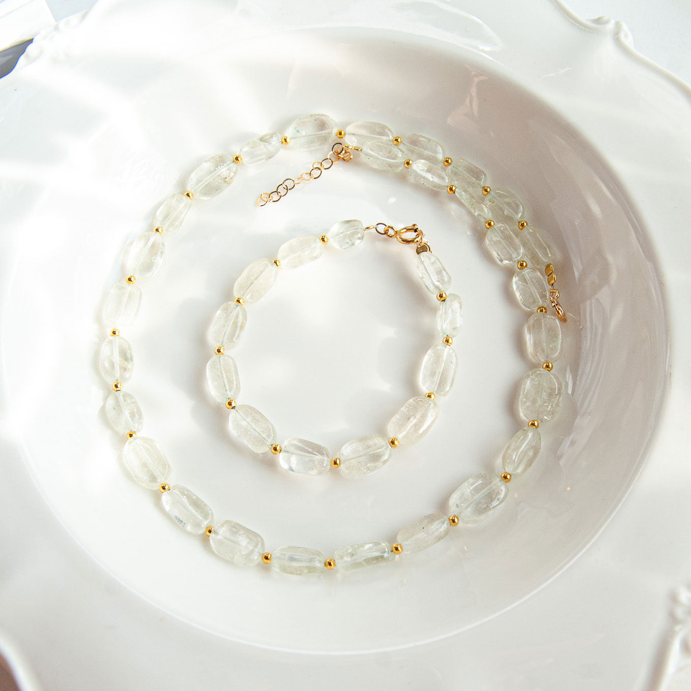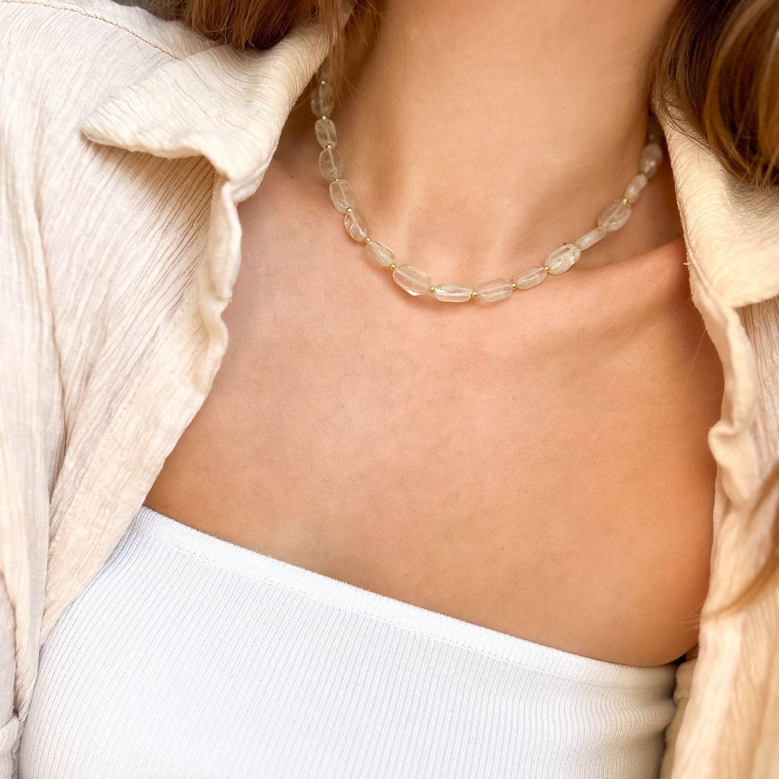שרשרת בעבודת יד בשילוב אבני קוורץ שקופות בגוון ירוק, מעניקות מראה נקי, רך ומואר.