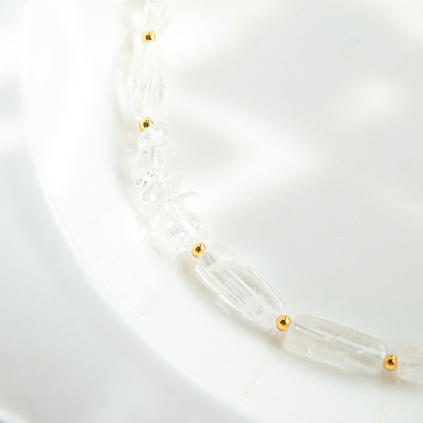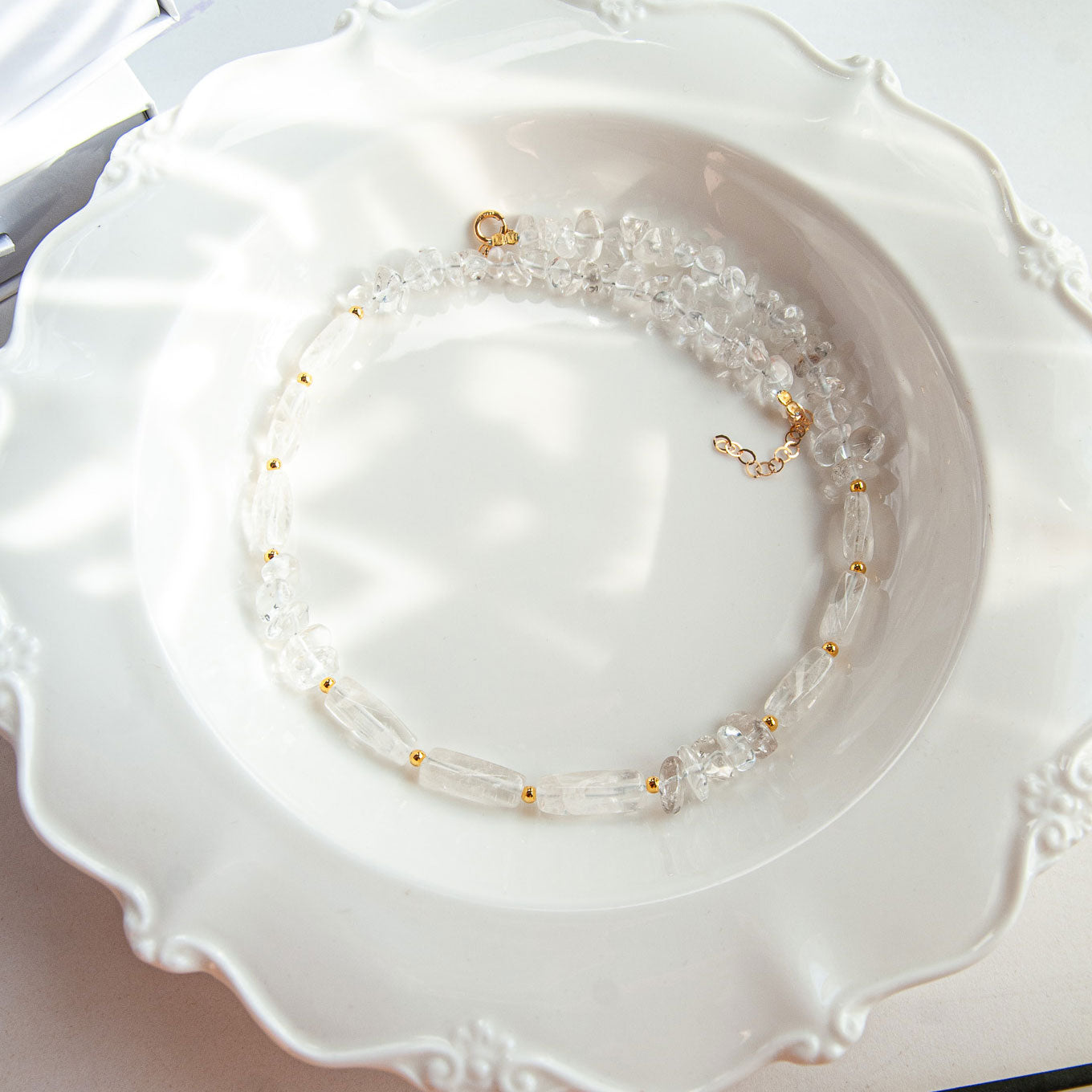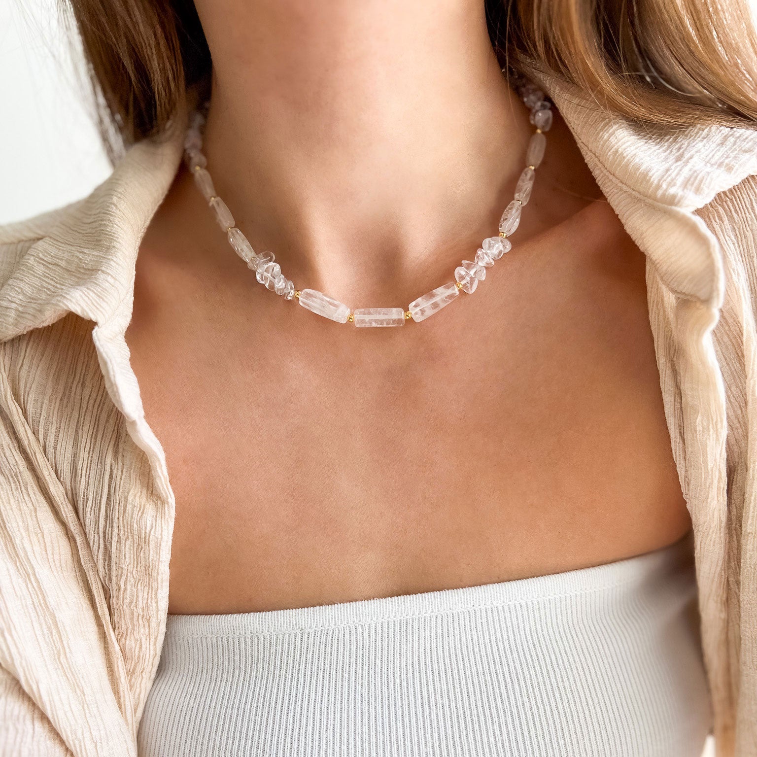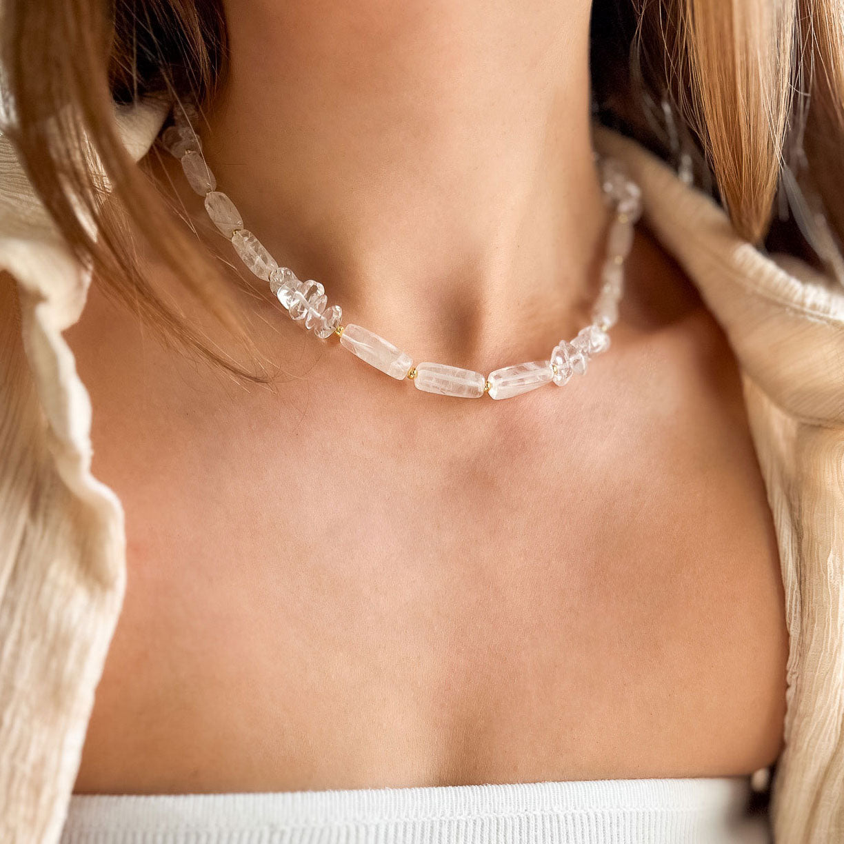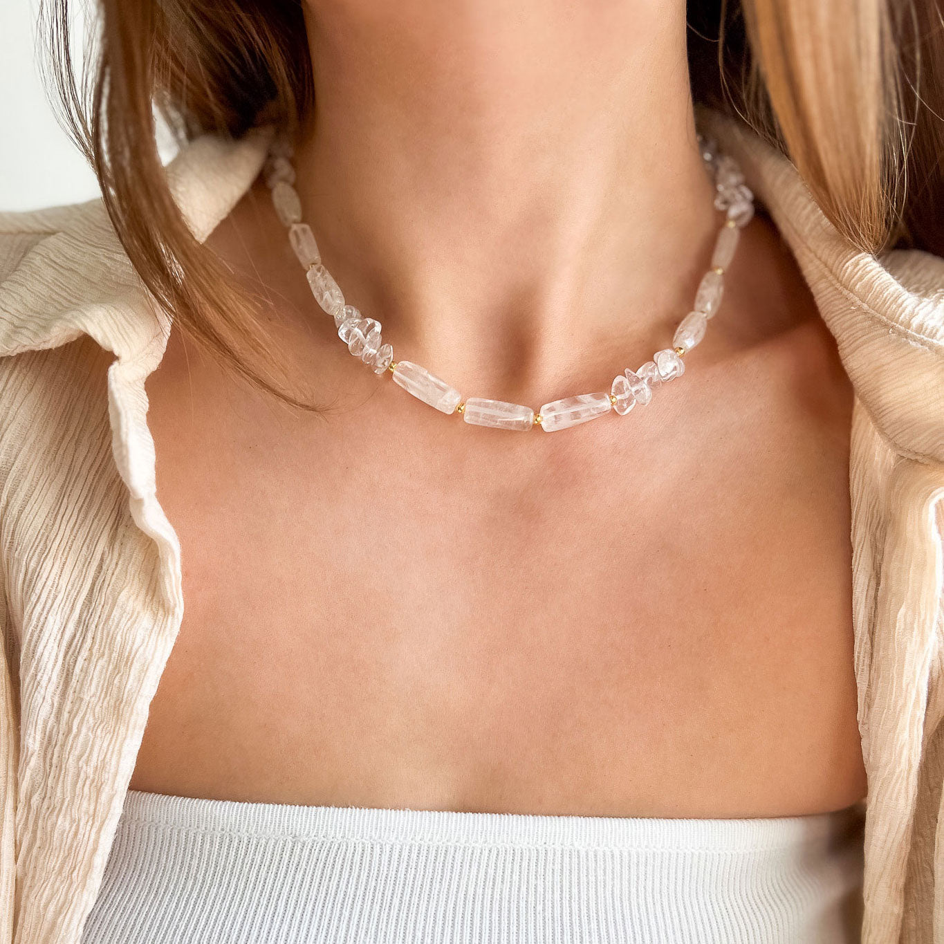 שרשרת בעבודת יד בשילוב אבני קוורץ שקופות בגדלים שונים, מעניקות מראה נקי, רך ומואר.