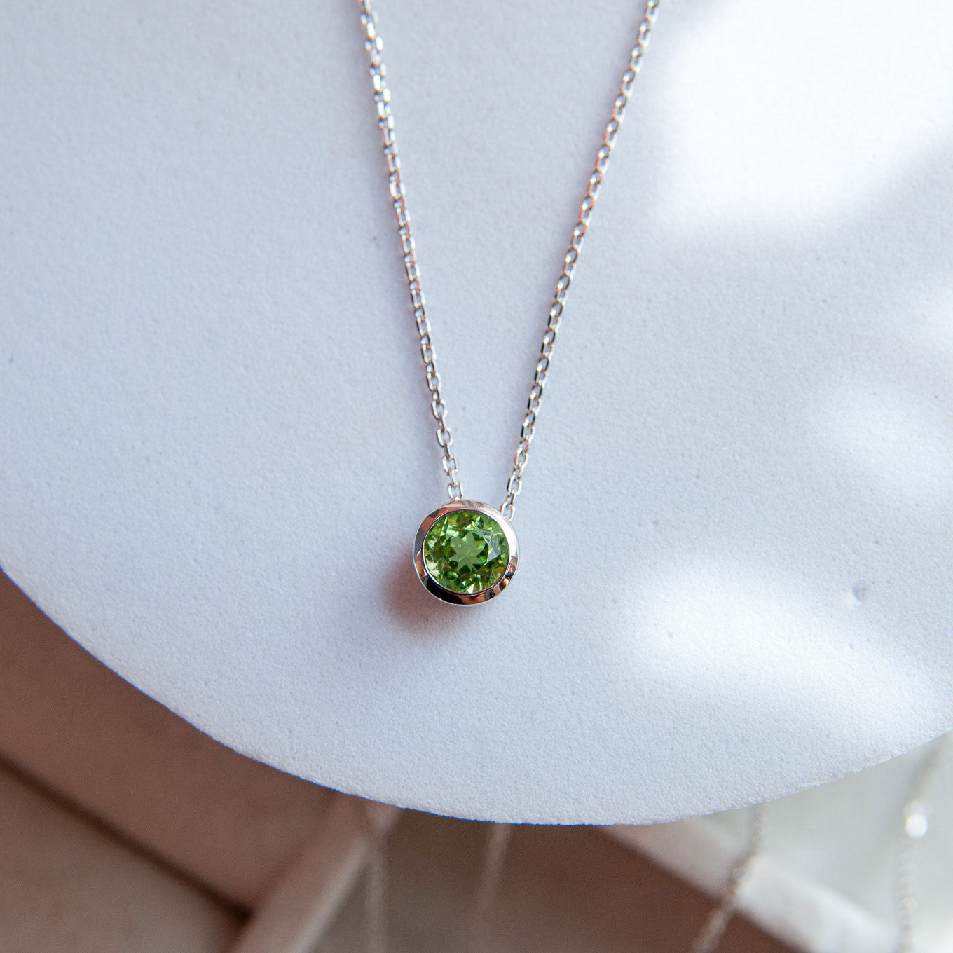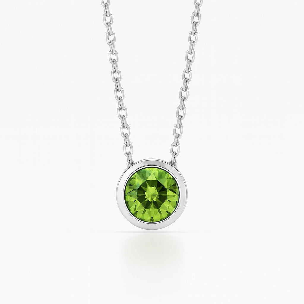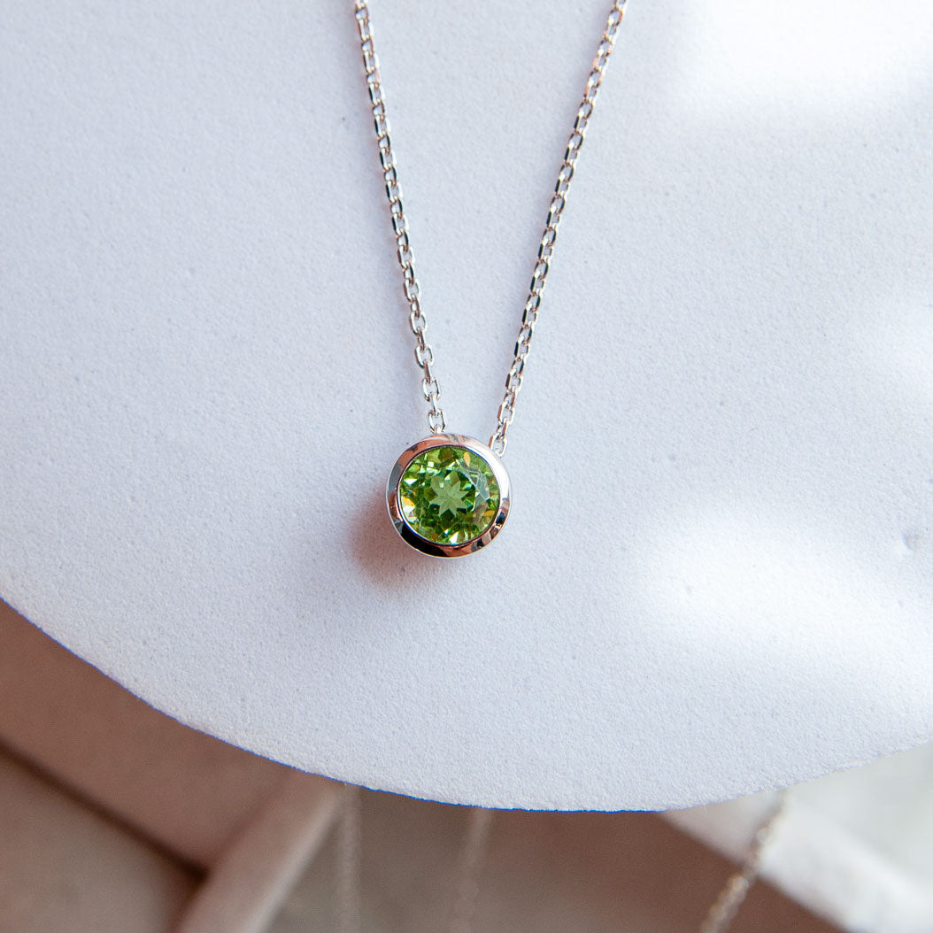 במרכזה תליון אלגנטי, משובץ באבן פרידוט טבעית בגוון ירוק רענן ומואר, שמעניק לשרשרת מראה ייחודי, נשי ומלא אנרגיה חיובית.