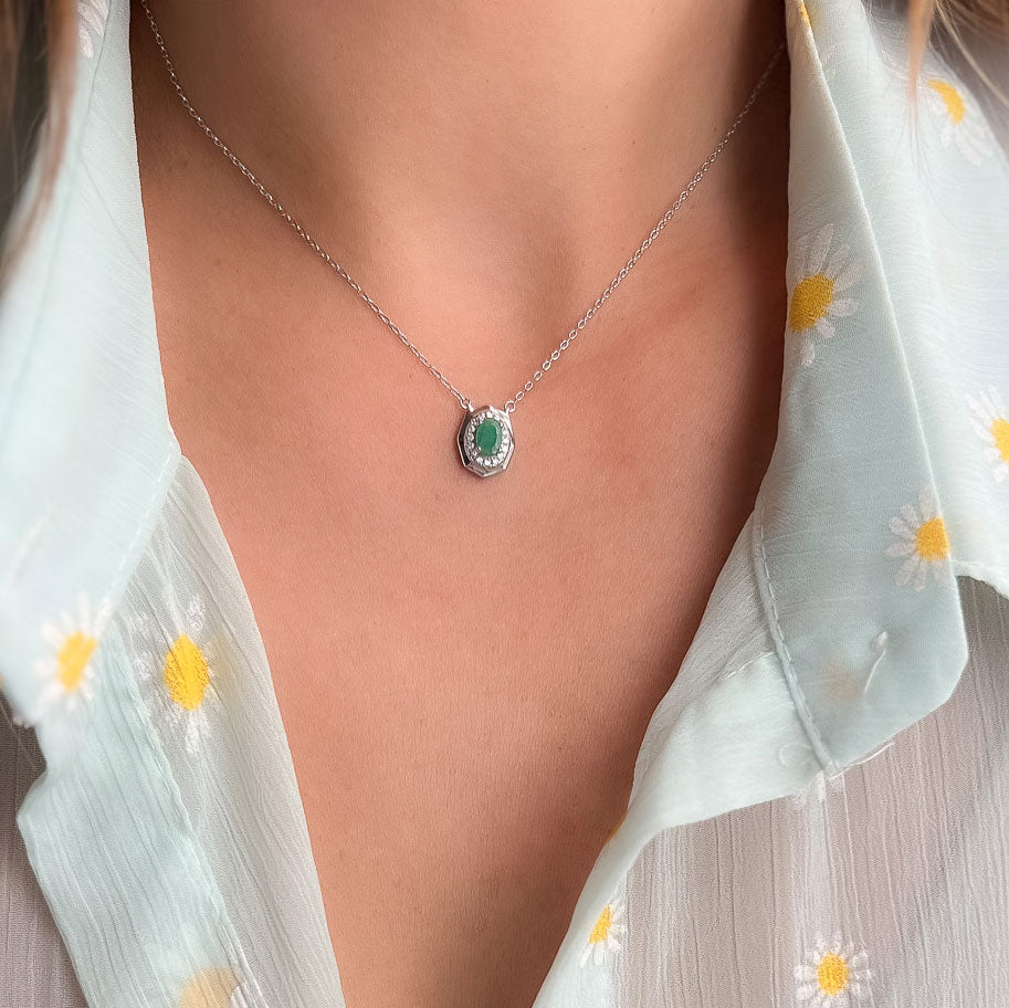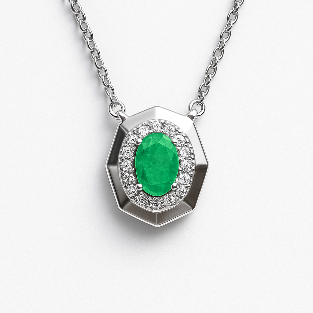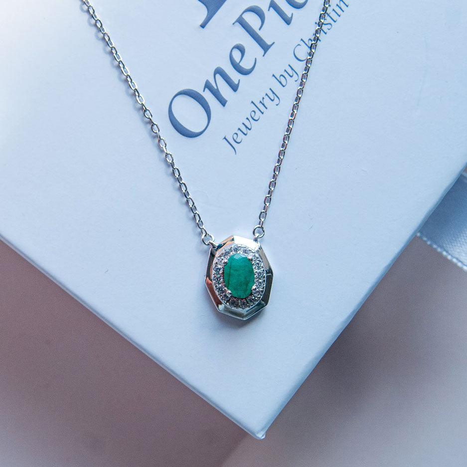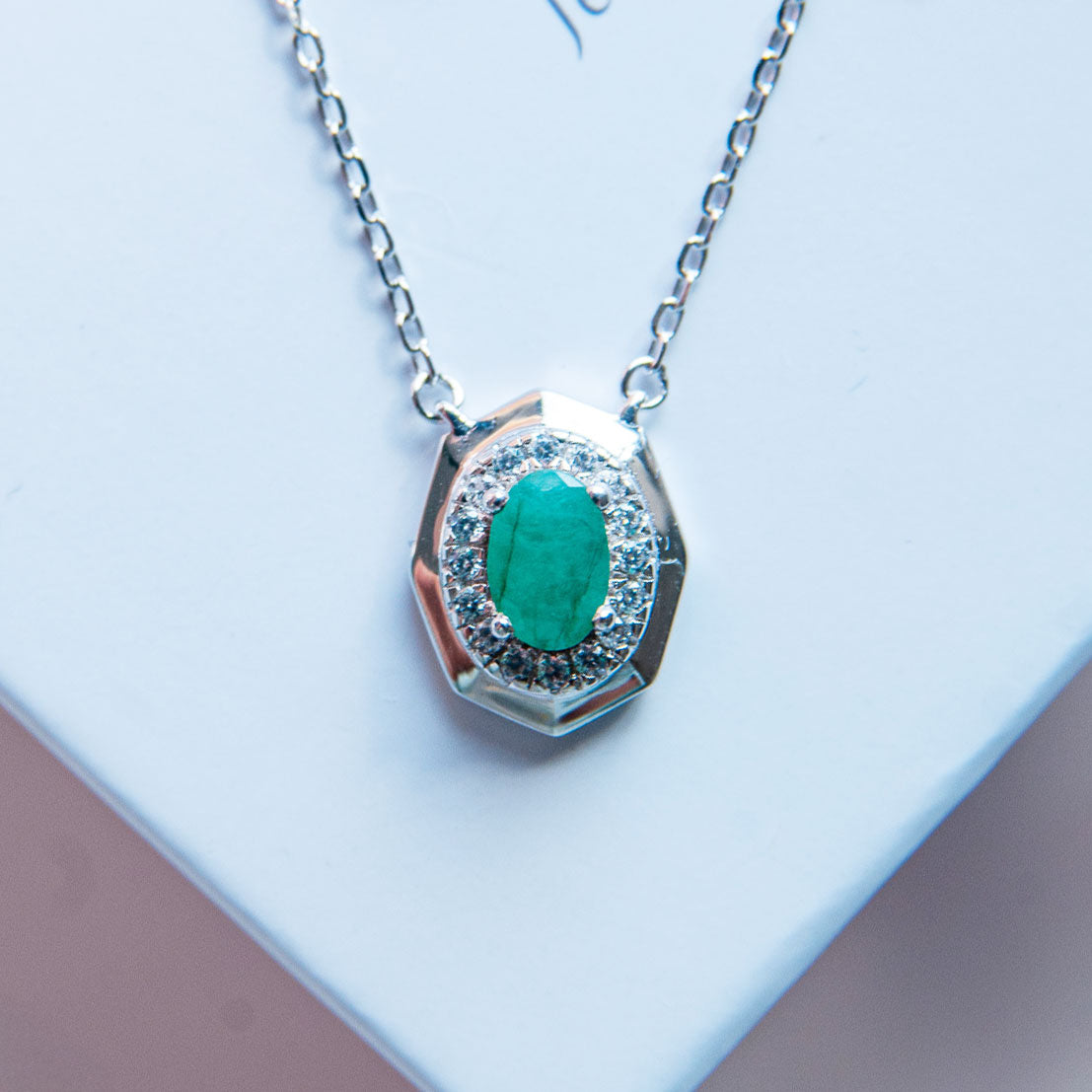 במרכזה תליון אלגנטי, משובץ באבן אמרלד טבעית בגוון ירוק עמוק ועשיר, ושיבוץ אבני זרקוני מסביב שמוסיף נגיעה יוקרתית ונצחית לכל הופעה.
