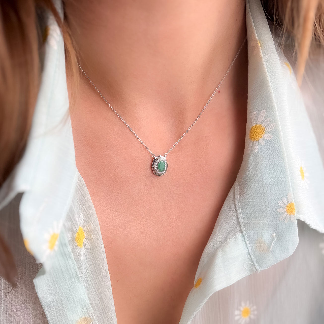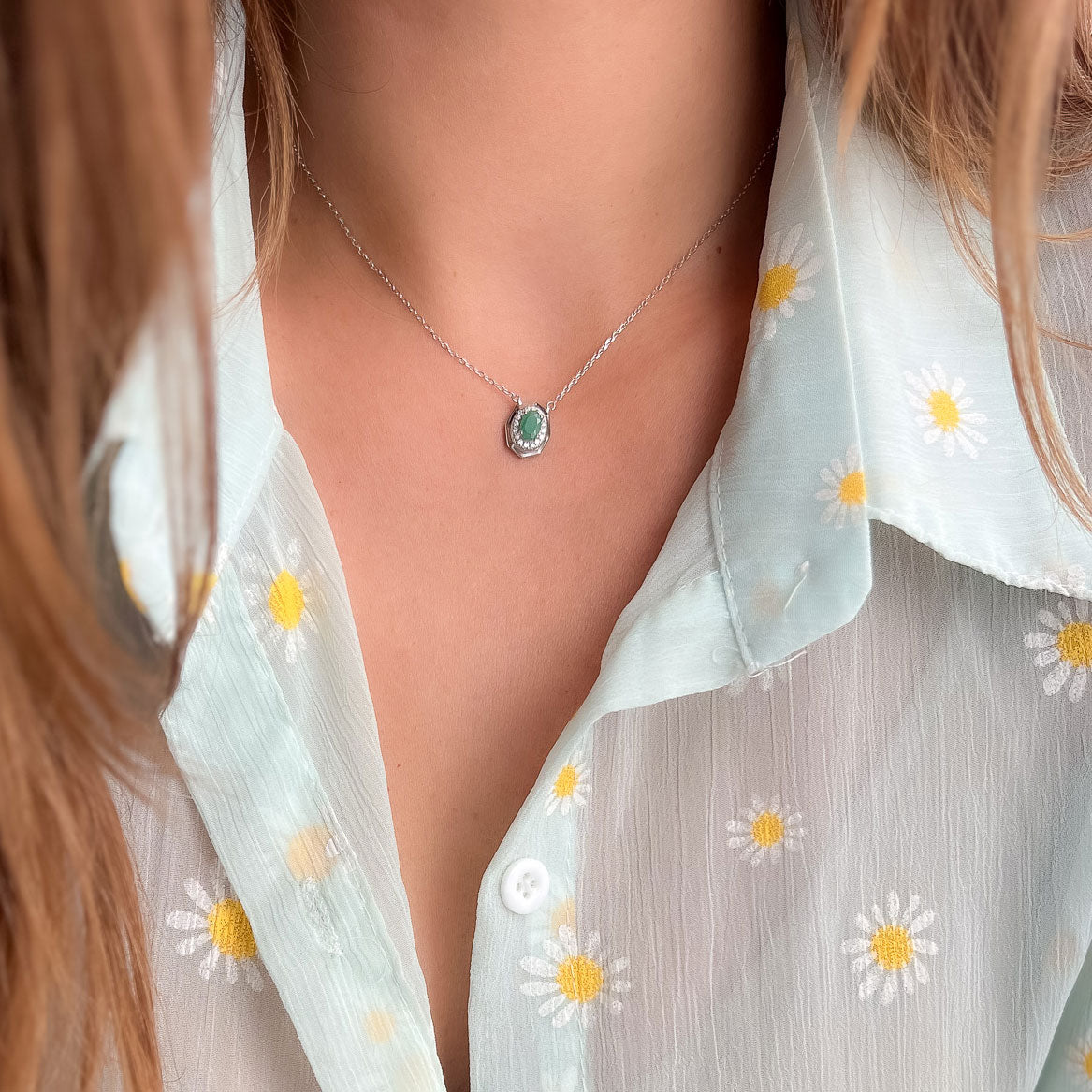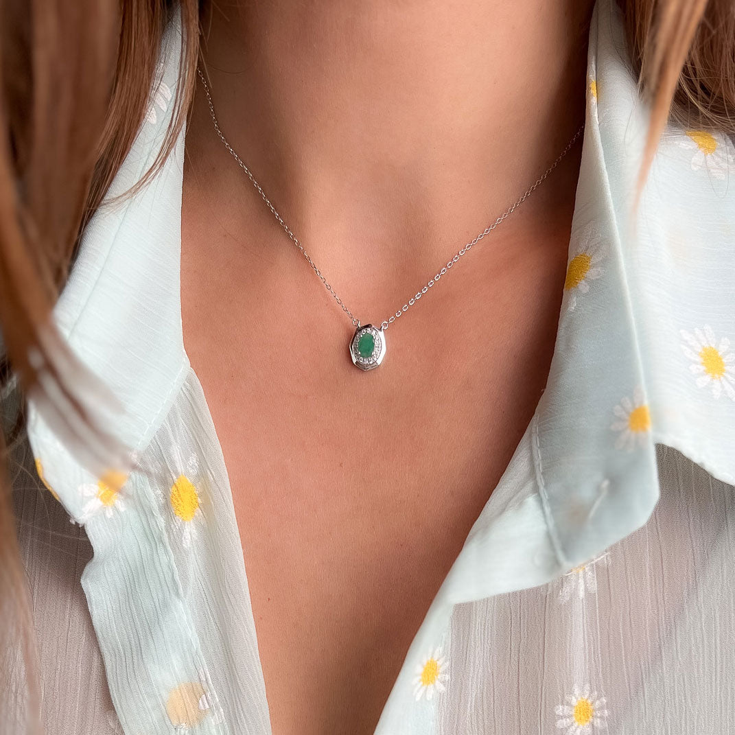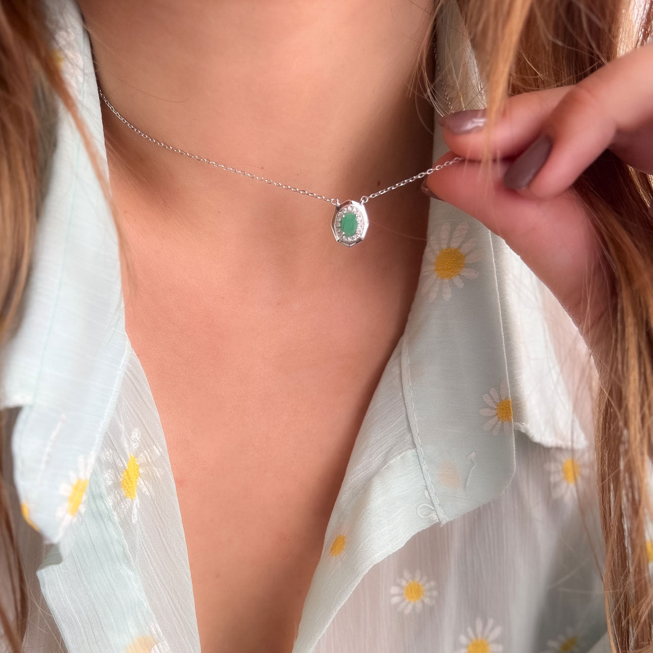 במרכזה תליון אלגנטי, משובץ באבן אמרלד טבעית בגוון ירוק עמוק ועשיר, ושיבוץ אבני זרקוני מסביב שמוסיף נגיעה יוקרתית ונצחית לכל הופעה.