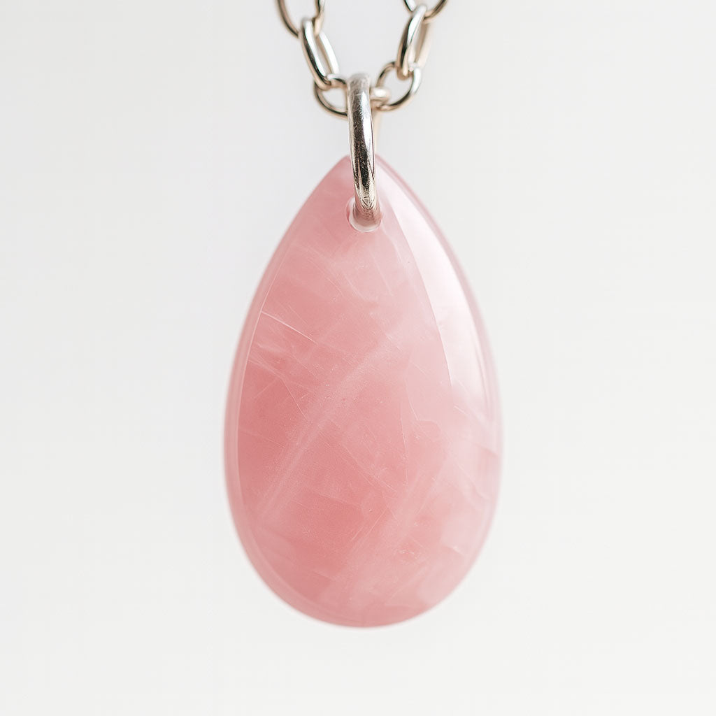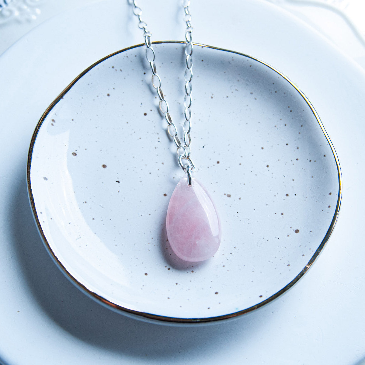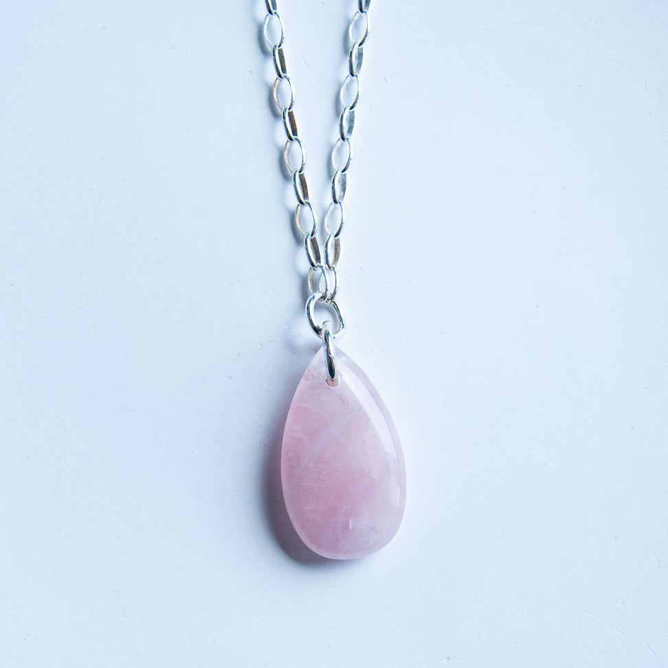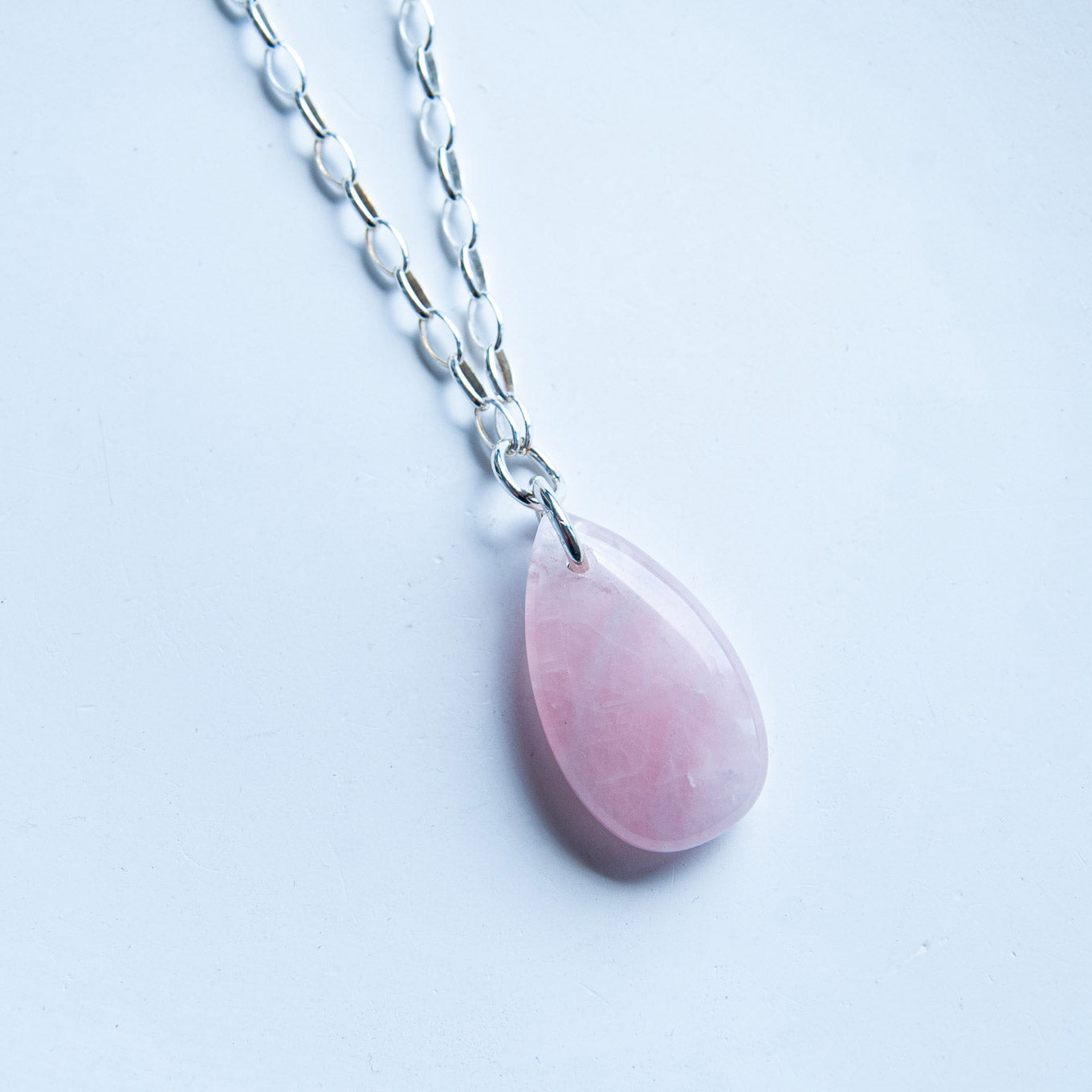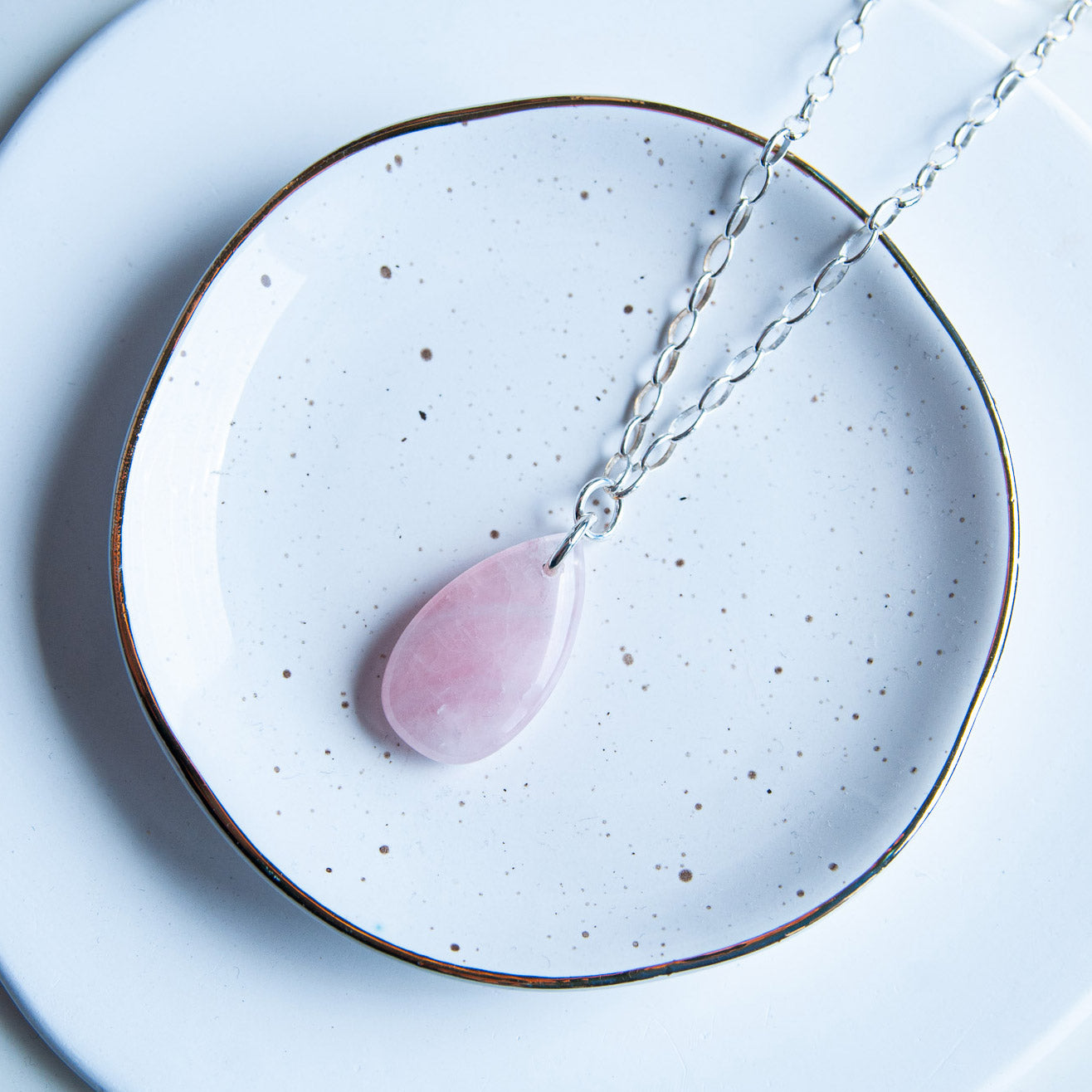 שרשרת אלגנטית ונשית, עשויה מכסף טהור 925 ומשובצת בתליון בצורת טיפה מאבן רוז קוורץ טבעית – בגוון ורוד רך ועדין.