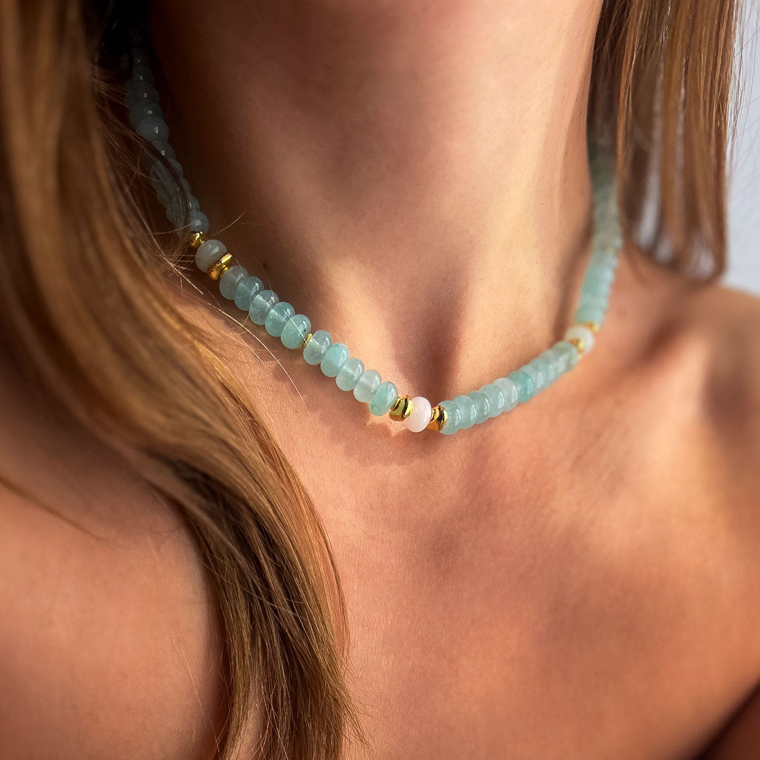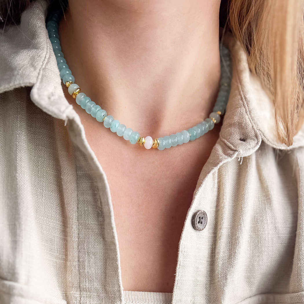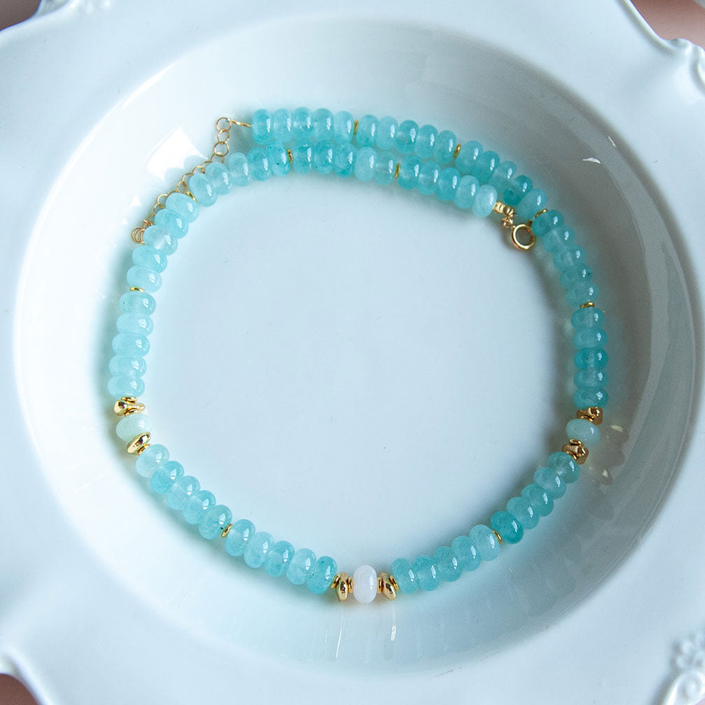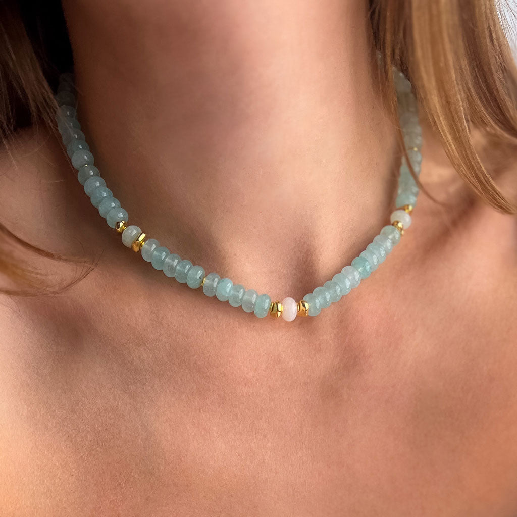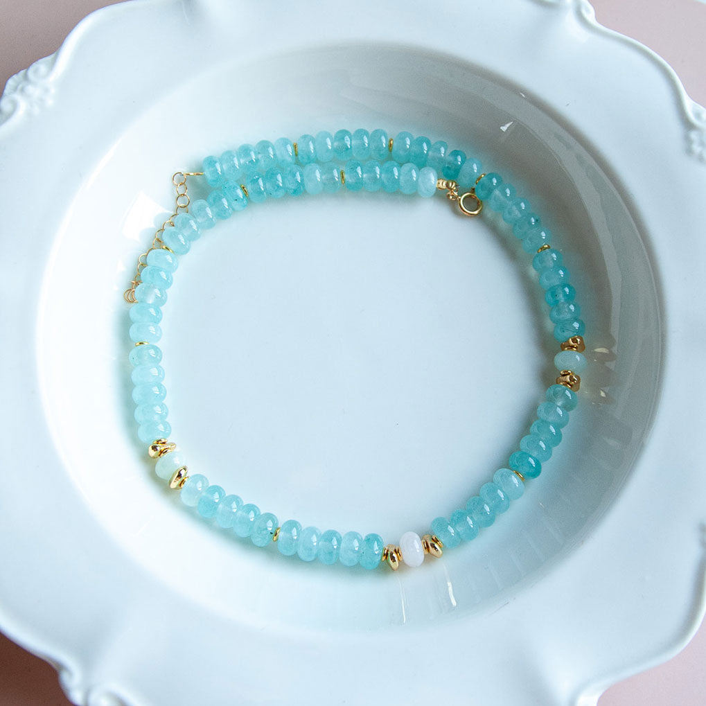שרשרת בעבודת יד מוקפדת, עשויה מאבני ג'ייד בגוון תכלת  עם שילוב חלקים בגולדפילד וציפוי זהב.