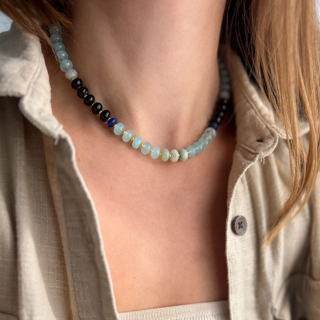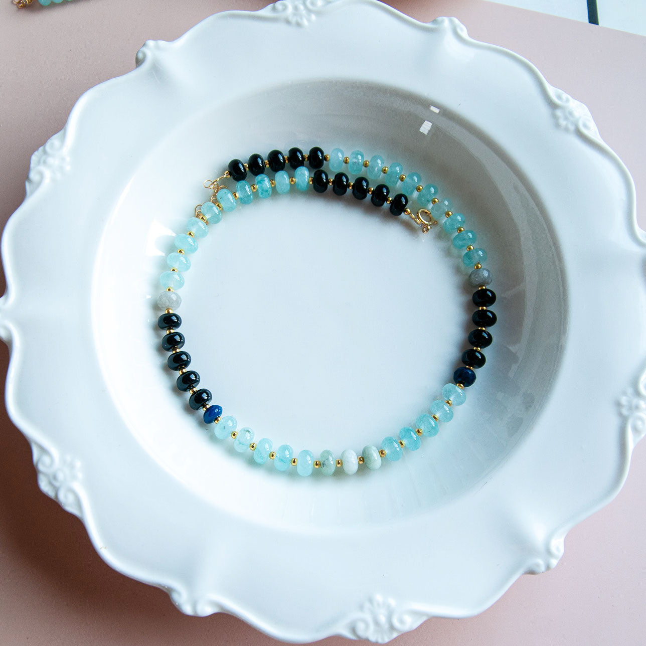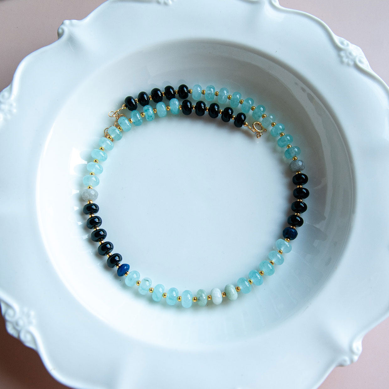 שרשרת בעבודת יד מוקפדת, עשויה מאבני ג'ייד בגוון תכלת ואבני אוניקס שחור. עם שילוב חלקים בגולדפילד.