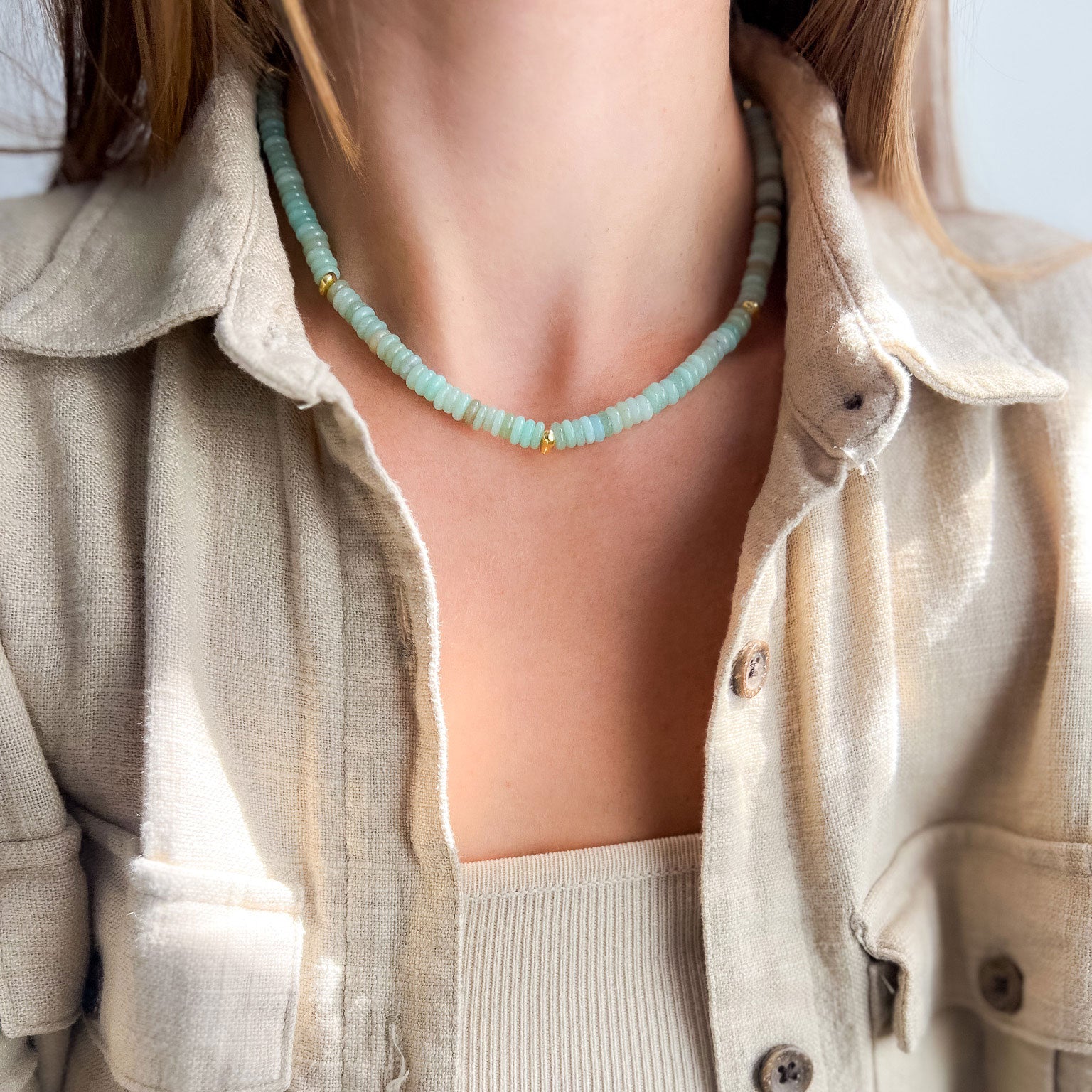 שרשרת בעבודת יד מוקפדת, עשויה מאבני אמזונייט טבעיות. עם שילוב חלקים בציפוי זהב.