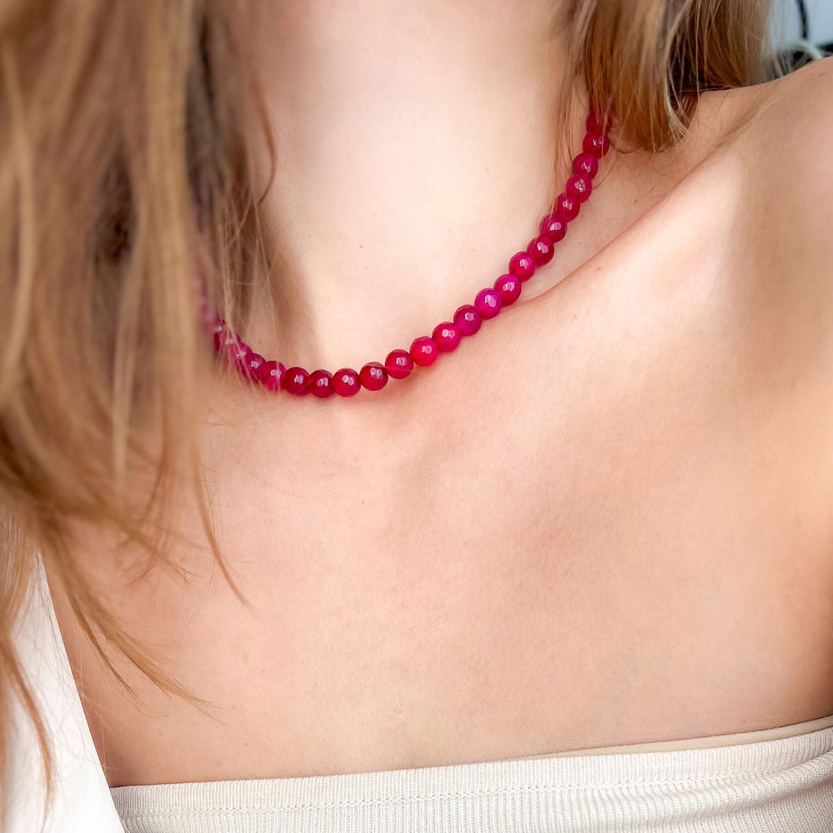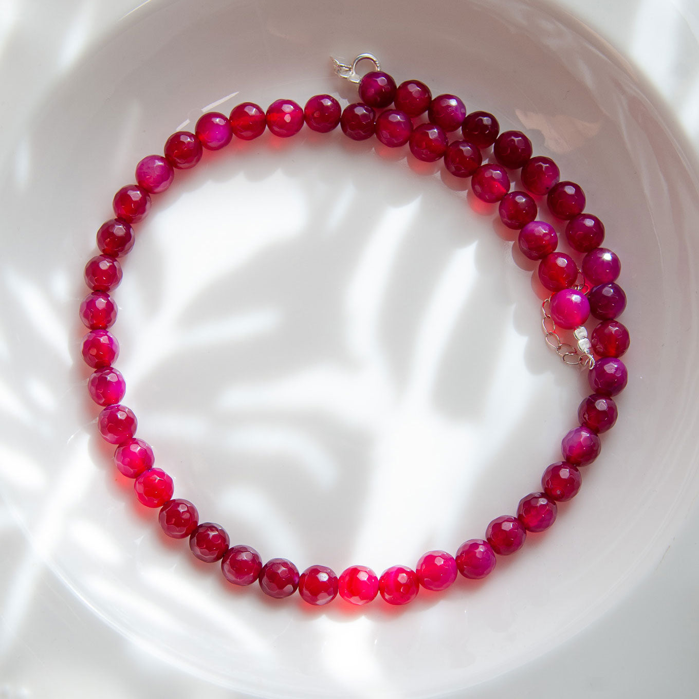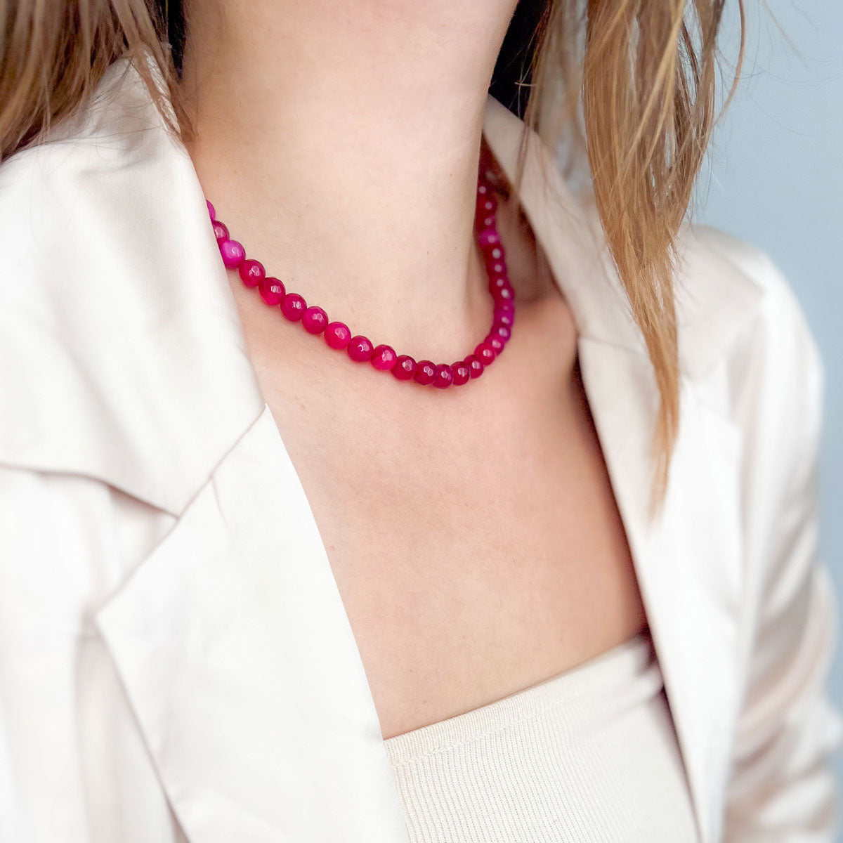 שרשרת בעבודת יד מוקפדת, עשויה מאבני אגת טבעיות בגוון ורוד פוקסיה עז ומלא חיים.