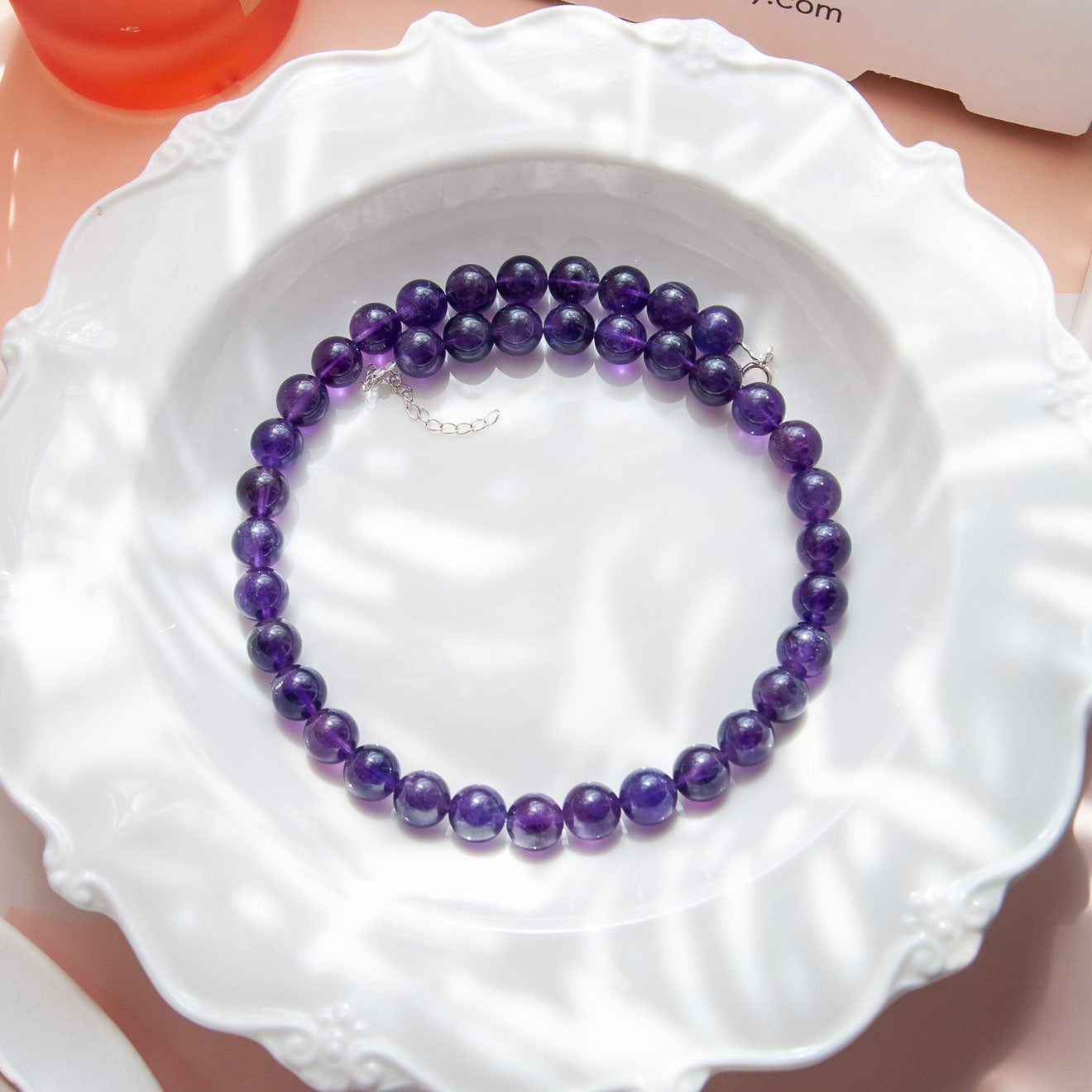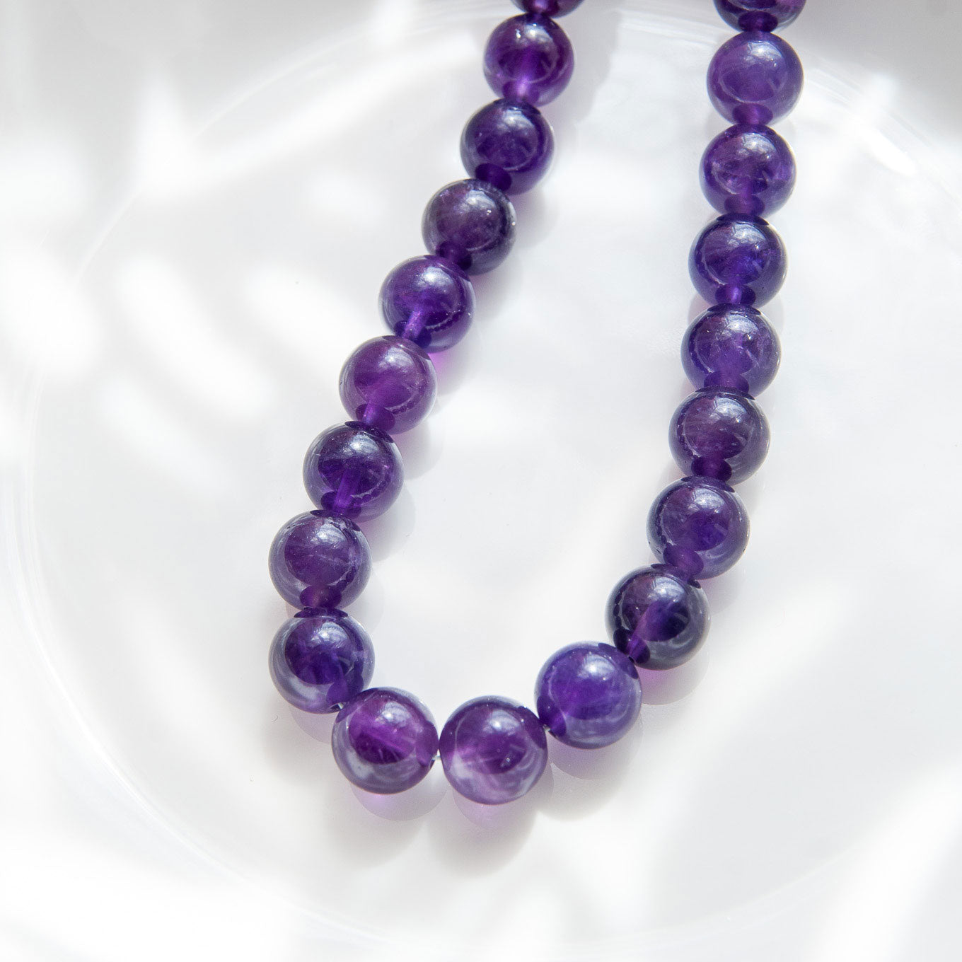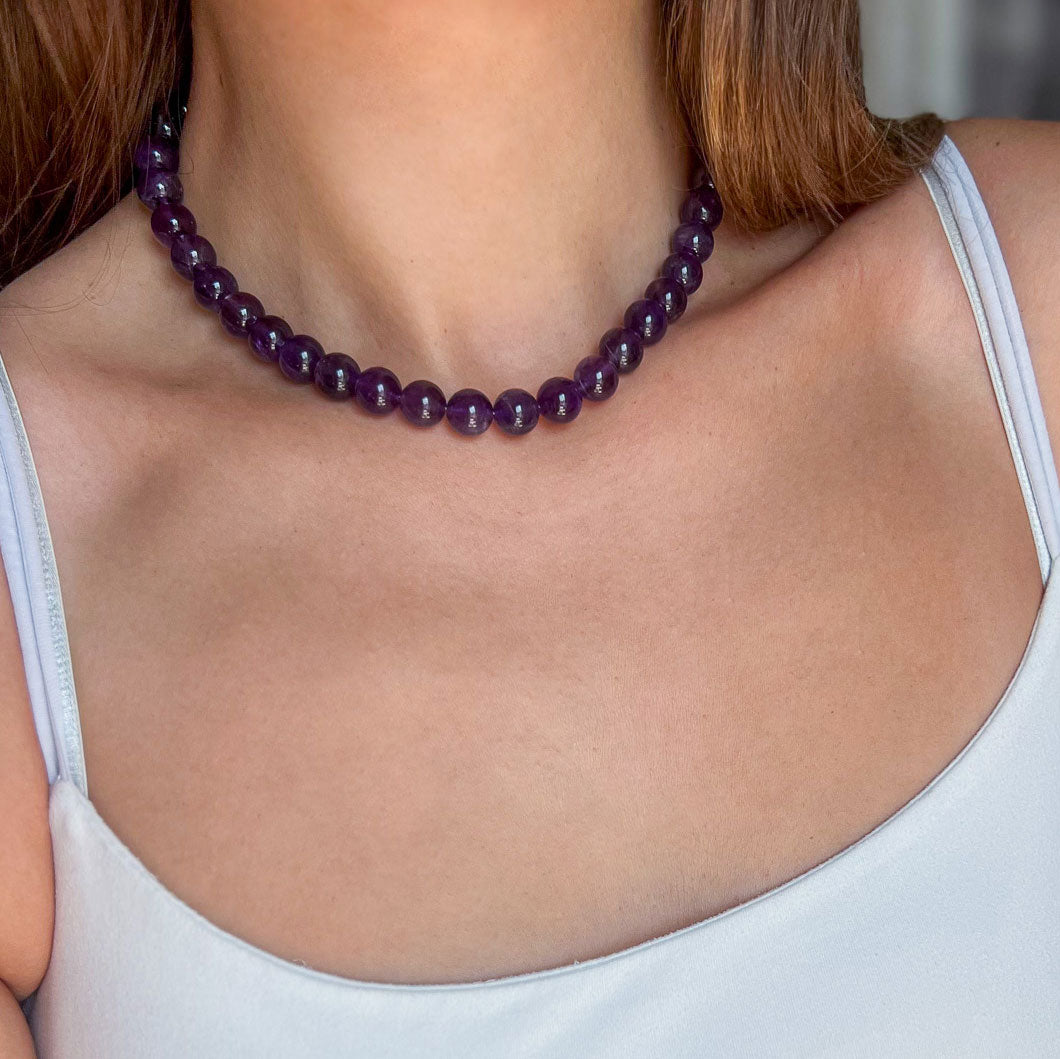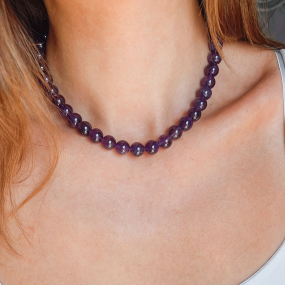 שרשרת אלגנטית ומלאת נוכחות, עשויה אבני אמטיסט טבעיות בגוון סגול כהה ועשיר, בקוטר 10 מ"מ. העומק של צבע האבן מעניק לתכשיט מראה יוקרתי, מסתורי וייחודי שמתאים לכל סגנון מהיומיומי ועד לאירוע חגיגי.