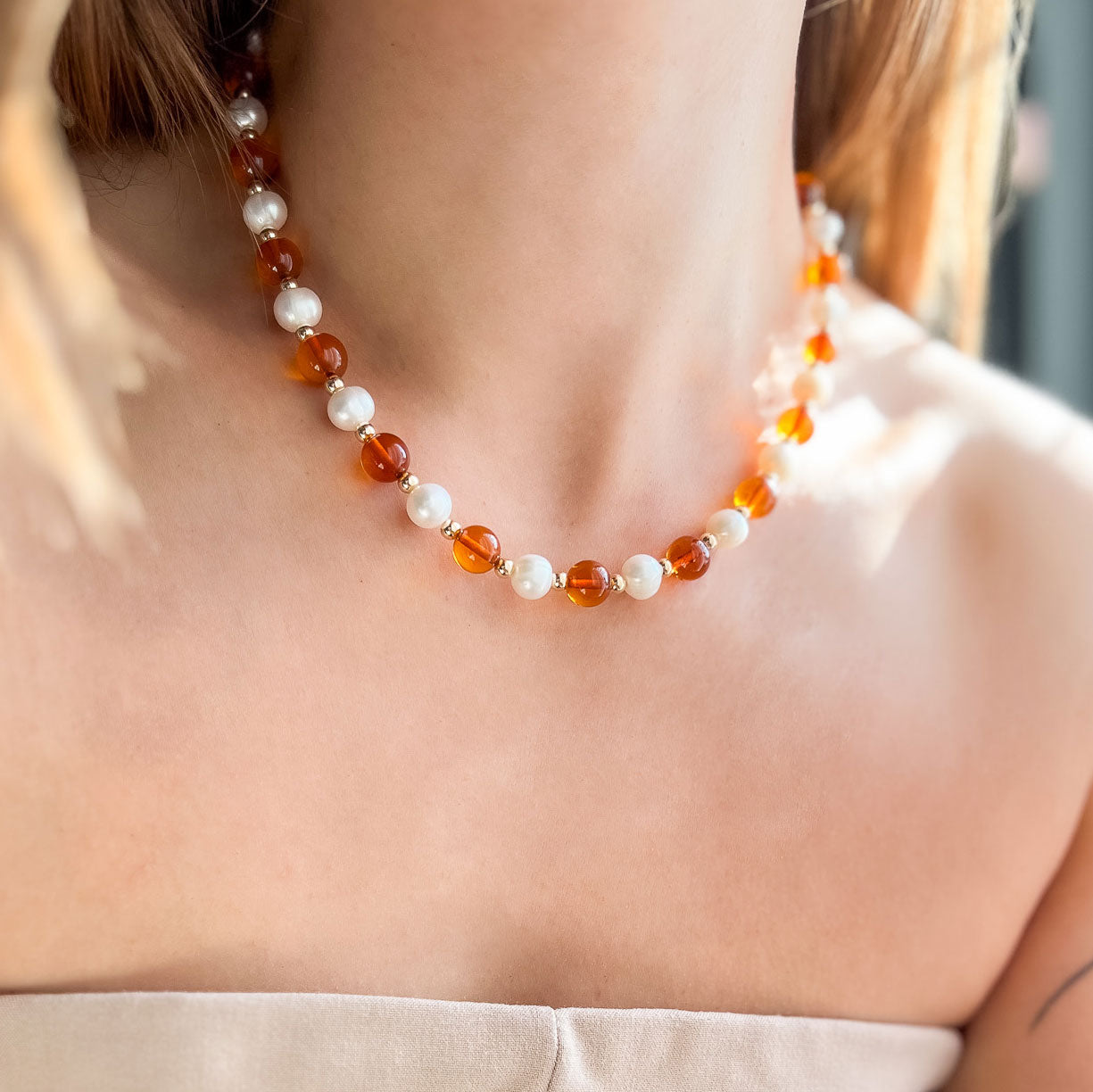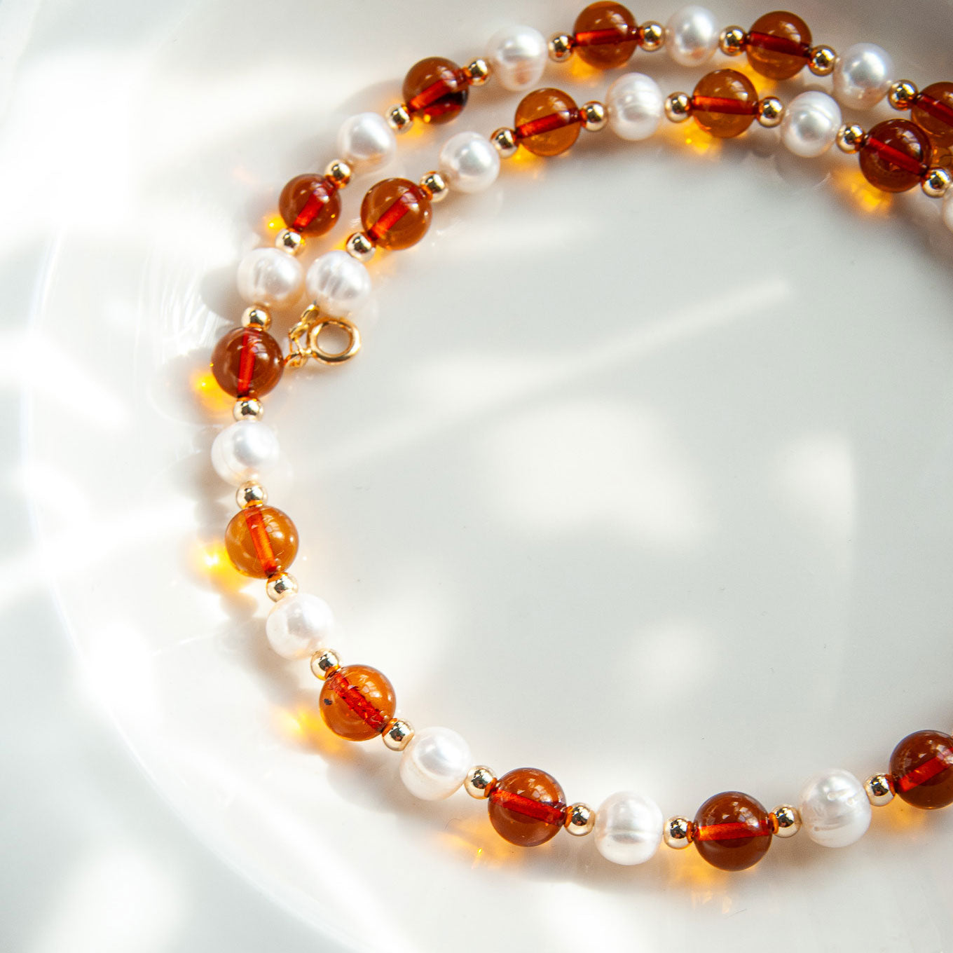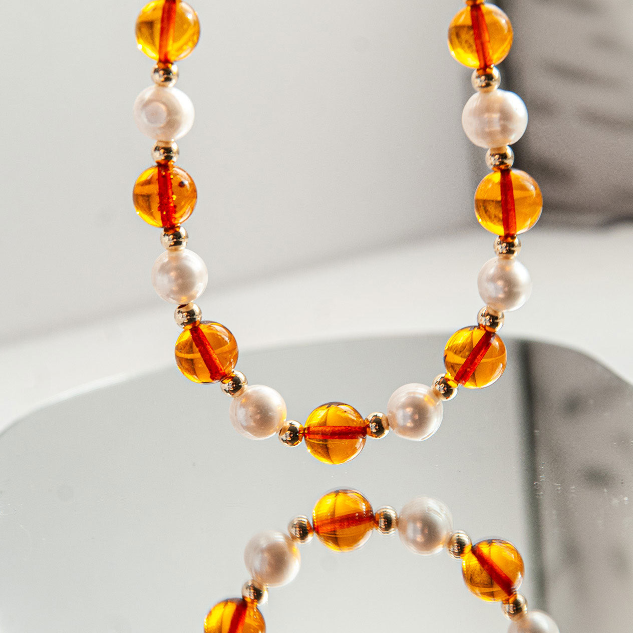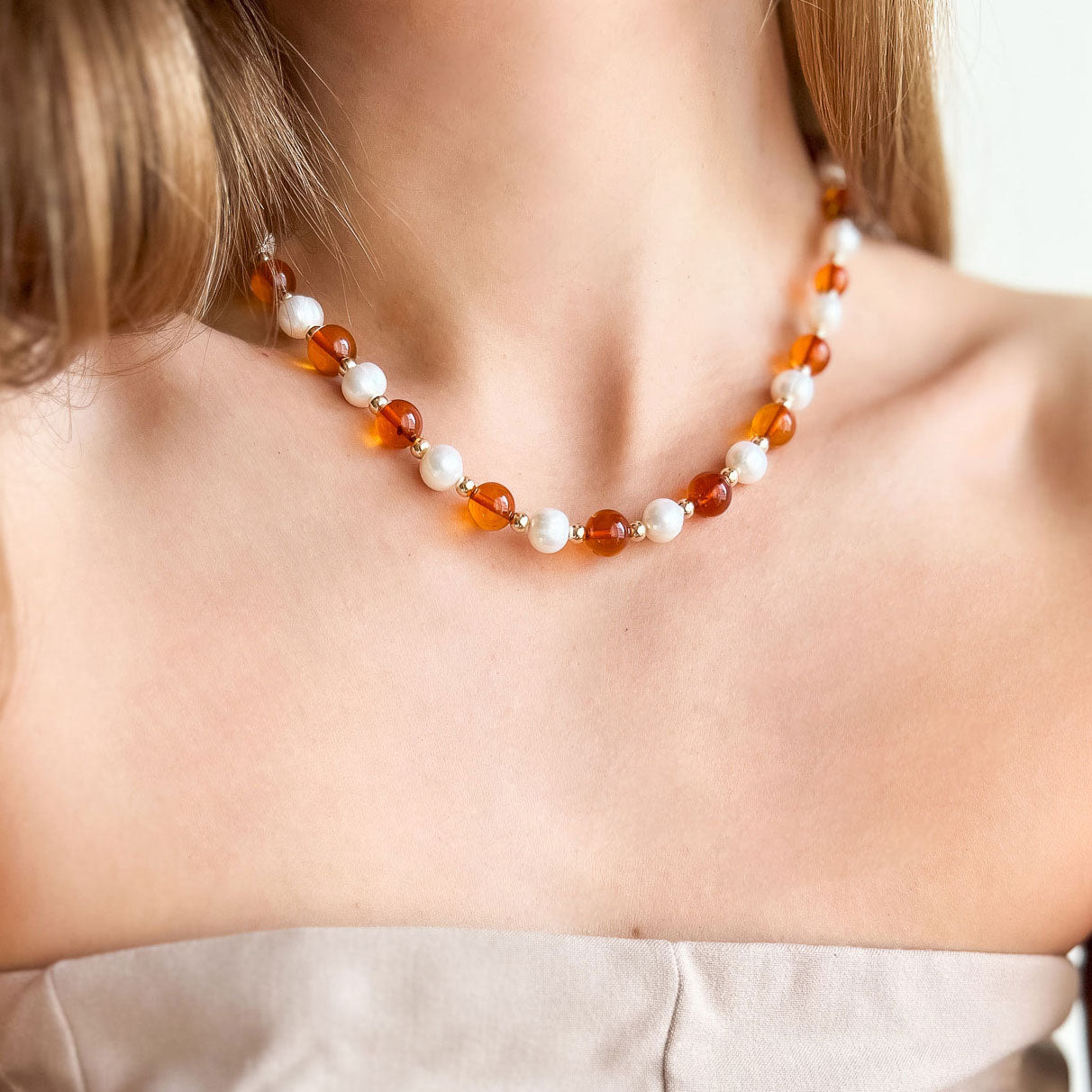 שרשרת ייחודית בעבודת יד קפדנית, עשויה מפניני מים מתוקים לבנים באיכות גבוהה, המשולבים עם אבני ענבר טבעיות וכדורי גולדפילד בגוון זהב חמים. השילוב בין המרקמים והגוונים יוצר מראה אלגנטי, נשי ועל-זמני – תכשיט קלאסי שישתלב עם כל סגנון לבוש ויראה נפלא בכל עונה.
