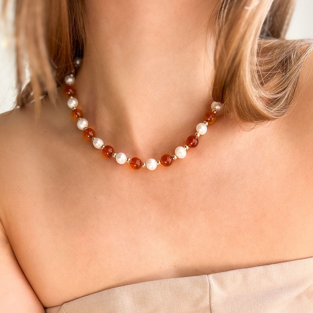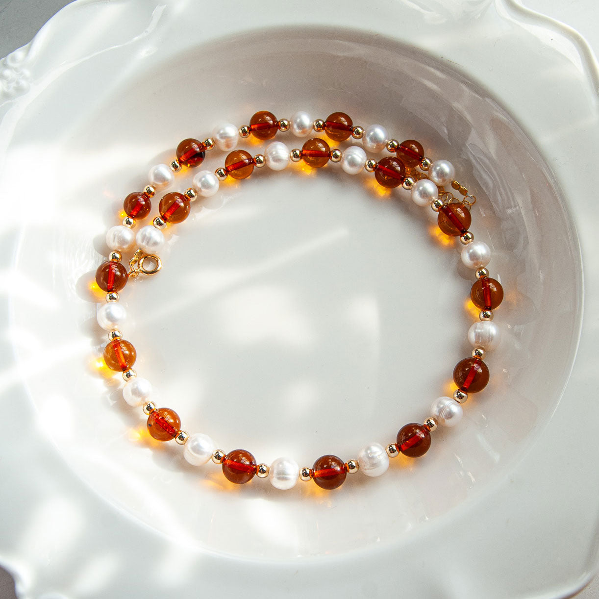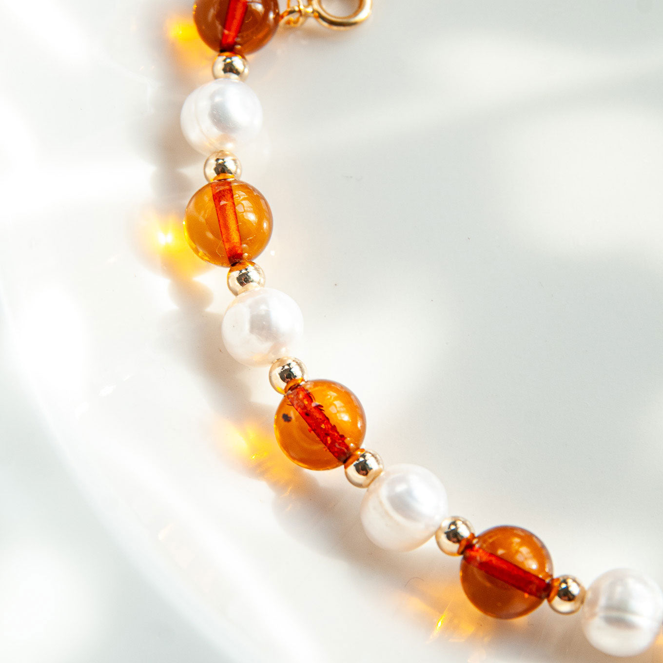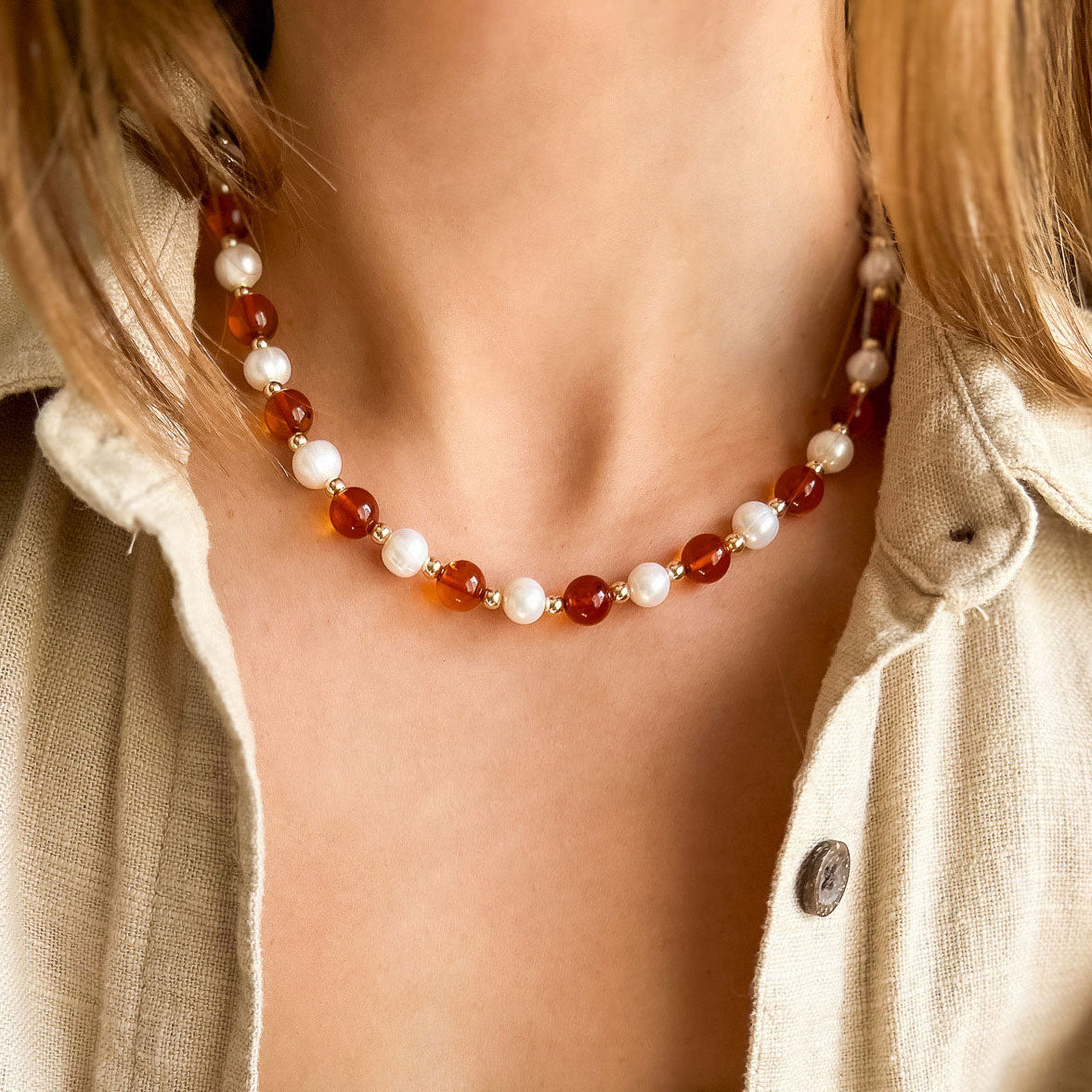 שרשרת ייחודית בעבודת יד קפדנית, עשויה מפניני מים מתוקים לבנים באיכות גבוהה, המשולבים עם אבני ענבר טבעיות וכדורי גולדפילד בגוון זהב חמים. השילוב בין המרקמים והגוונים יוצר מראה אלגנטי, נשי ועל-זמני – תכשיט קלאסי שישתלב עם כל סגנון לבוש ויראה נפלא בכל עונה.