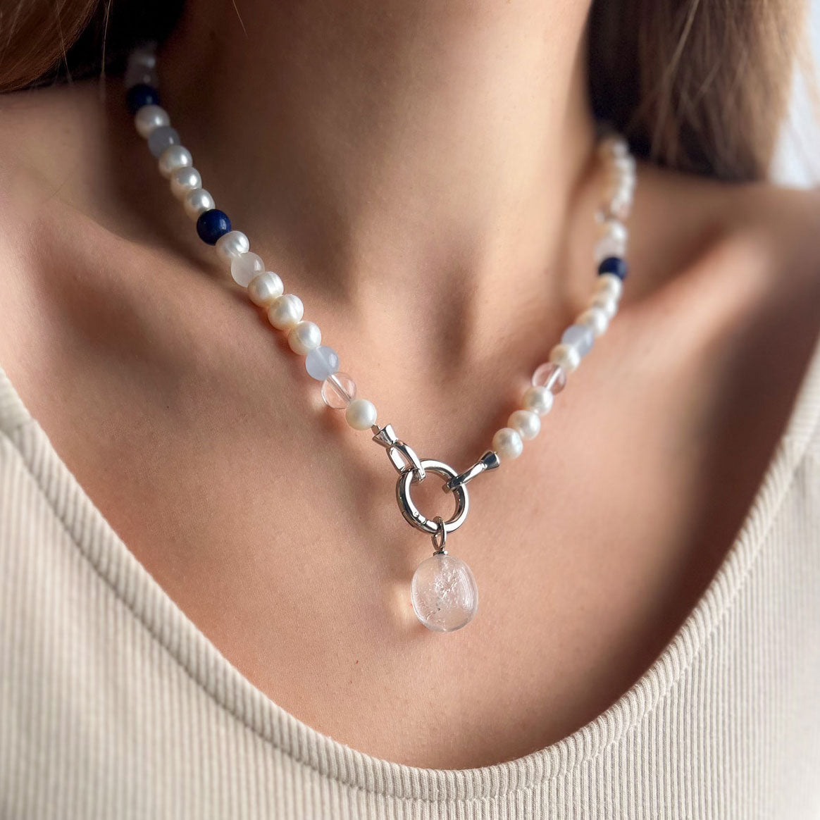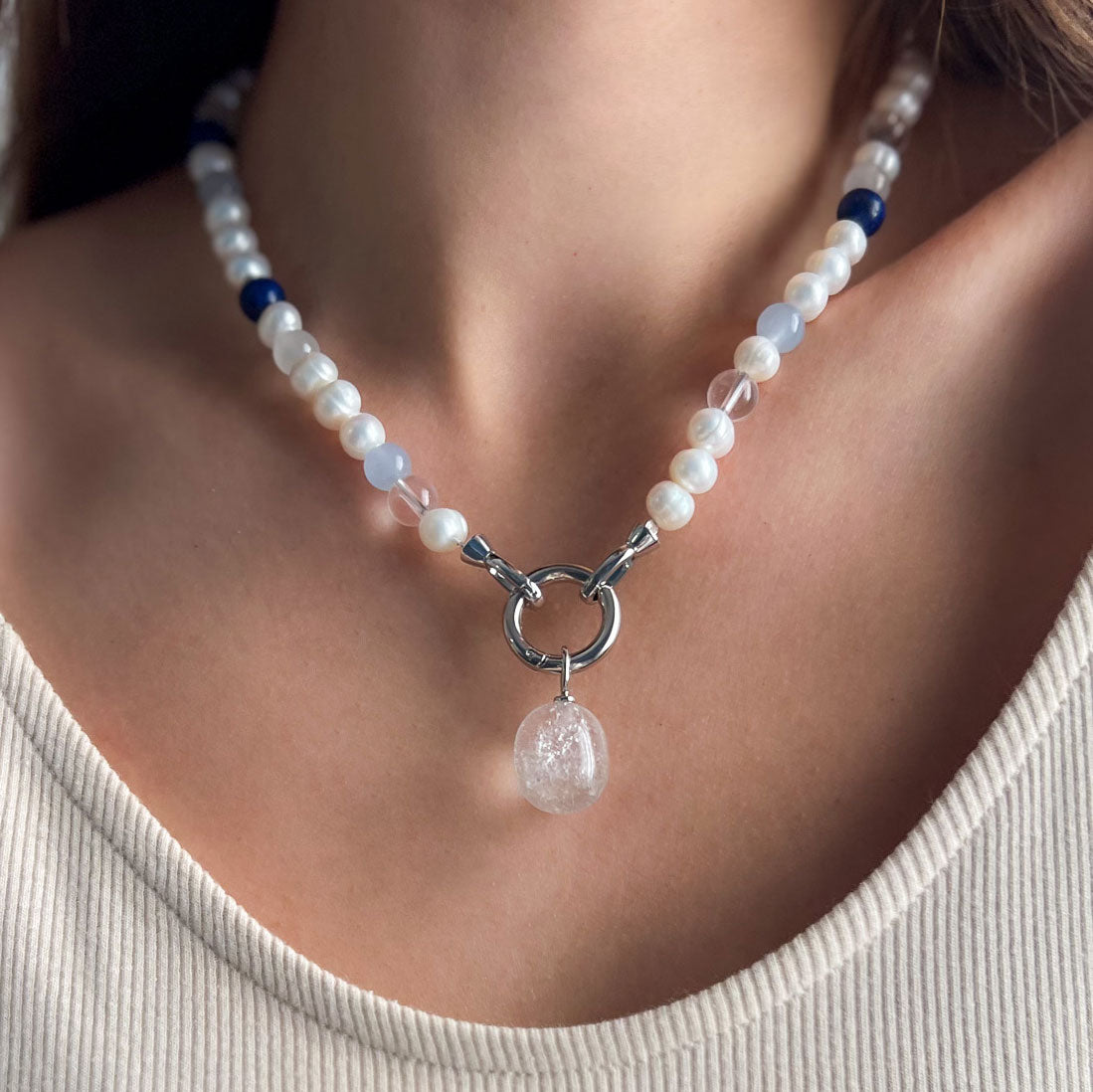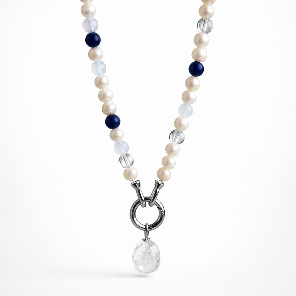 שרשרת בעבודת יד המשלבת פנינים טבעיות עם אבני אגט ו־קריסטל קוורץ, ליצירת מראה נקי, הרמוני ואלגנטי. שילוב האבנים מעניק לשרשרת עומק ותחושת איזון, עם נוכחות עדינה אך מורגשת.